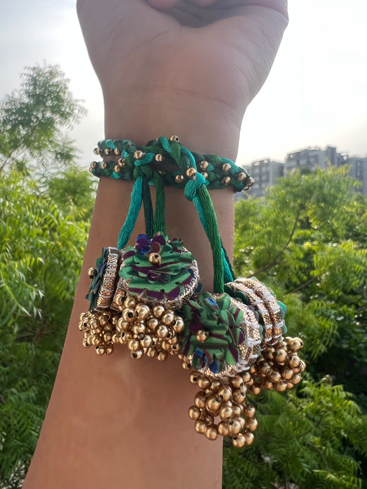 Joker Poker Rakhi set: Bottle Green + Pink Navratna Patola