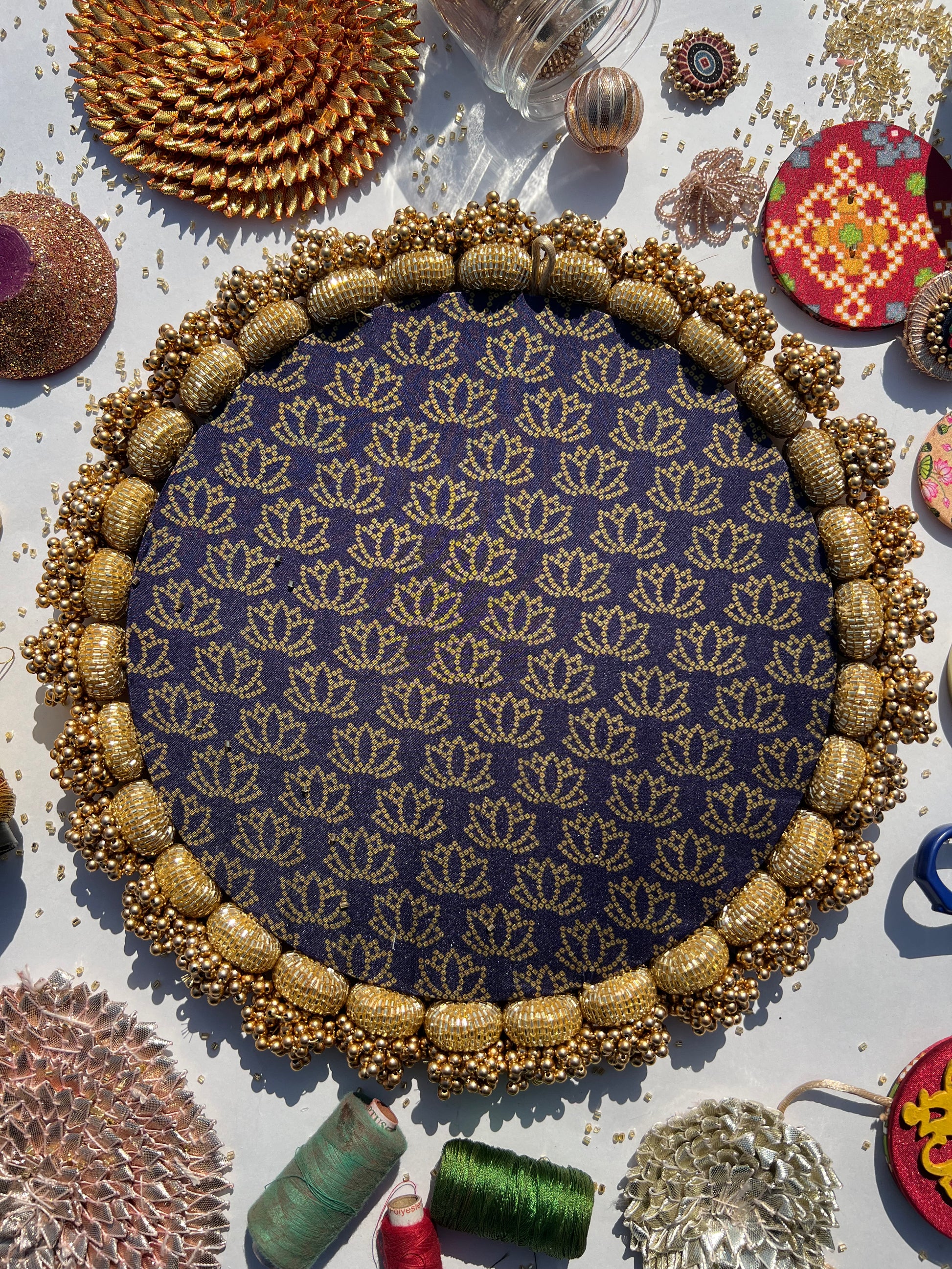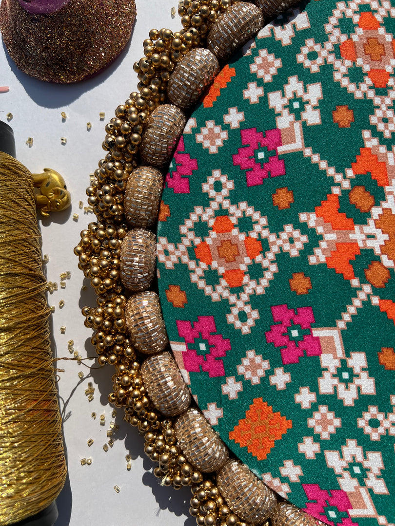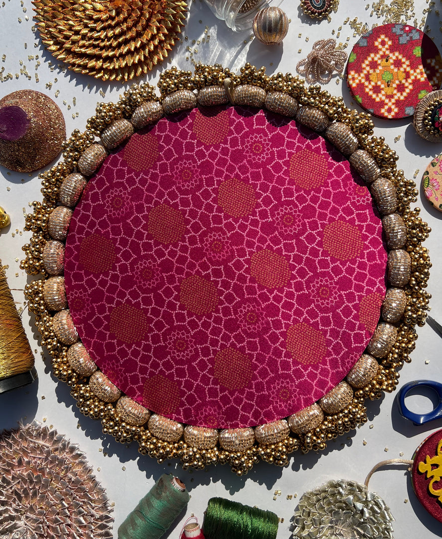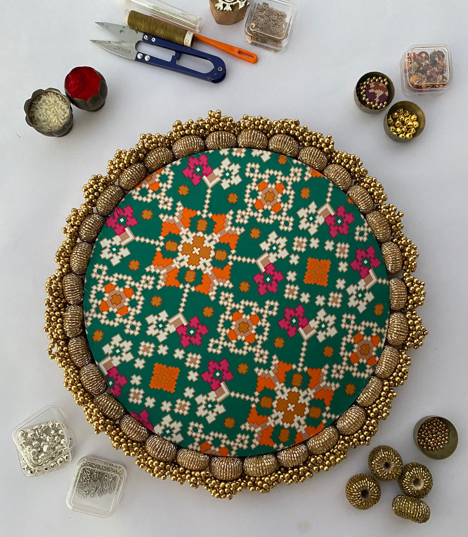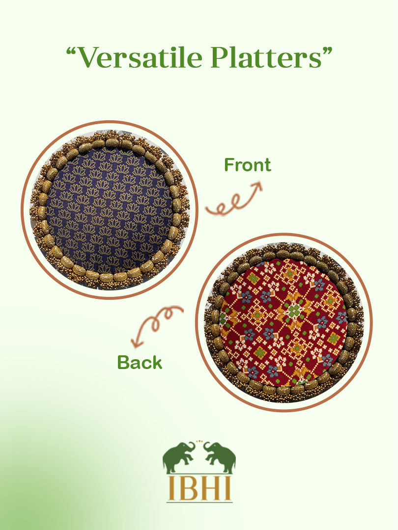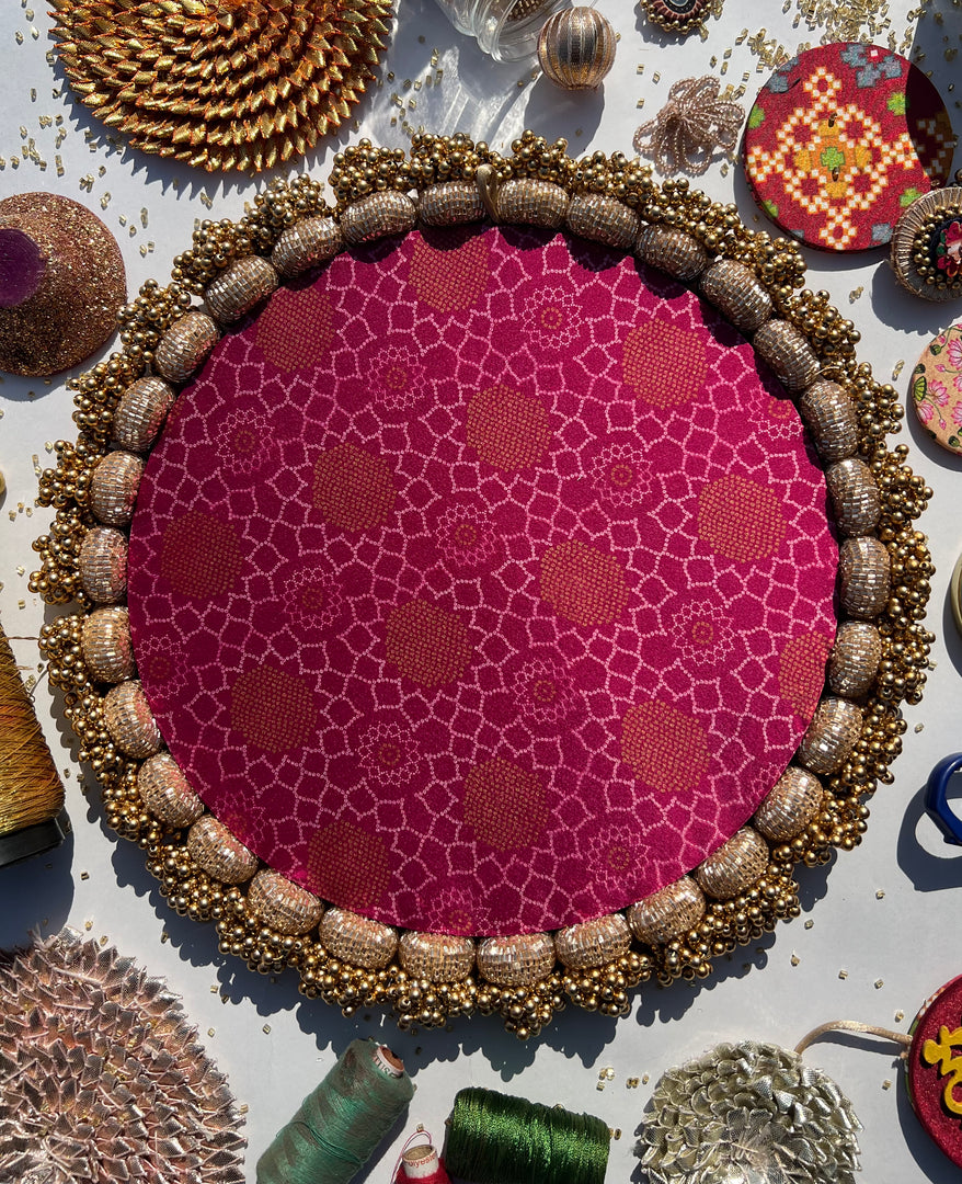 DETAILS IN DETAIL: this rangoli is a versatile platter with a solid base of 10 inches diameter, covered in two different heritage prints- Bandhej & Pichwai. This means you can use this rangoli on both sides in multiple ways. The rangoli is tasseled with 30 wooden base tyre-shaped spheres which are wrapped with yellowish gold cylindrical acrylic beads. Each embellished bead has a bunch of 85 matt finish dull-golden beads of 5mm diameter. Including all the details of the tassels, total diameter of the rangoli is 13 inches. Each rangoli has a small loop made using silk chandan thread, which is small enough to not be visible but strong enough to hold the entire rangoli when hung on a wall as decor. Flat on a surface or suspended on a wall, this rangoli is ultra versatile.