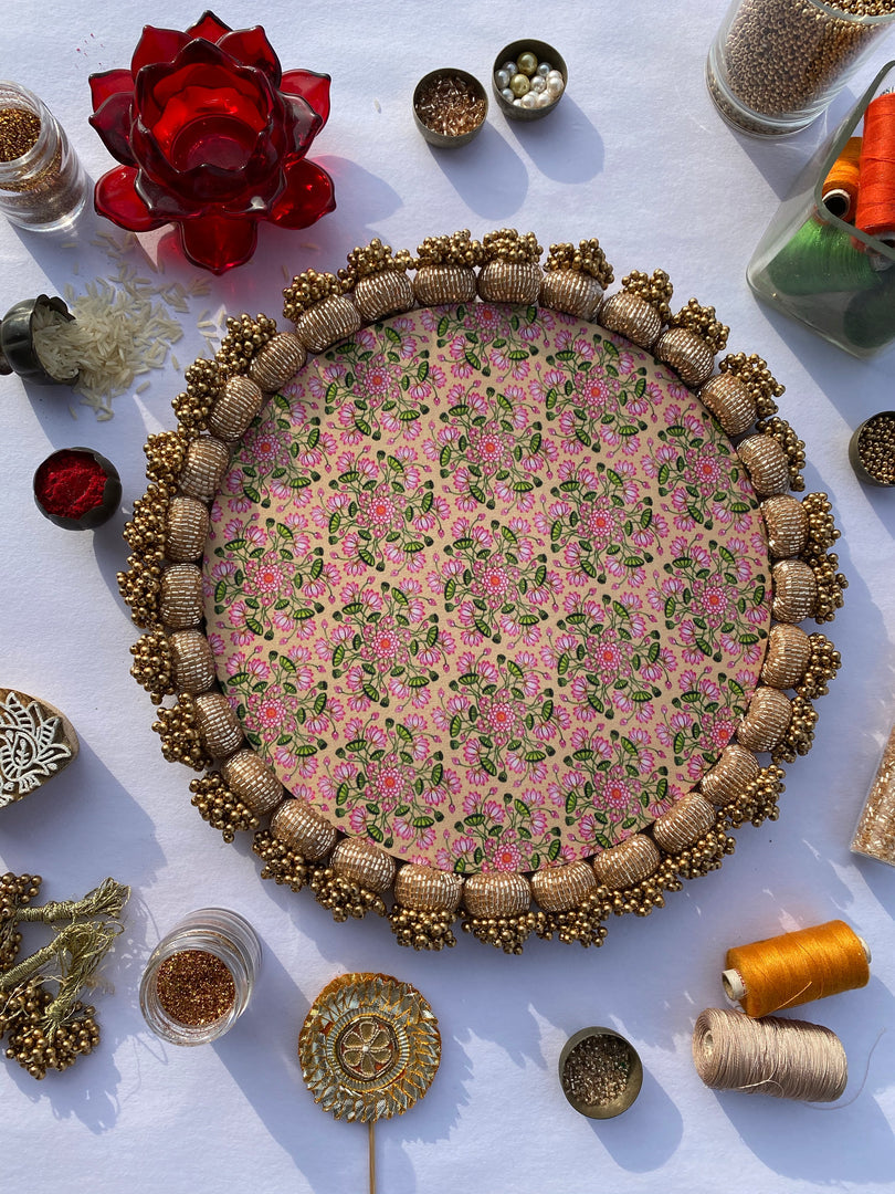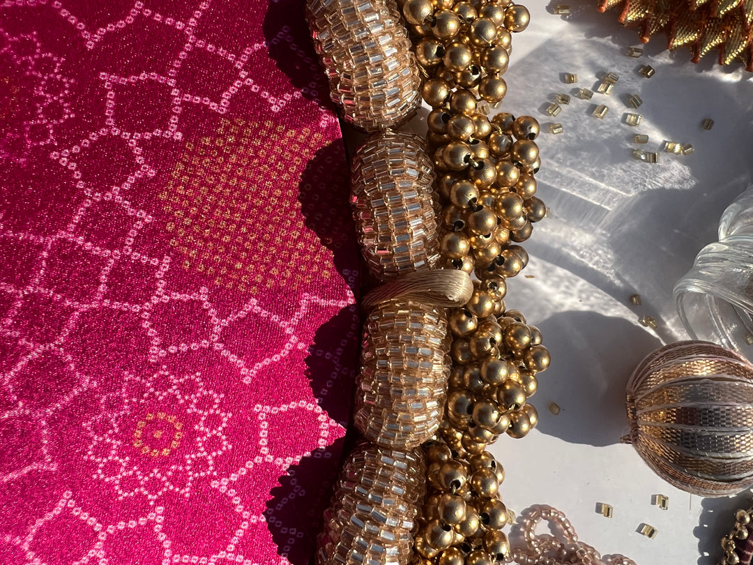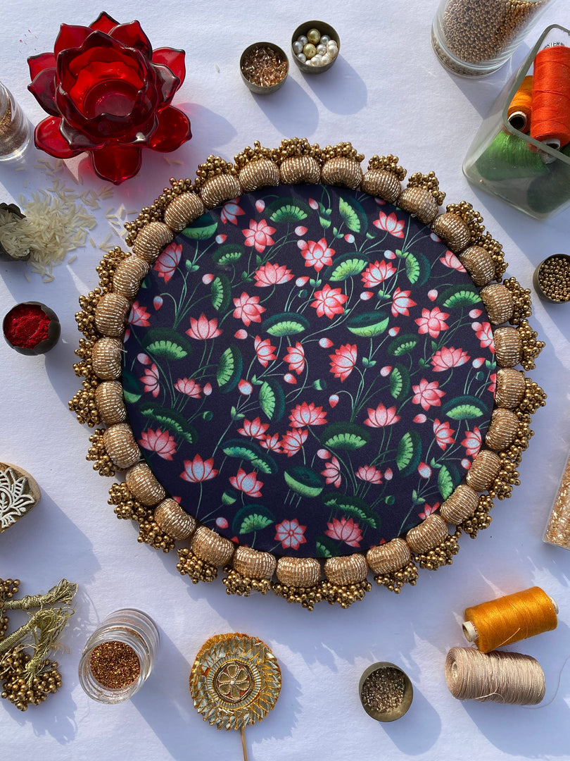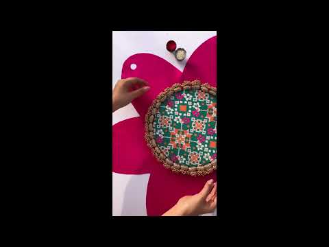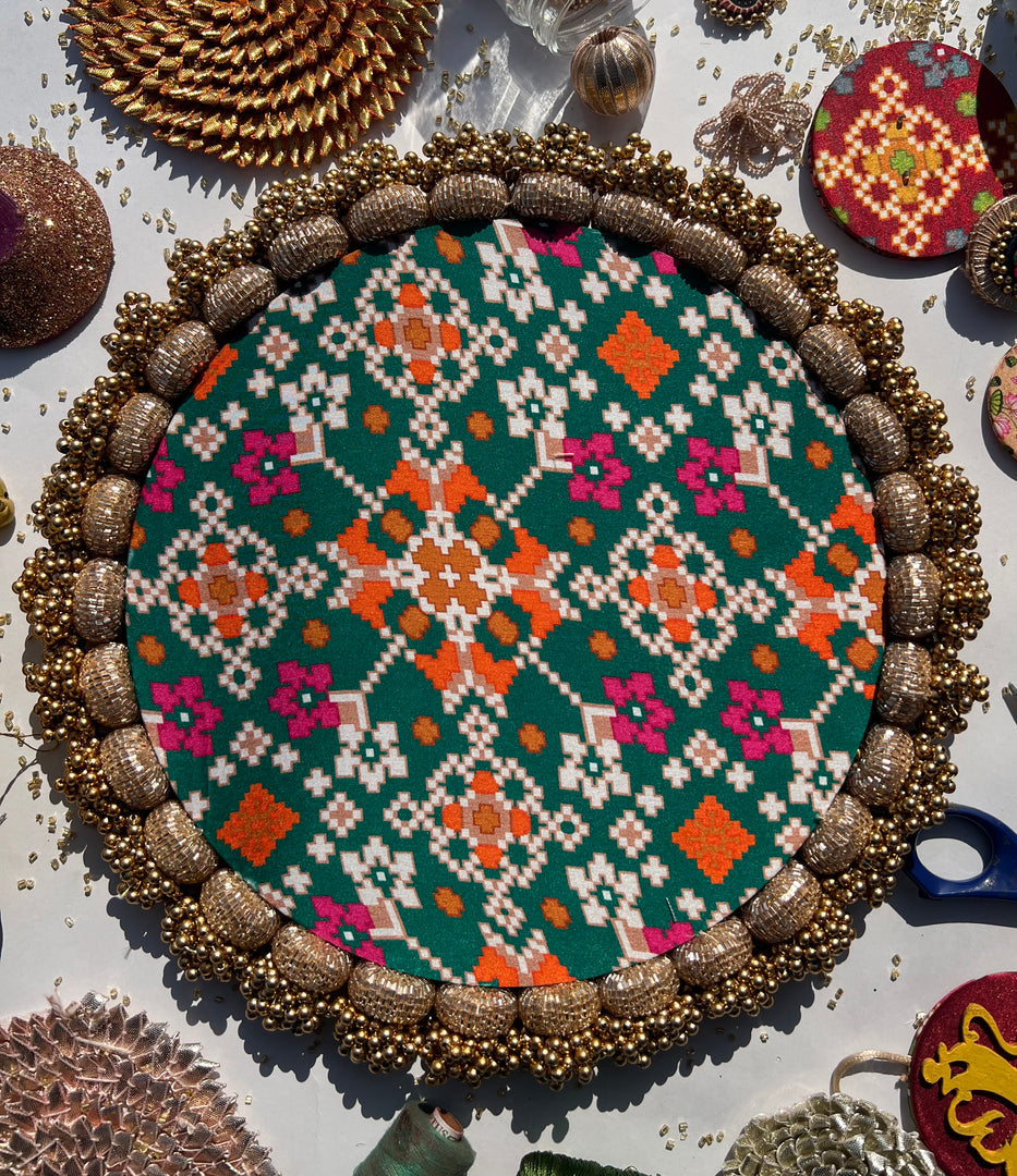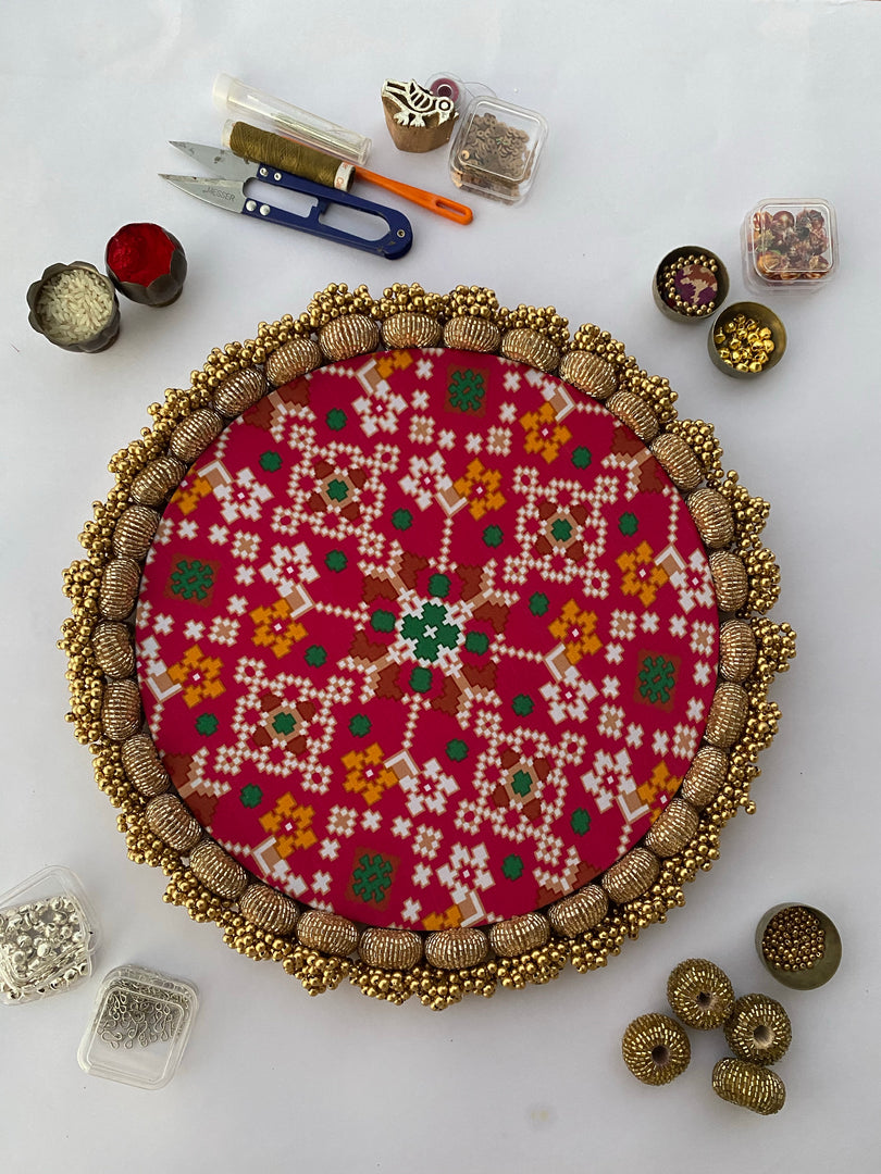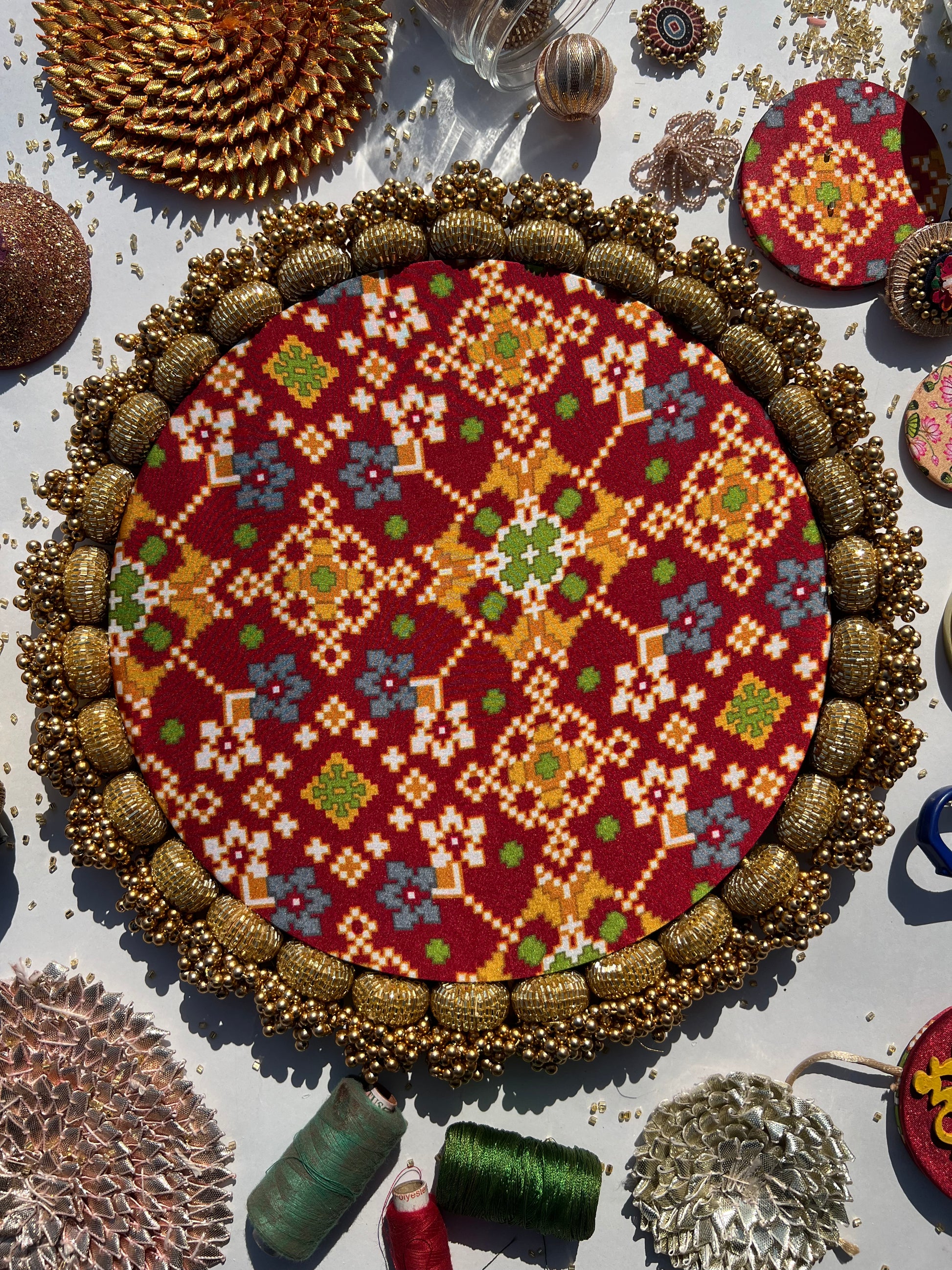 DETAILS IN DETAIL: this rangoli is a versatile platter with a solid base of 10 inches diameter, covered in two different heritage prints- Bandhej & Pichwai. This means you can use this rangoli on both sides in multiple ways. The rangoli is tasseled with 30 wooden base tyre-shaped spheres which are wrapped with yellowish gold cylindrical acrylic beads. Each embellished bead has a bunch of 85 matt finish dull-golden beads of 5mm diameter. Including all the details of the tassels, total diameter of the rangoli is 13 inches. Each rangoli has a small loop made using silk chandan thread, which is small enough to not be visible but strong enough to hold the entire rangoli when hung on a wall as decor. Flat on a surface or suspended on a wall, this rangoli is ultra versatile.