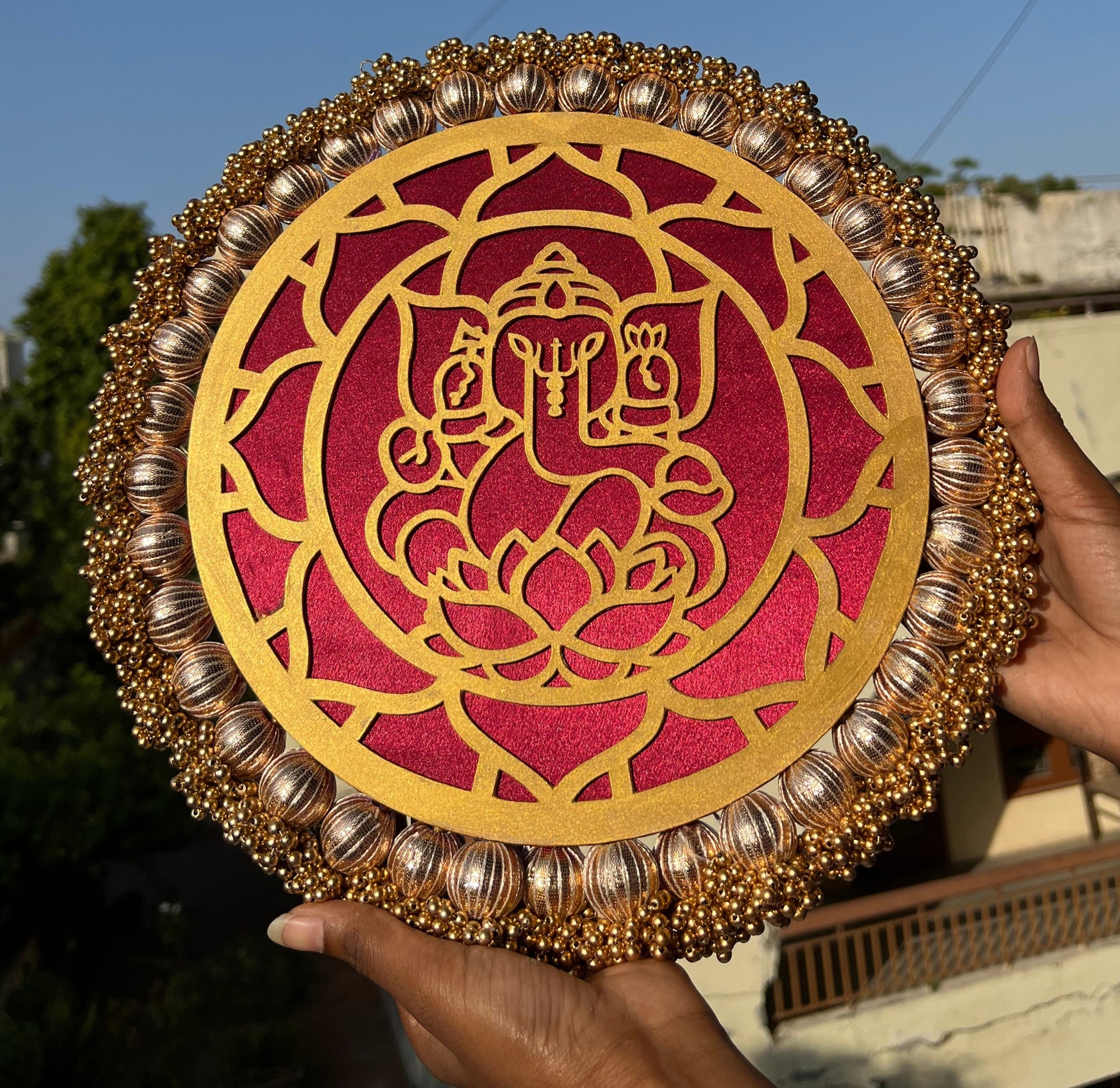 🌟 Intricately Crafted: Our Ganesh Rangoli Pallet is a tribute to intricate craftsmanship. The Ganesh motif, intricately cut and hand-painted with gold, radiates divine charm that captures the essence of spirituality.