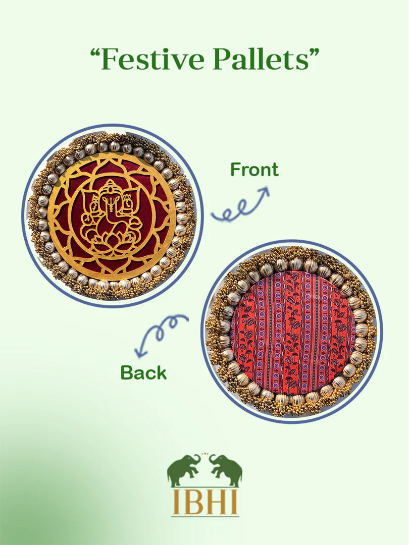 🎨 Dual-Sided Beauty: Our Ganesh Rangoli Pallet is a masterpiece from all angles. While the Ganesh motif graces the front with its golden splendor, the back features a flat digital print showcasing motifs of lotus in vermillion color, adding a vibrant touch to its versatility.