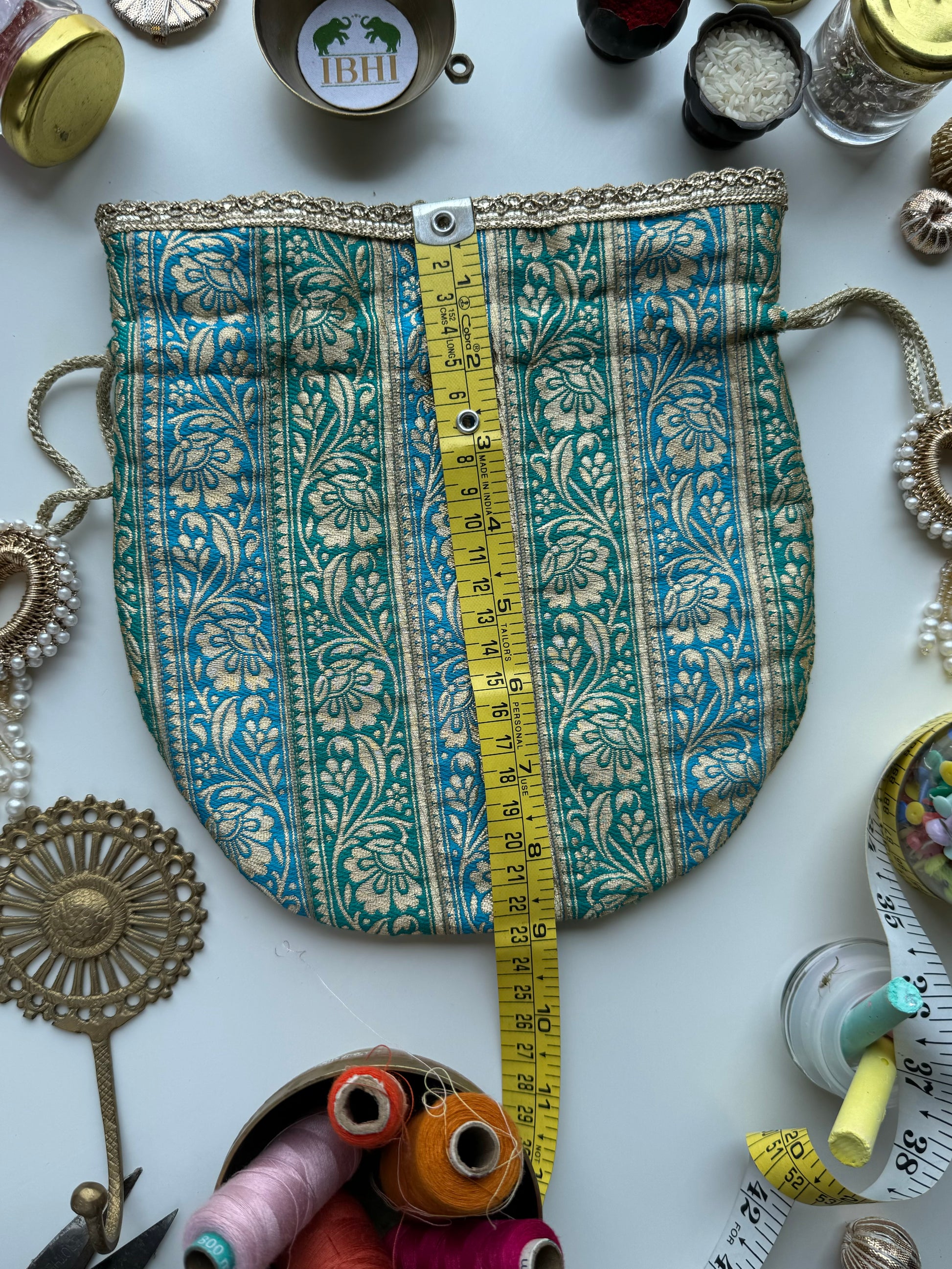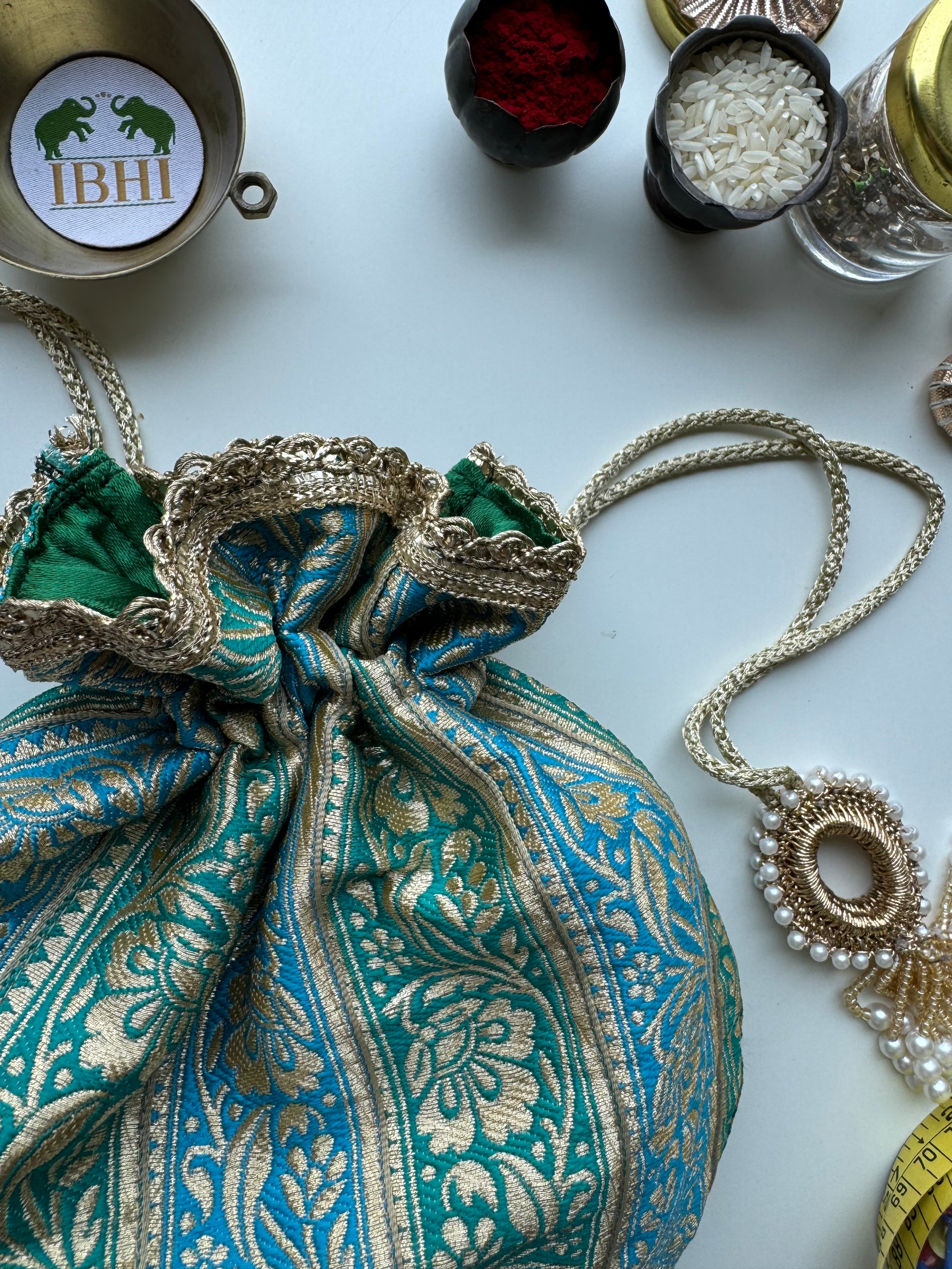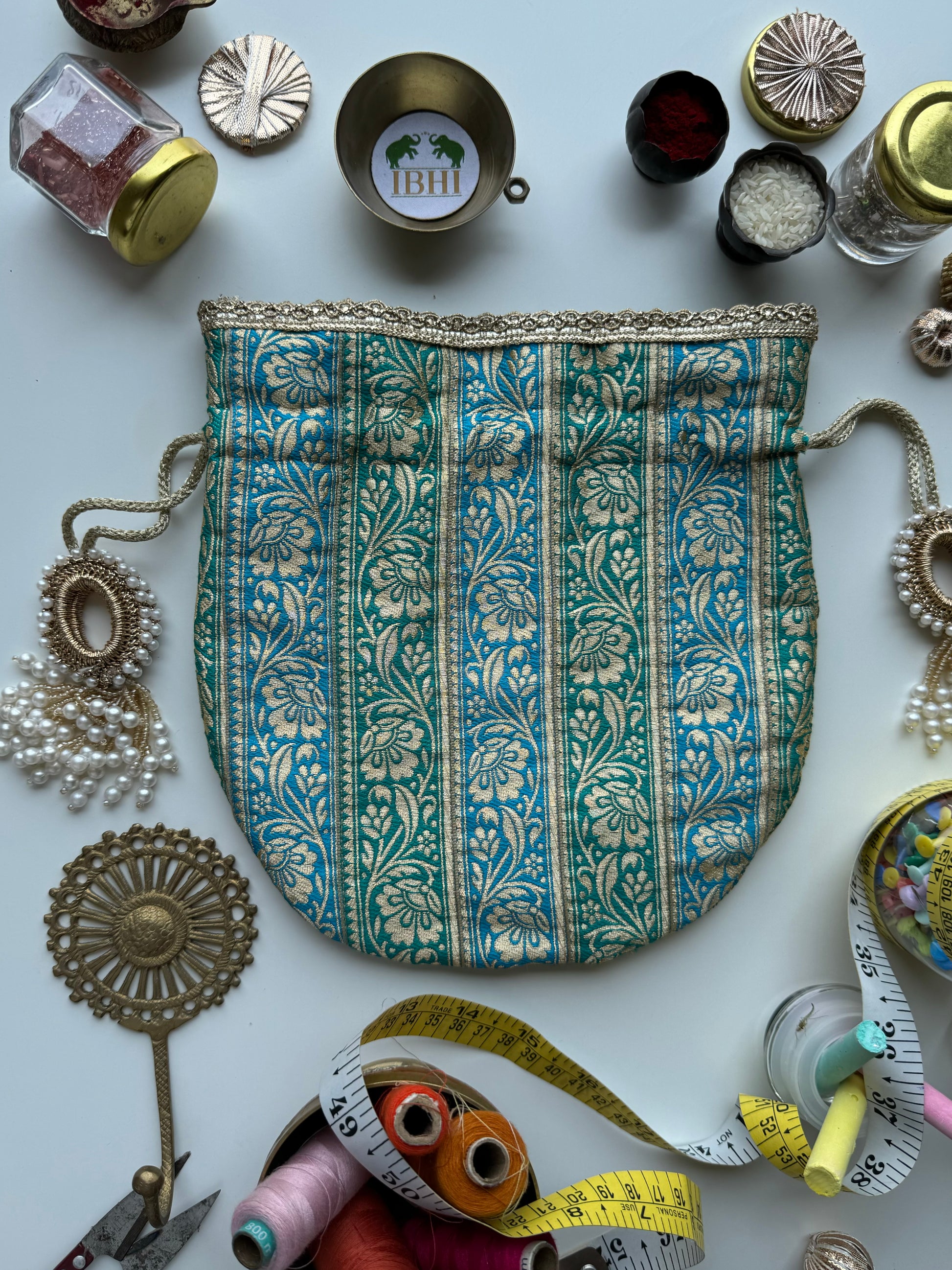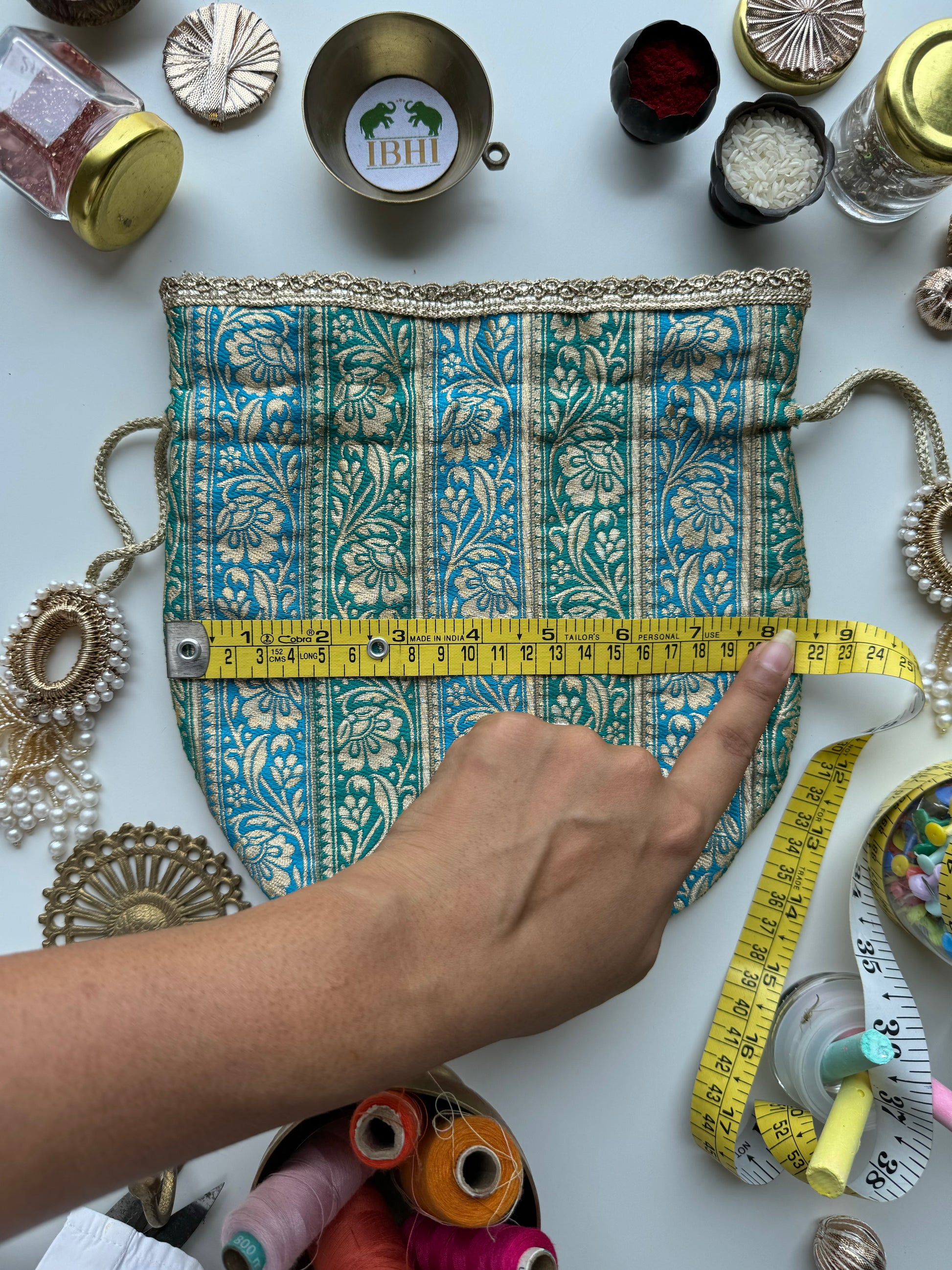 Aasmani Morpankhi Potli bag is made by stitching together english tone of sky blue & green floral veil panels. For a finishing bold touch, solid gold zari lines on both ends of each panel. Towards the mouth of the potli bag where it closes, a classic light golden braided lace completes the potli bag.
