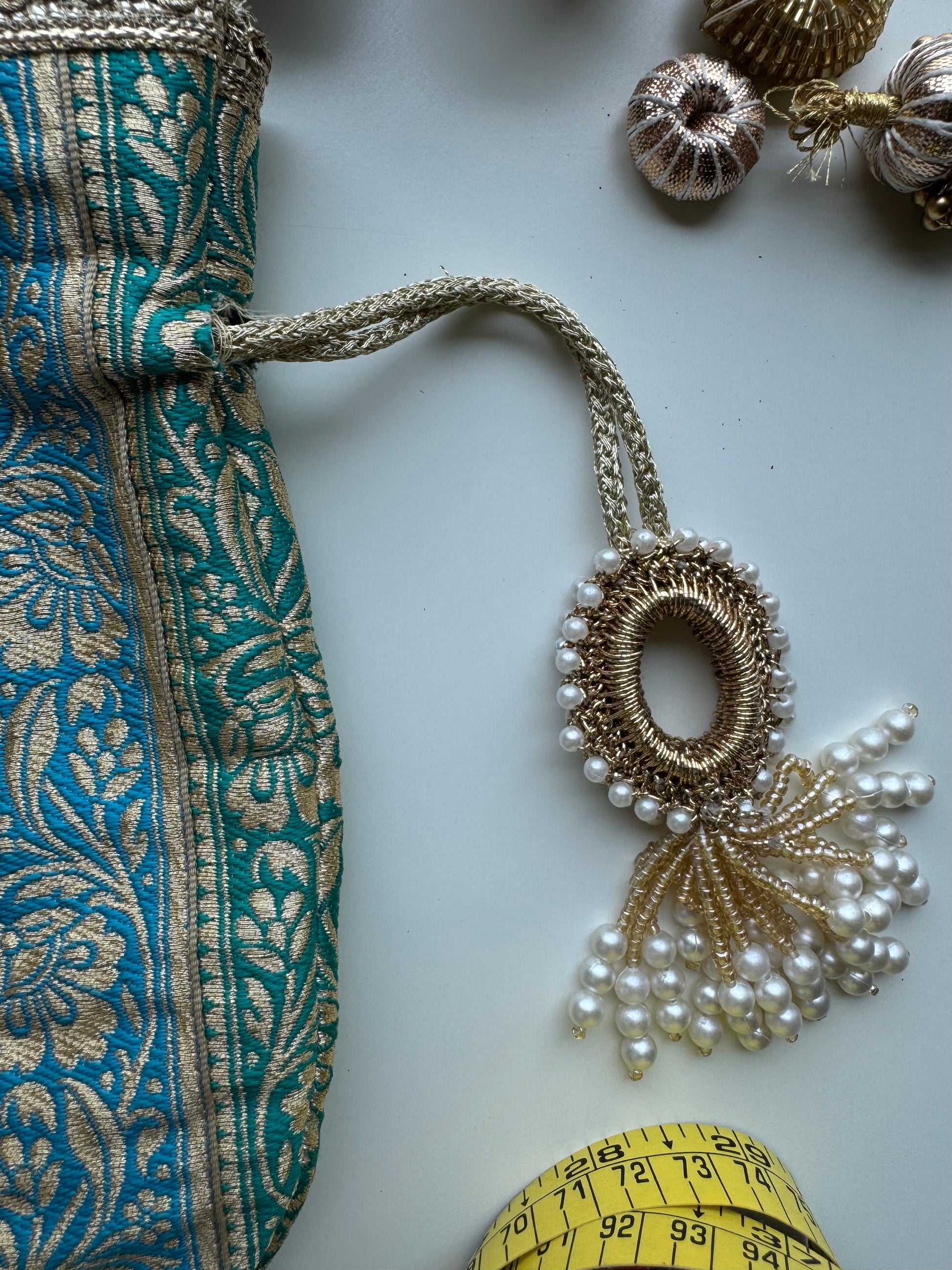 The tassels of the potli bag are made using crochet patches with pearl white beads on the periphery and a fountain style light golden and pearl white beads.