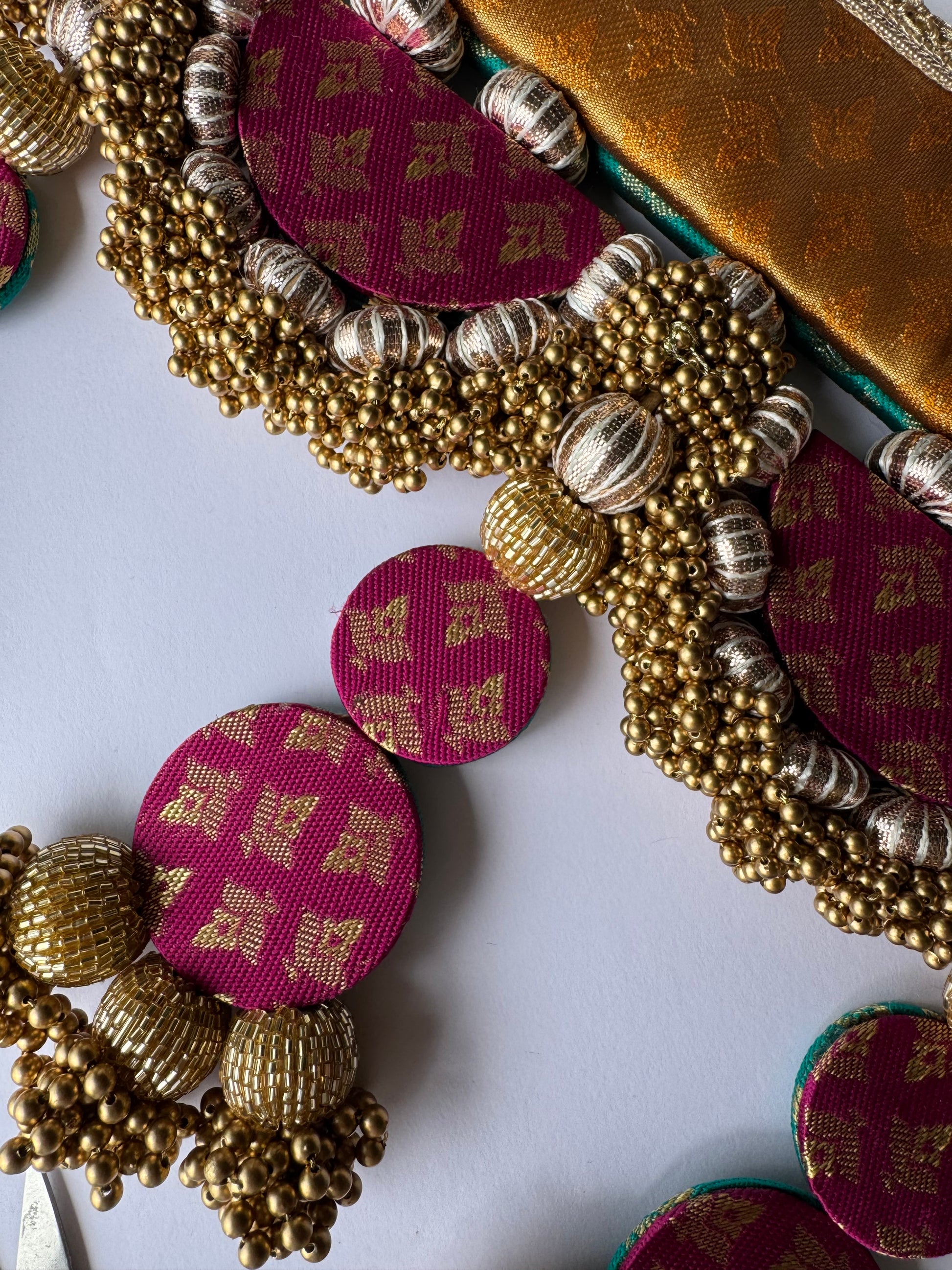 • Side 2: Vibrant magenta and mustard base with all-over yellow gold zari detailing