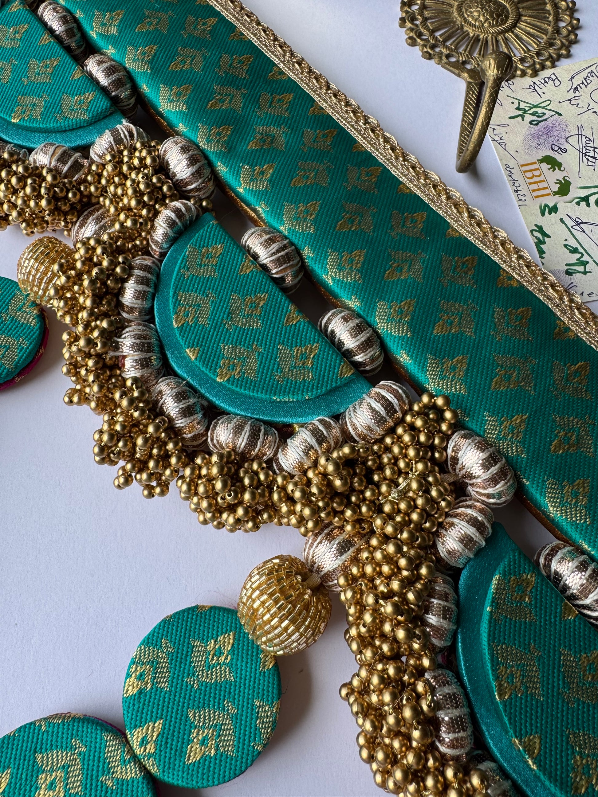 • Side 1: Rich Rama green Banarasi-inspired fabric with classic gold zari butti