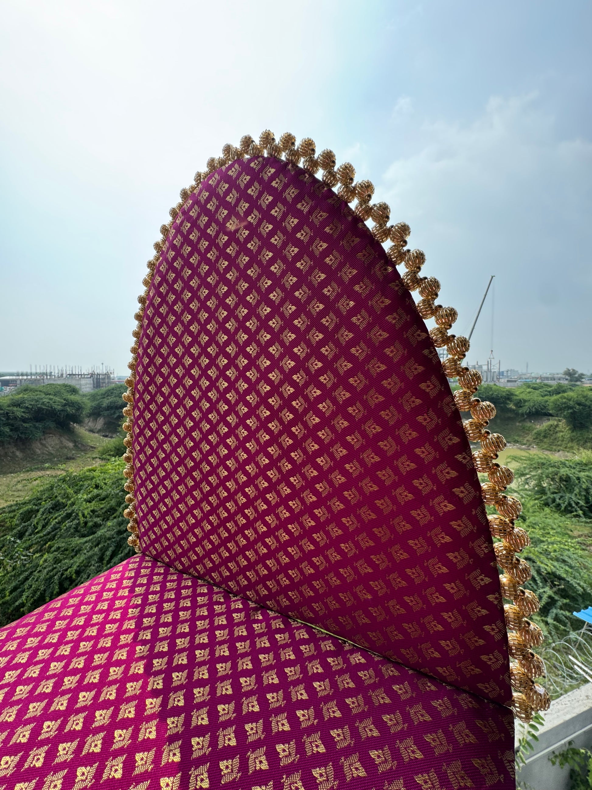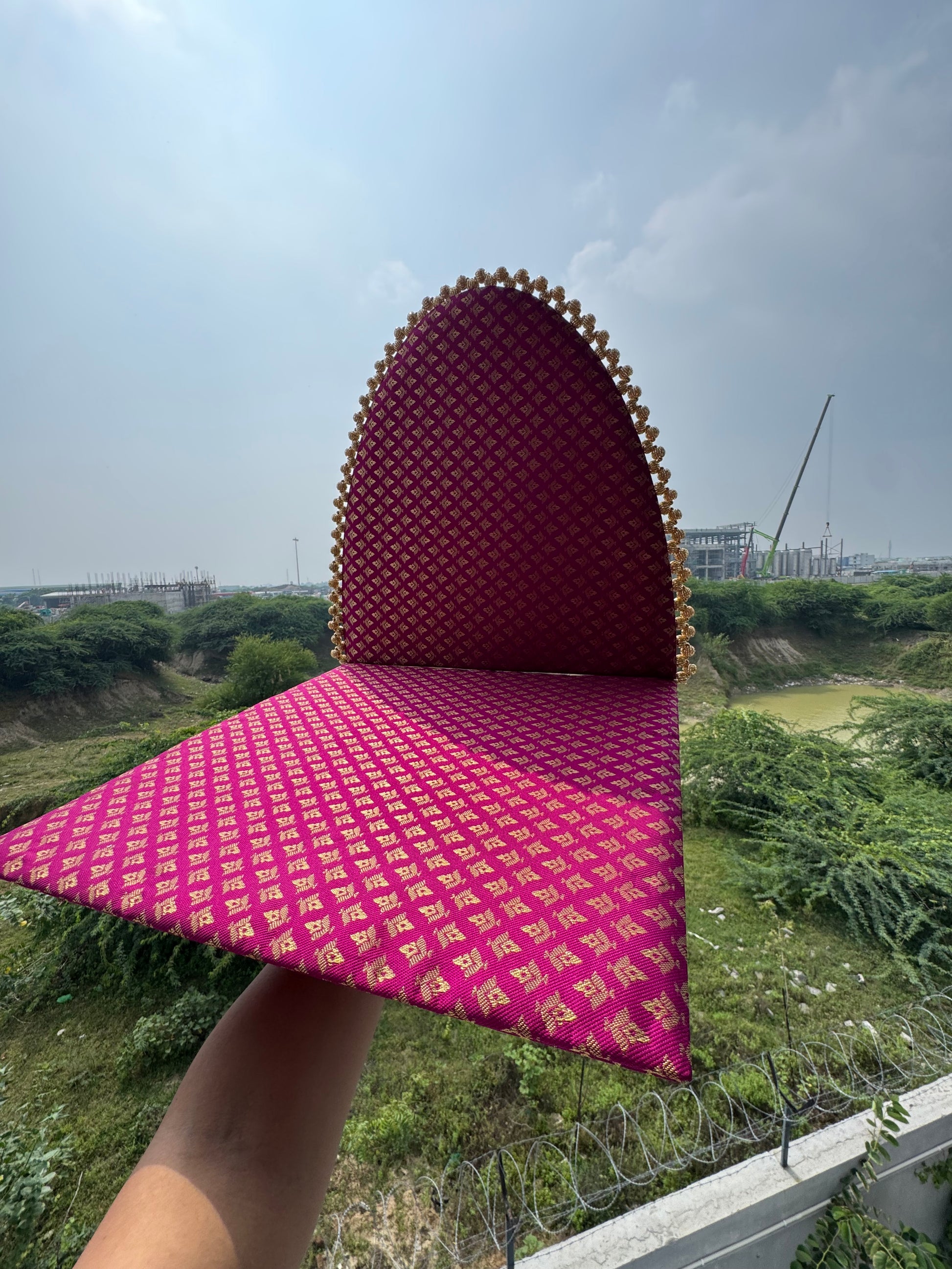 ✨ Premium Finish – Adorned with beaded edges, foam cushioning, and a Banarasi look-alike butti fabric in festive magenta.