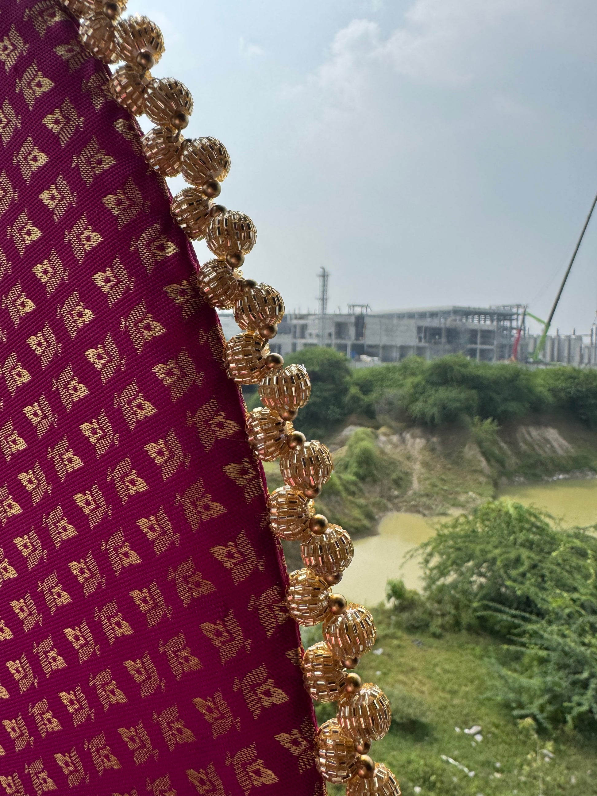 Bring divine elegance to your Ganpati celebrations with our Magenta Banarasi Butti Ganpati Backdrop Set. Thoughtfully handcrafted, this fixed design combines tradition with subtle festive luxury: