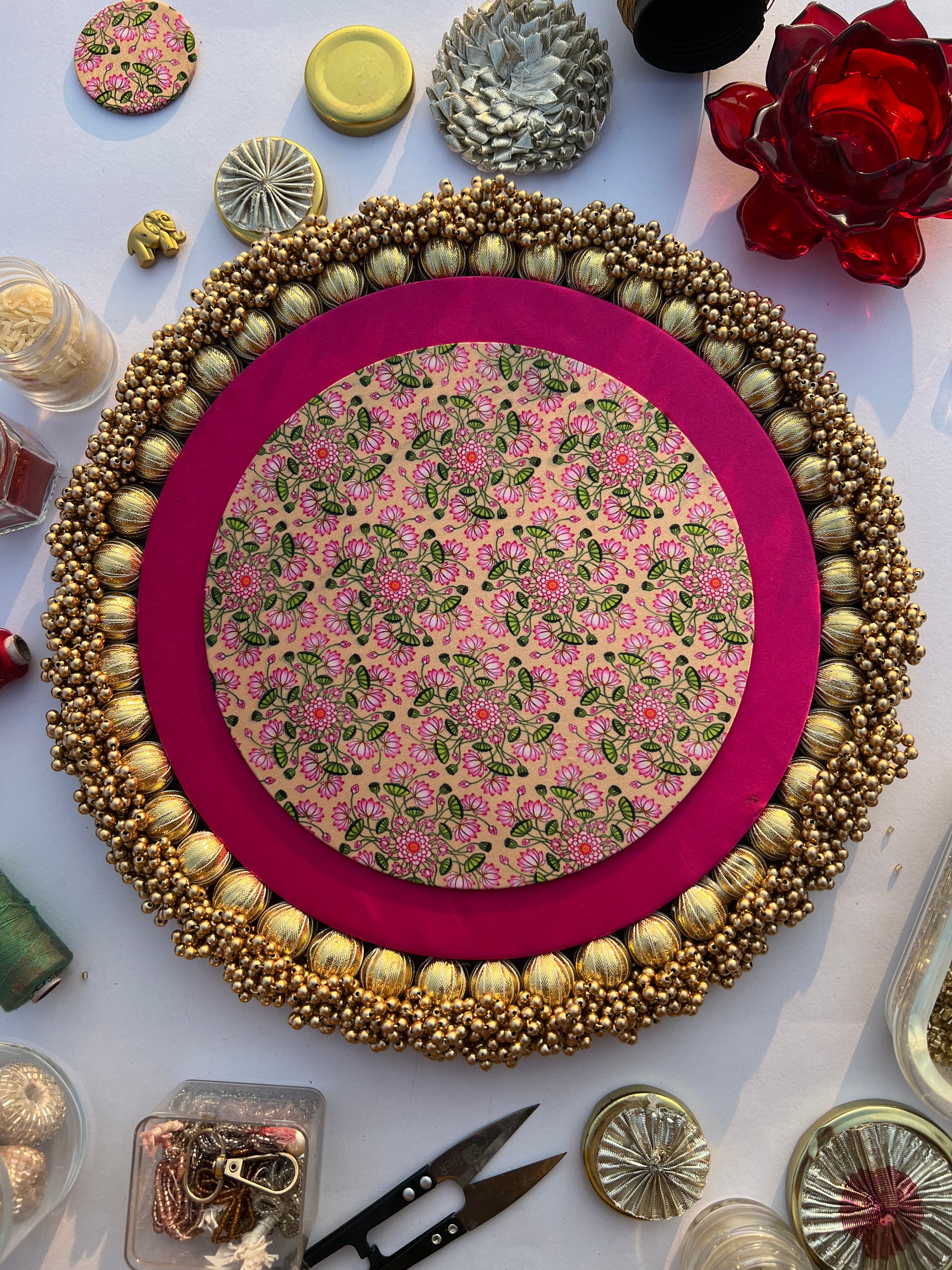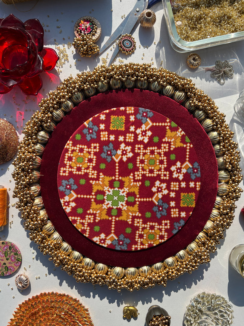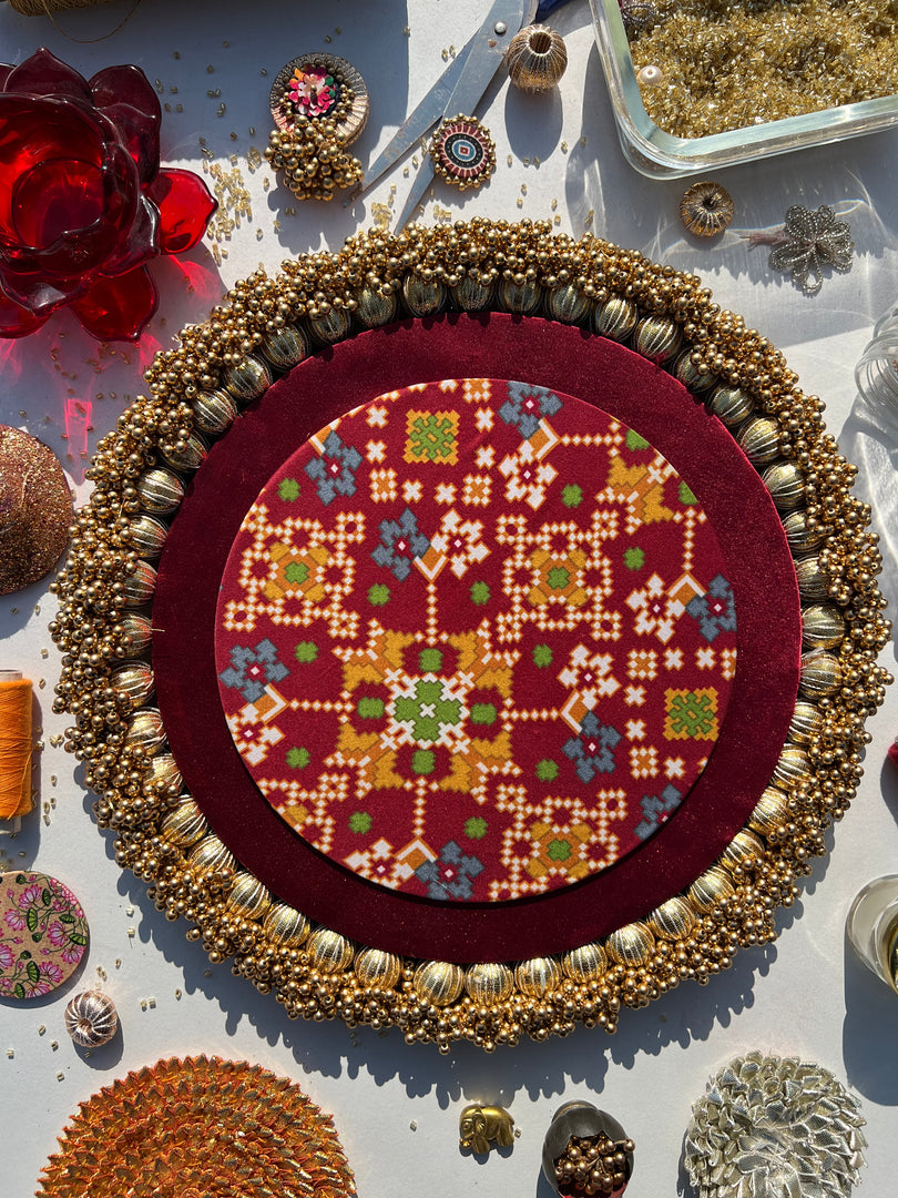 We have harmonized the art of Mandala with our classic design of Rangoli, it has a pastel & subtle house print on one side and solid radiant colour on the other side with a Mandala pattern made using beaded discs and buffed flowers.