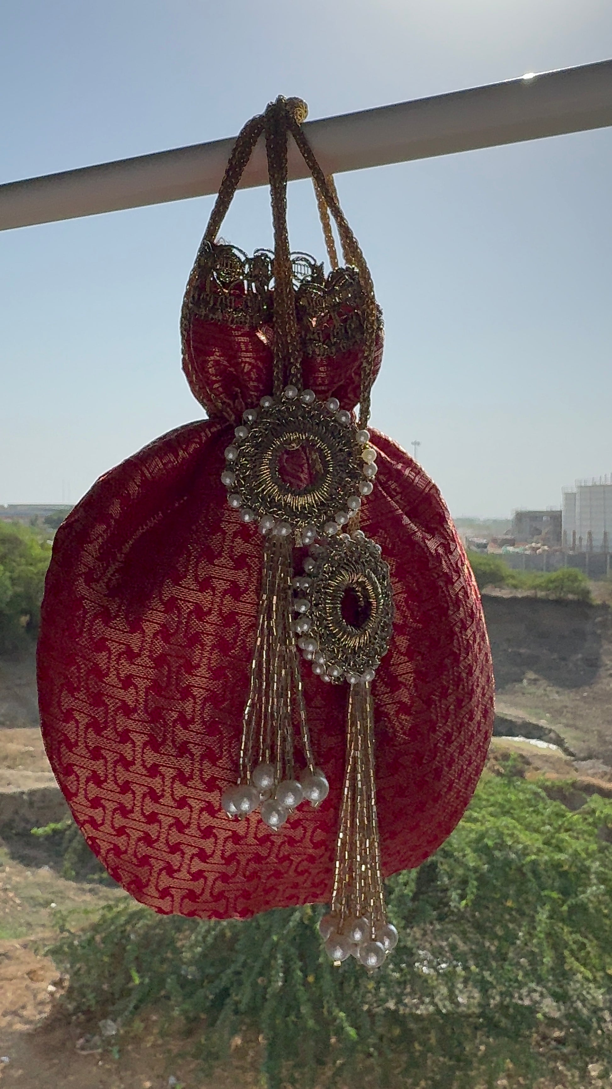 🍅✨ Single Piece – Tomato Red & Indian Gold Banarasi Zari Potli (9" x 9.5")