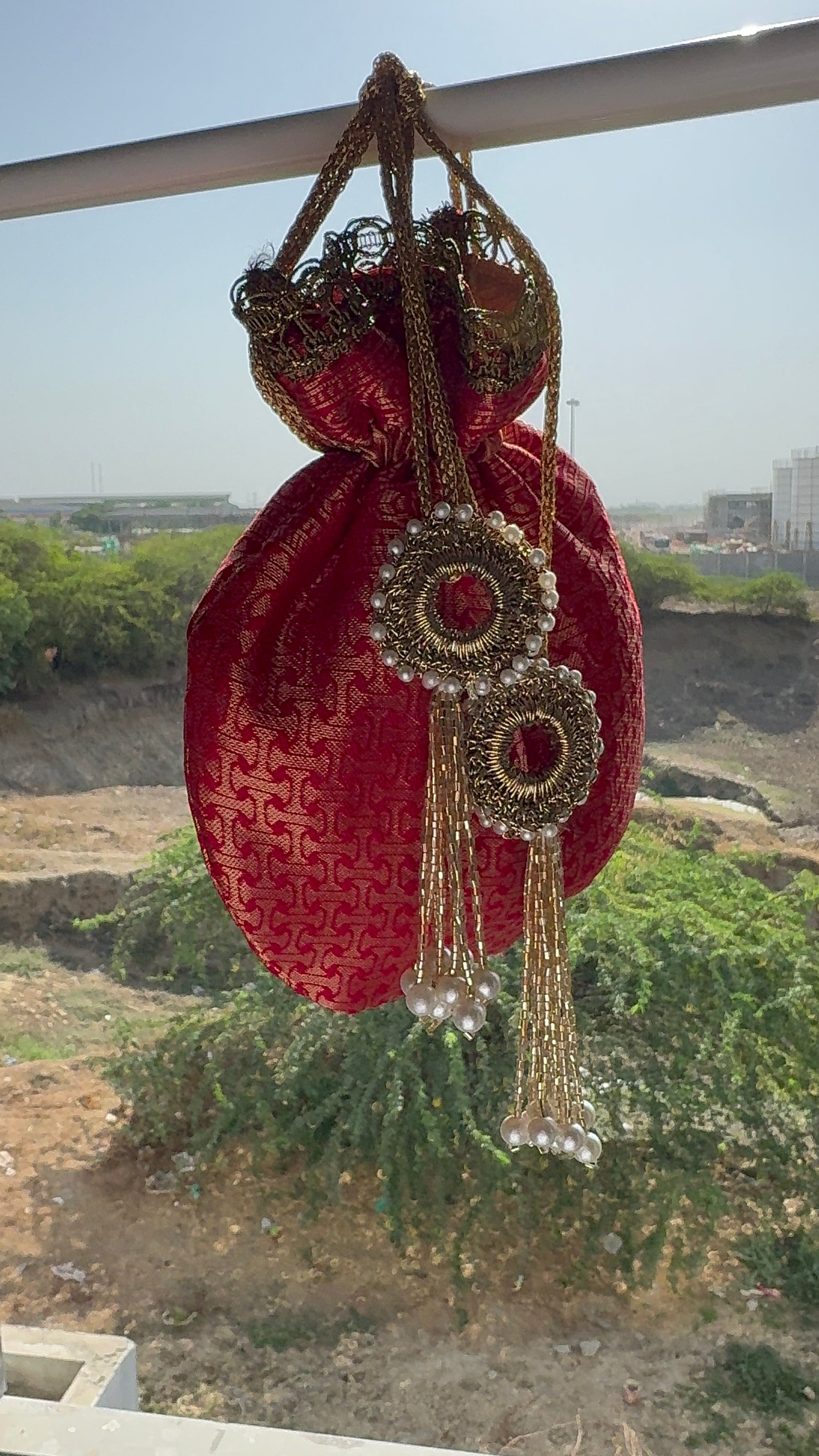 🧵 Top lace detailing: A subtle thread-and-sequin blend that enhances the potli’s golden glow