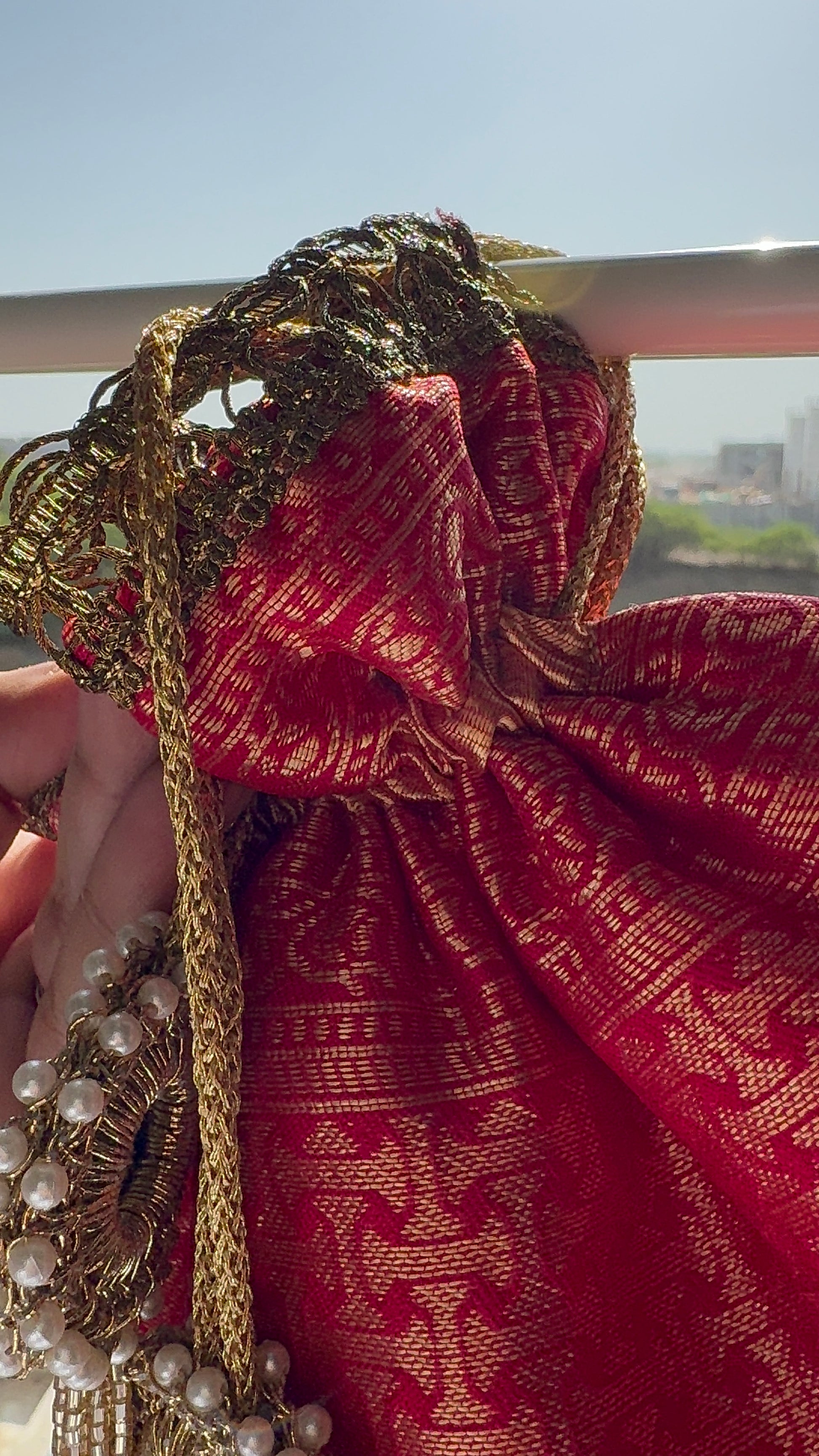 Crafted from luxurious Banarasi fabric in rich tomato red with Indian gold zari weaving, this potli bag is more than just festive—it’s regal. The outer layer is accentuated with sequin and thread lace, perfectly complementing the golden motifs in the base fabric.