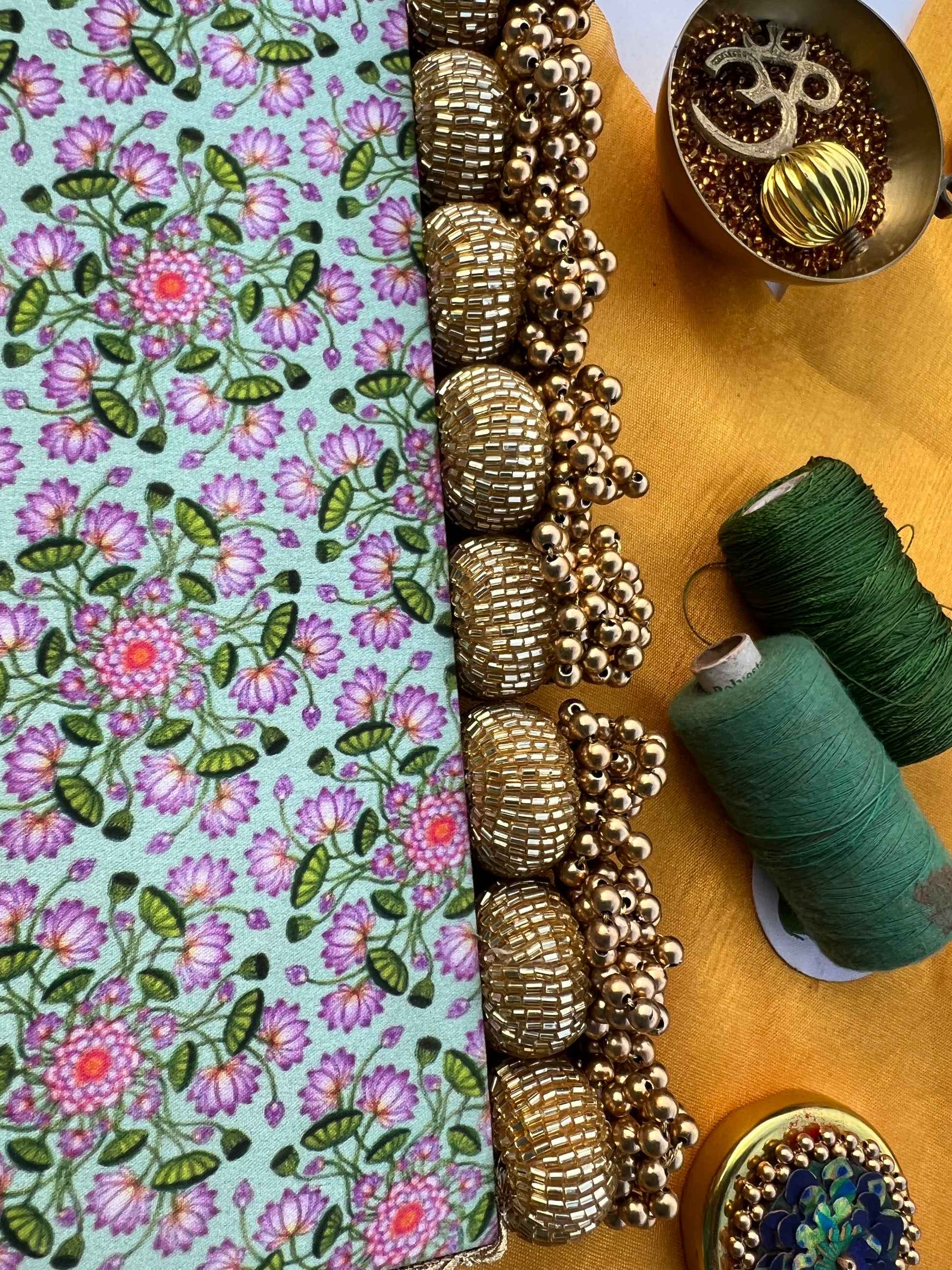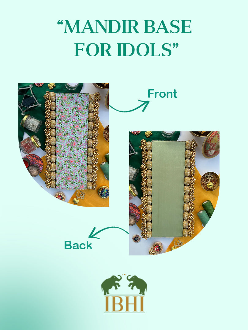 DETAILS IN DETAIL: It is a stand alone single piece beauty, it has two different sides, it is covered in flat digital print on both sides. The basal diameter of this pallet is 12 inches X 4 inches, it is firm and sturdy- there is a foam base which makes it cushiony and soft. The pallet has beads on the longer periphery which are hand-sewn on at the base. It is 12 inches X 6 inches including the beads.