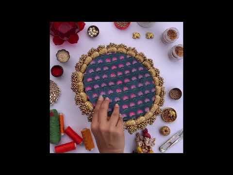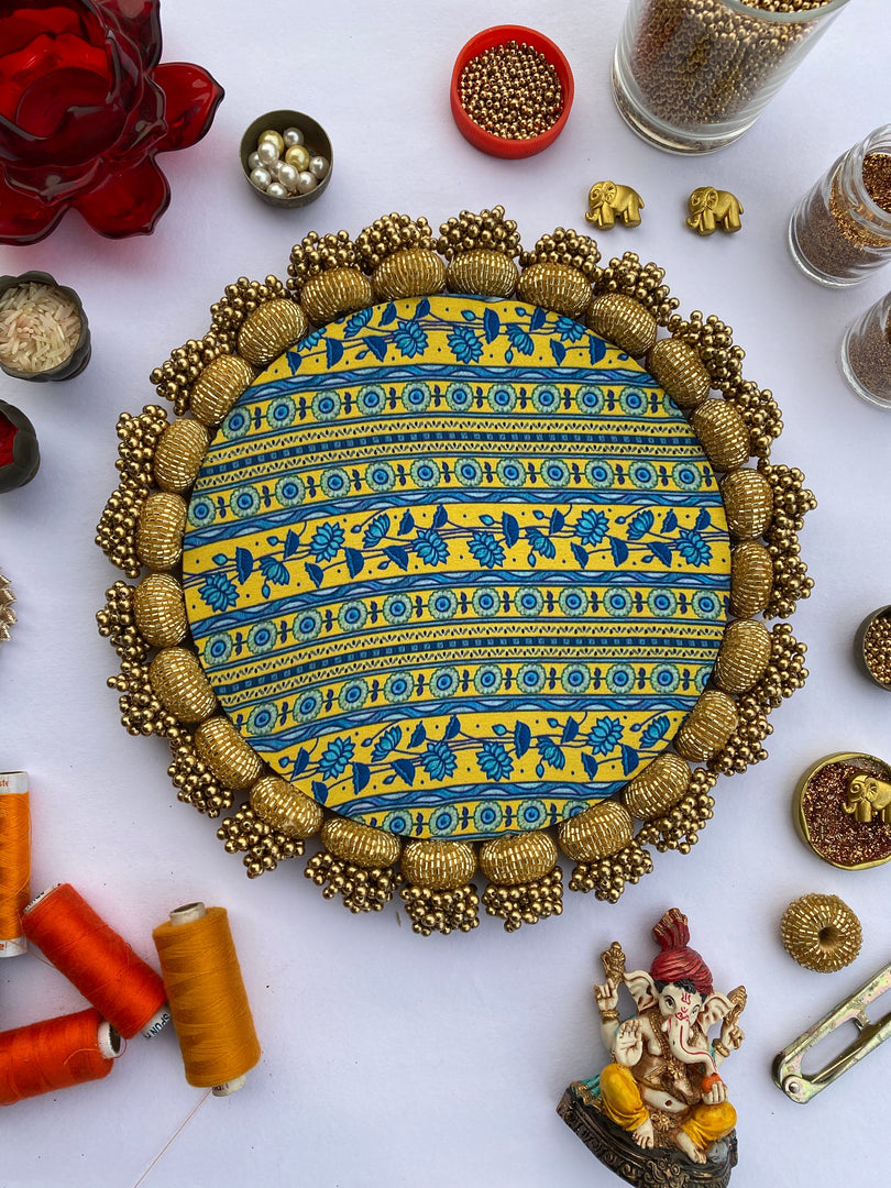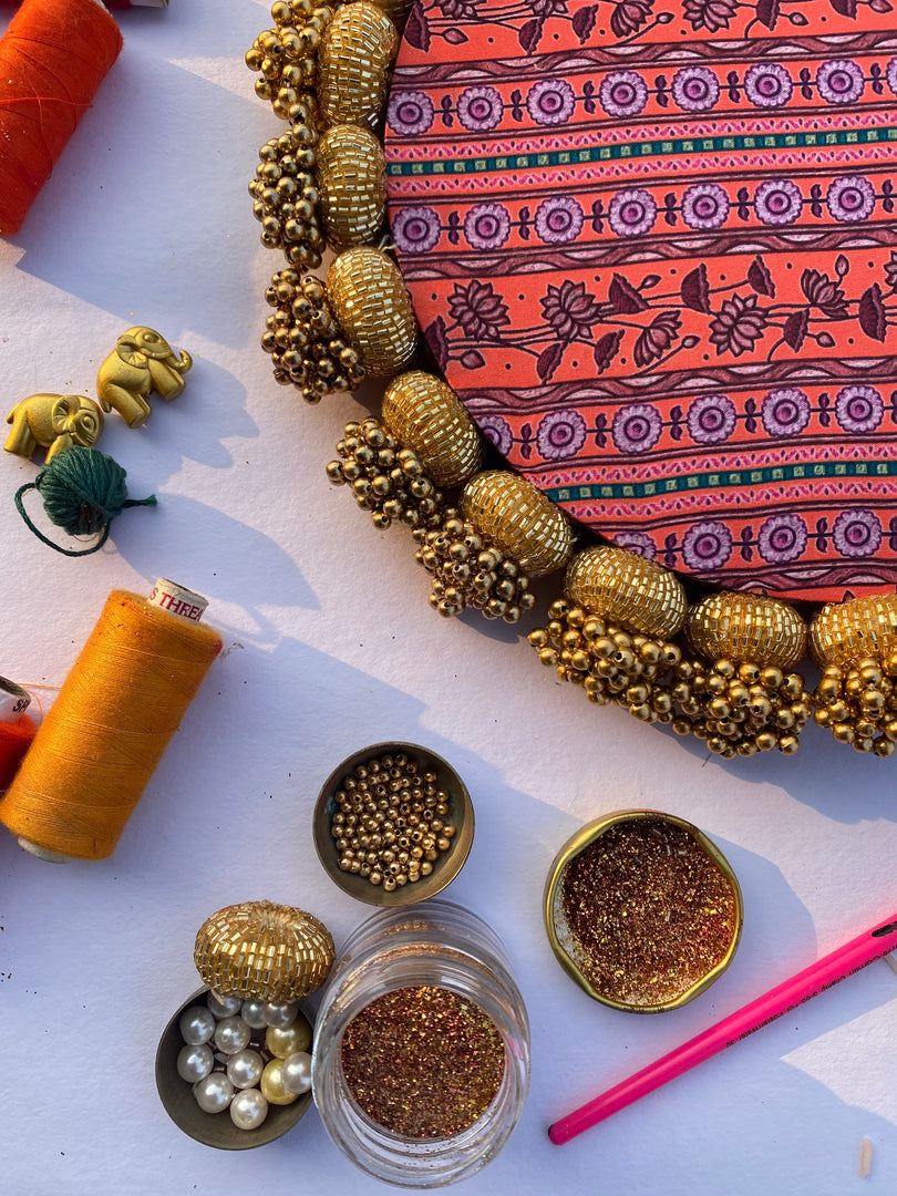 DETAILS IN DETAIL: Our IBHI is made using historic-heritage textiles of India, so of course this IBHI has its own history, not very old though. This IBHI was designed and created as a Rangoli during the festive season, yet it evolved as a multi-purpose and versatile pallet. It is a stand alone single piece beauty, it has two different sides, it is covered in flat digital print on both sides, which makes it two-sided. The basal diameter of this pallet is 8 inches, it is firm and sturdy. The pallet has 24 tassels on the periphery which are hand-sewn on at the base, the spherical beads are made using wood with rose gold tone spherical beads wrapped inside out. Each sphere has a bunch of 85 fibre based dull golden beads. Along with the tassles, the total diameter of the pallet is 10 inches.