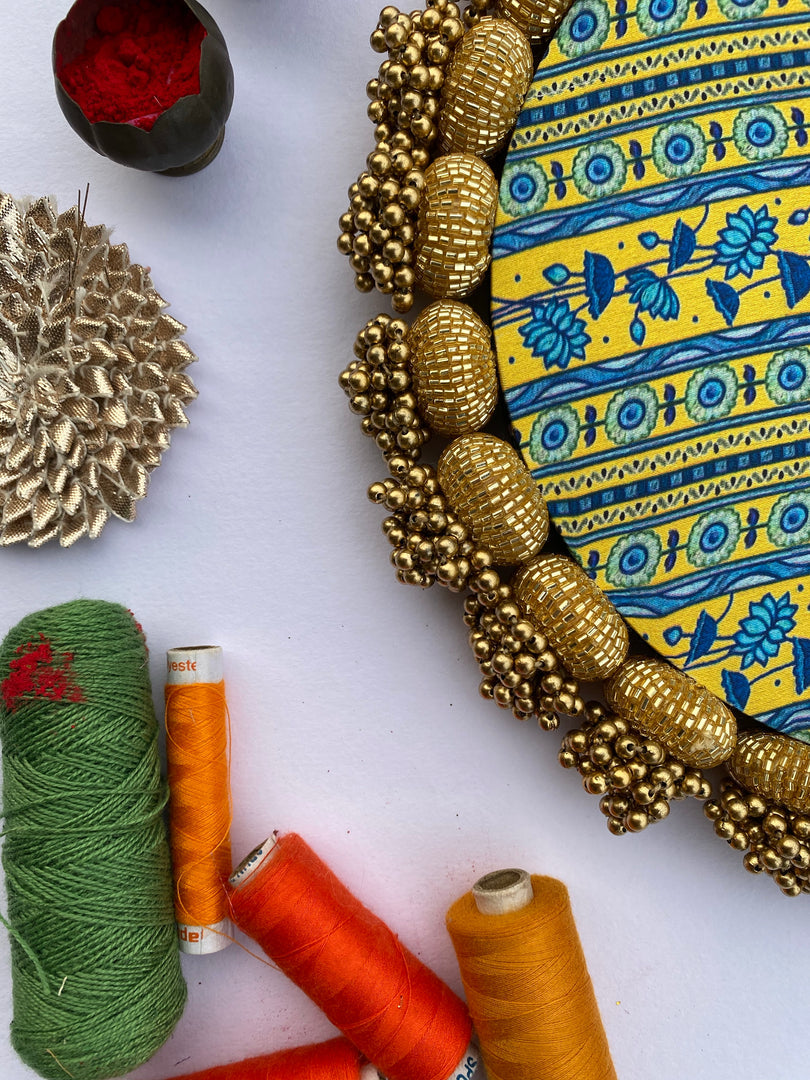 All IBHI products are meticulously handmade, involving various stages of different craftsmanship. Our creations are a blend of layers of high-quality fabric, Medium Density Fibre (MDF) for structure, and intricate beads and embellishments. The beads are meticulously connected using rolls of threads and hand stitches, adding to the uniqueness and charm of our products.