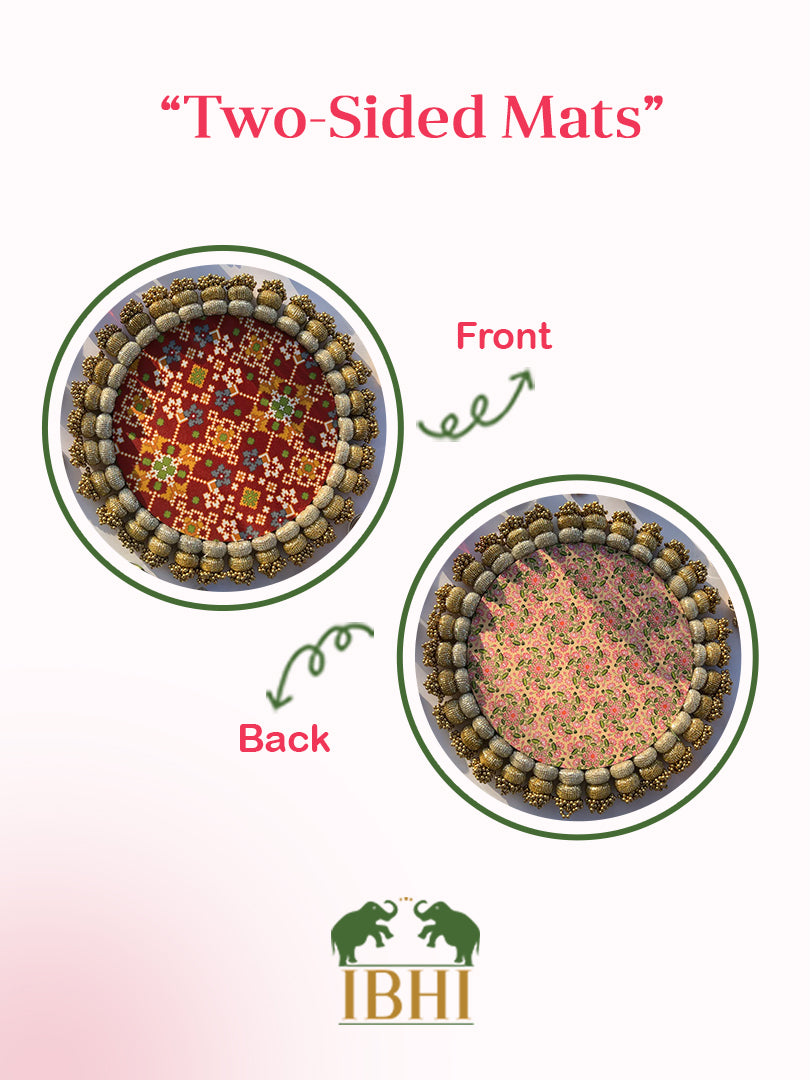 DETAILS IN DETAIL: Our IBHI is made using historic-heritage textiles of India, so of course this IBHI has its own history, not very old though. This IBHI was designed and created as a Rangoli during the festive season, yet it evolved as a multi-purpose and versatile pallet. It is a stand alone single piece beauty, it has two different sides, it is covered in flat digital print on both sides. The basal diameter of this pallet is 10 inches, it is firm and sturdy. The pallet has 30 tassels on the periphery which are hand-sewn on at the base, the spherical beads are made using wood with gold and rose gold tone spherical beads wrapped inside out. Each sphere has a bunch of 85 fibre based dull golden beads. Along with the tassles, the total diameter of the pallet is 15 inches.