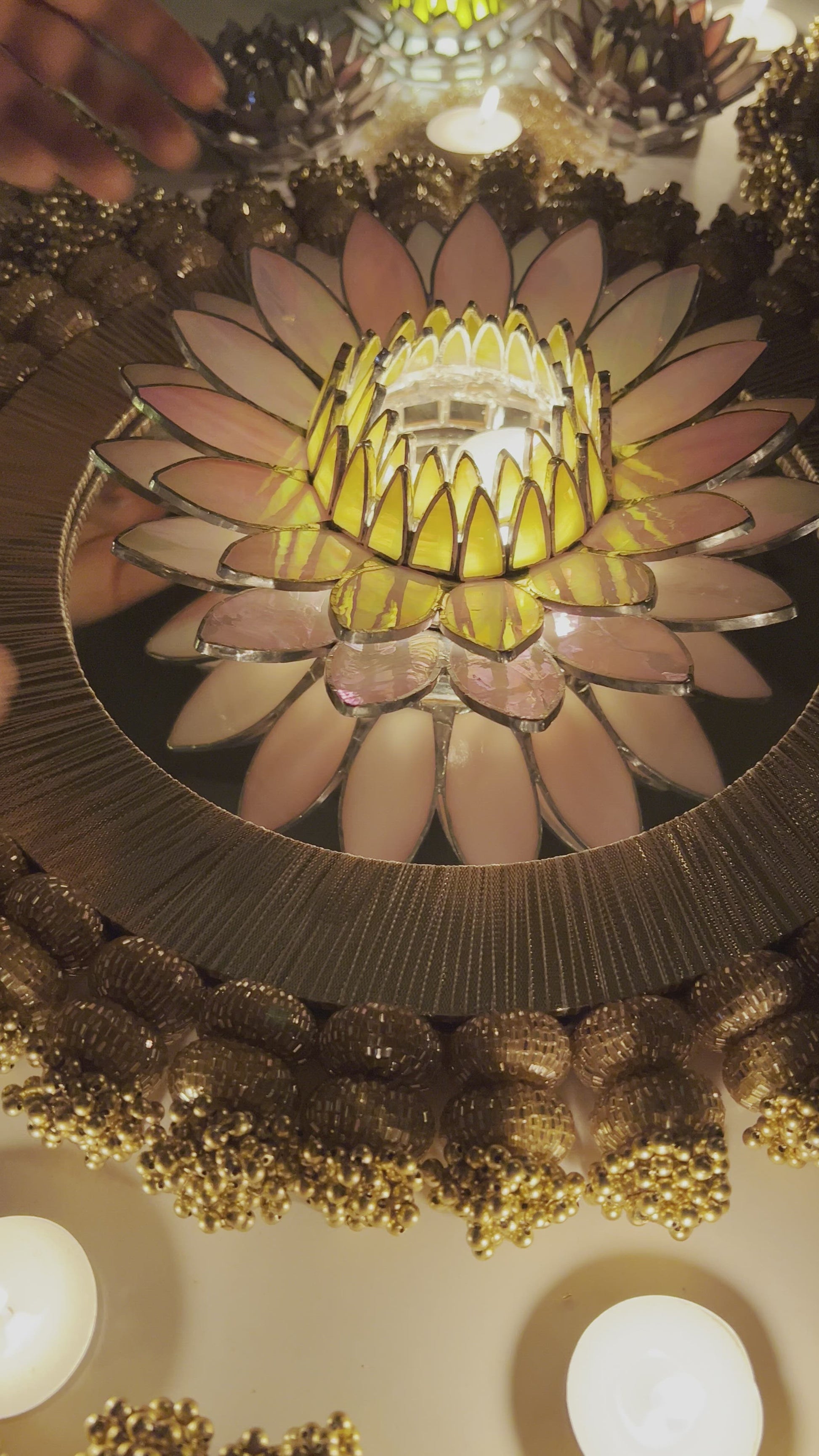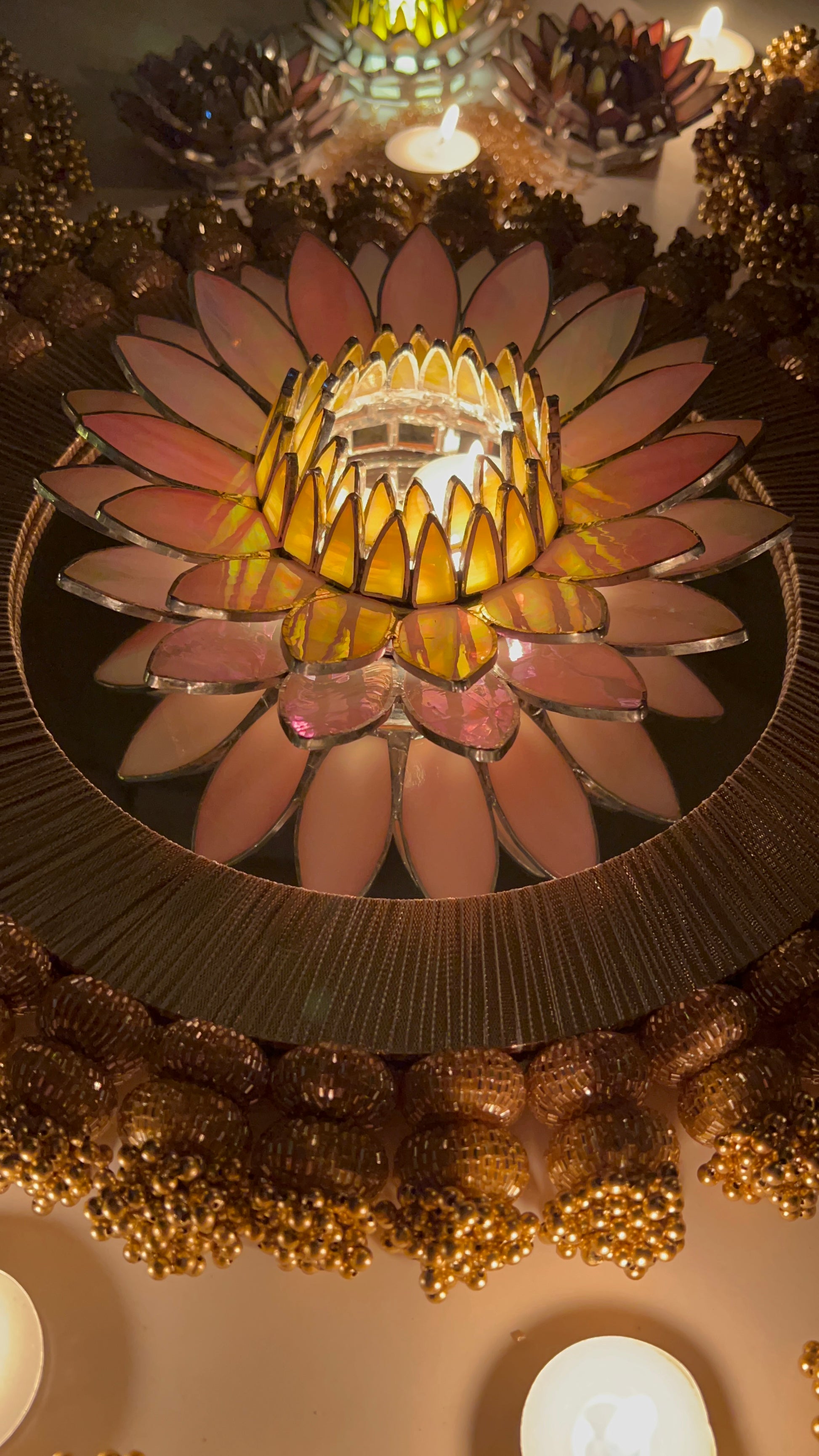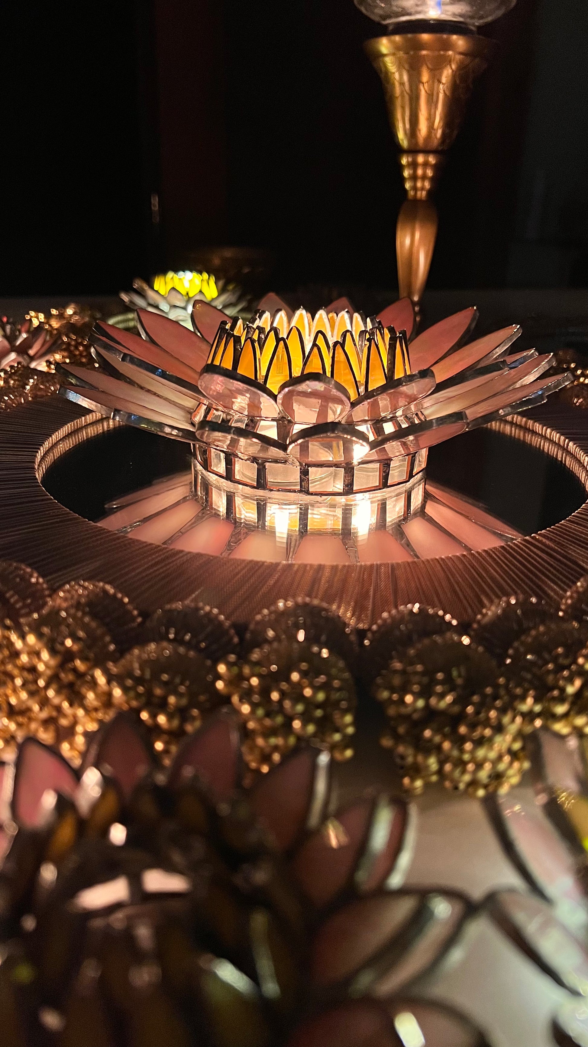 Little details make water lilies beautiful, their pollen encases replica of a sun- so bright and beautiful. We have made an humble effort to replicate the soft petals of the lily using stained glass. Each petal is hand-cut from large sheets of stained glass. We have finished the edges using tin-based solder.