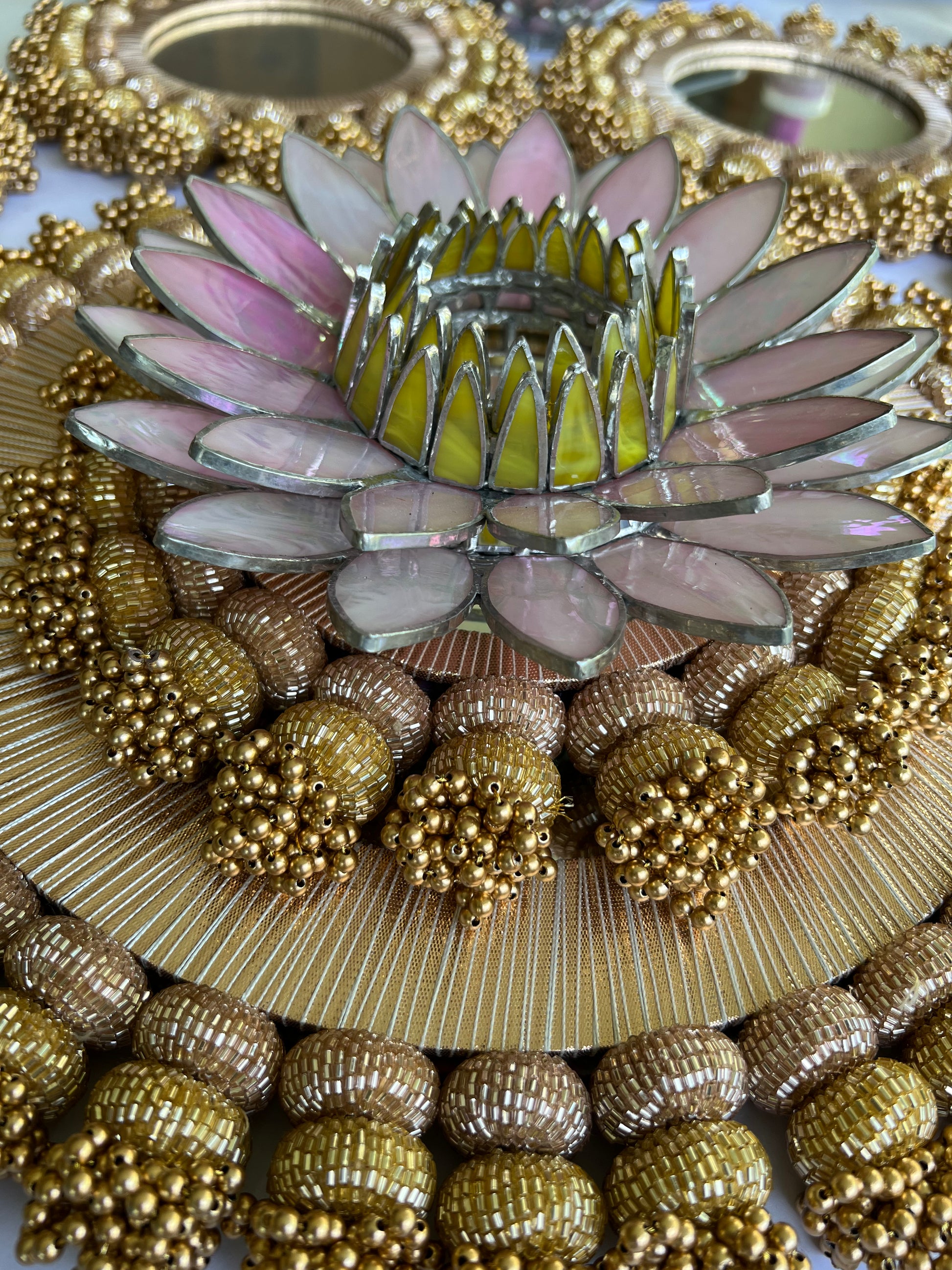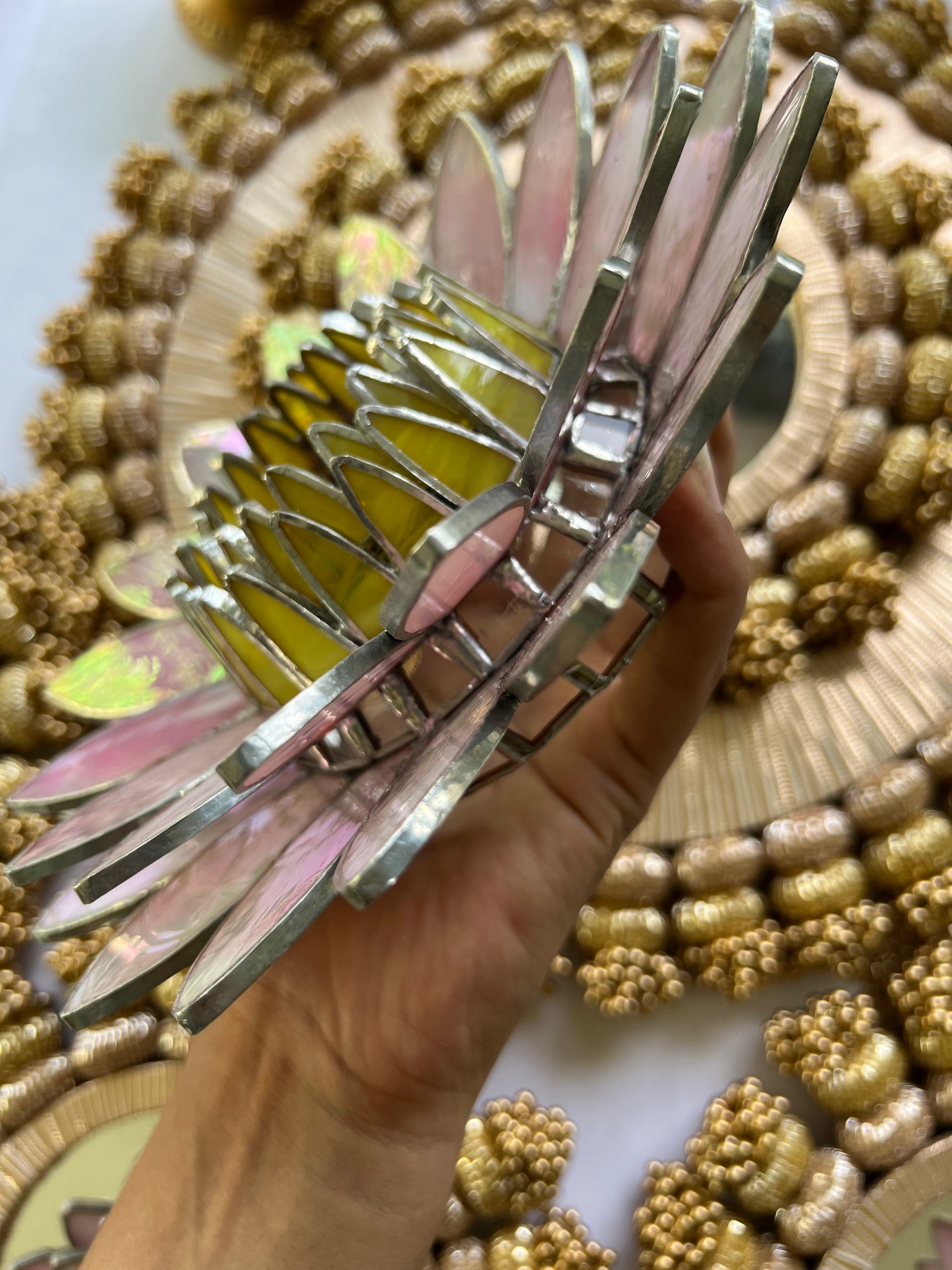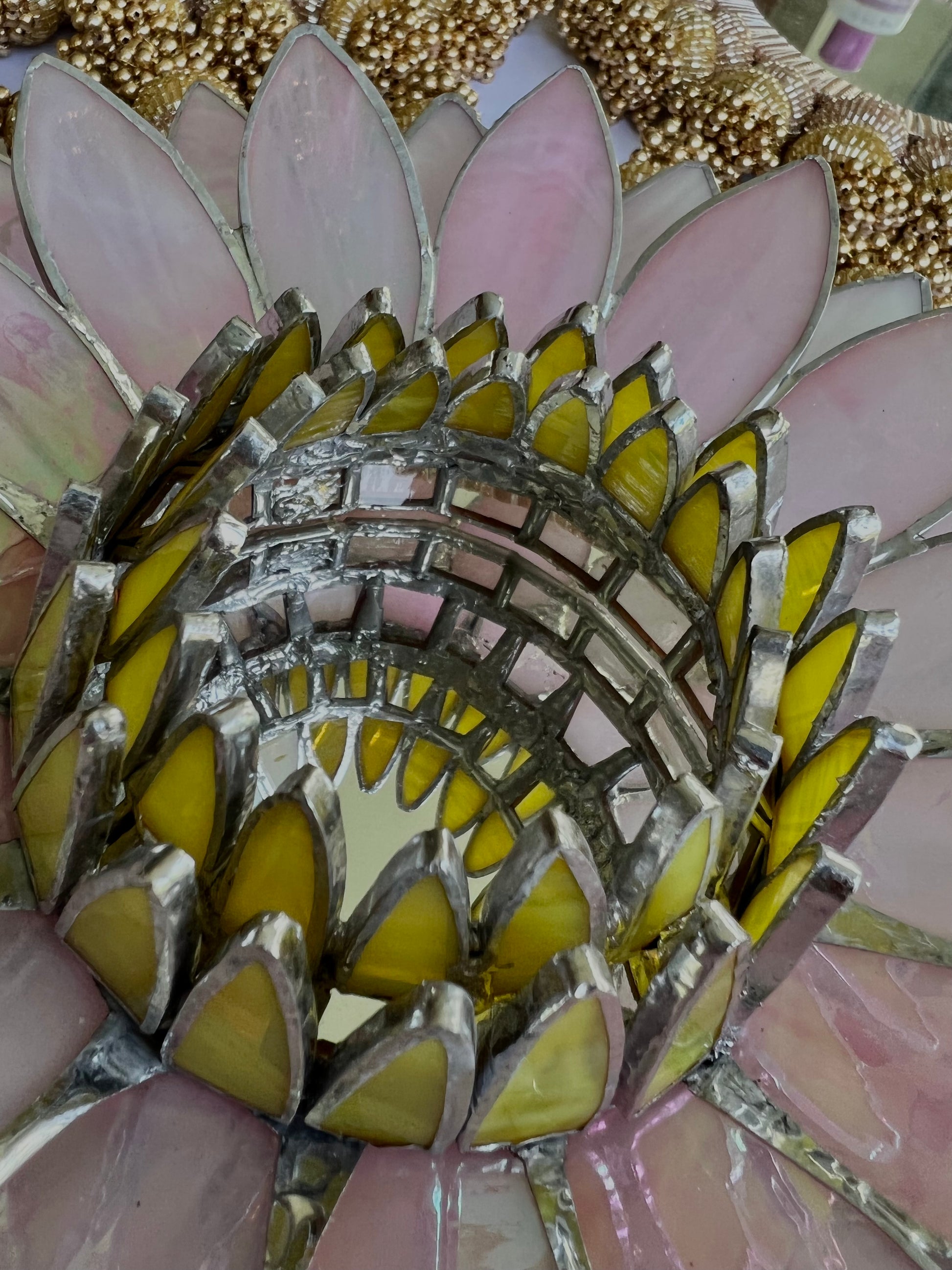 Little details make water lilies beautiful, their pollen encases replica of a sun- so bright and beautiful. We have made an humble effort to replicate the soft petals of the lily using stained glass. Each petal is hand-cut from large sheets of stained glass. We have finished the edges using tin-based solder.