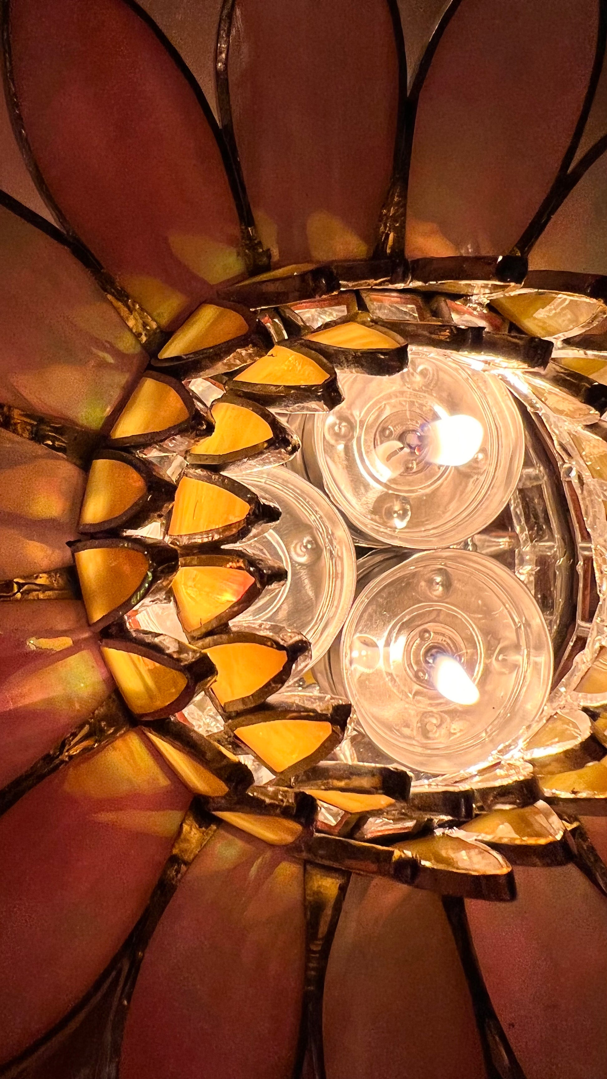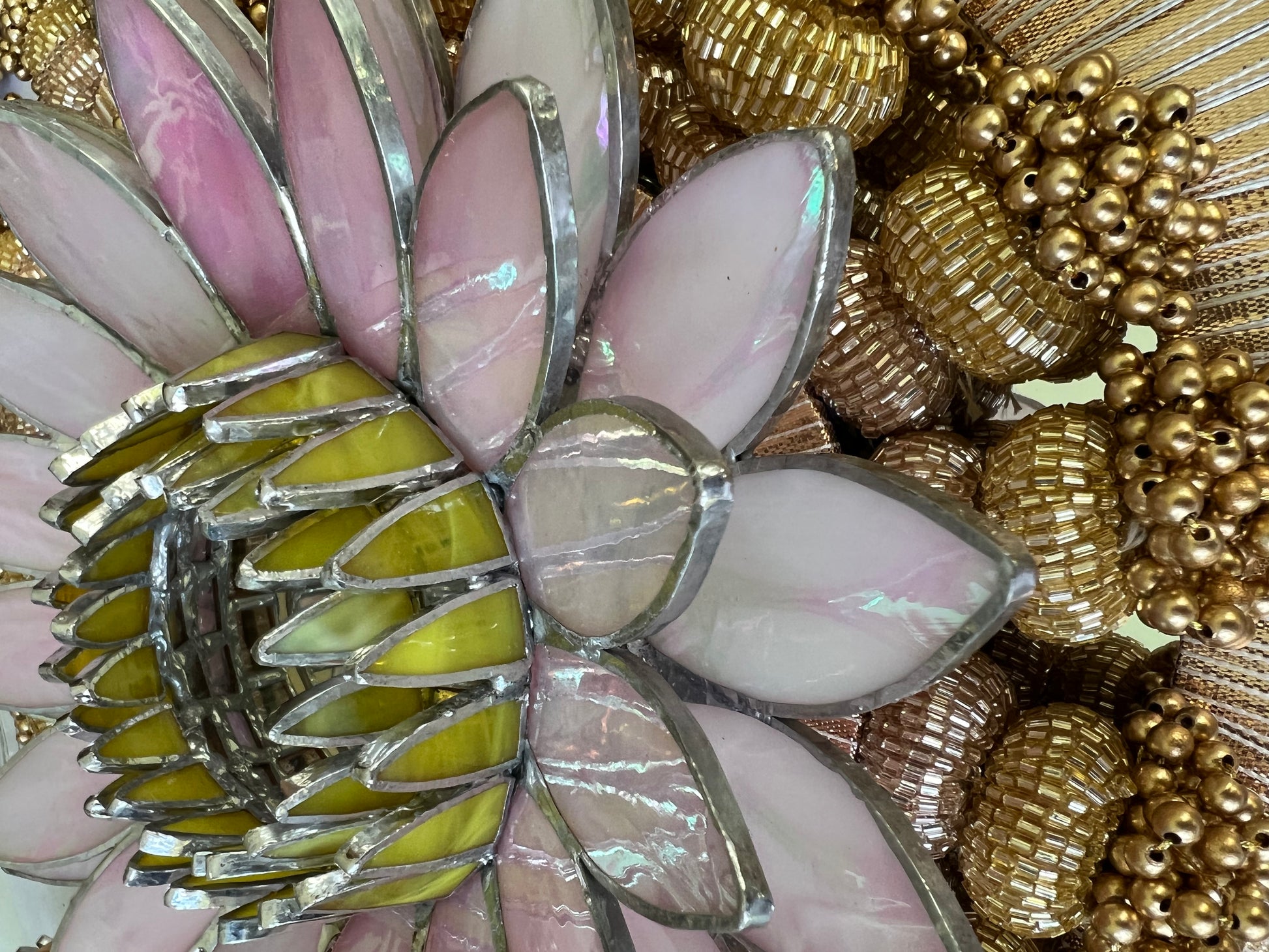 From multiple large sheets of glass, we have cut and made this entire artefact using 104 pieces of glass. If we count with colors through which the light will pass and make it even more beautiful, there are 16 pieces of Iridescent pink, 48 pieces of clear textured glass and 28 pieces of yellow-white wispy glass.