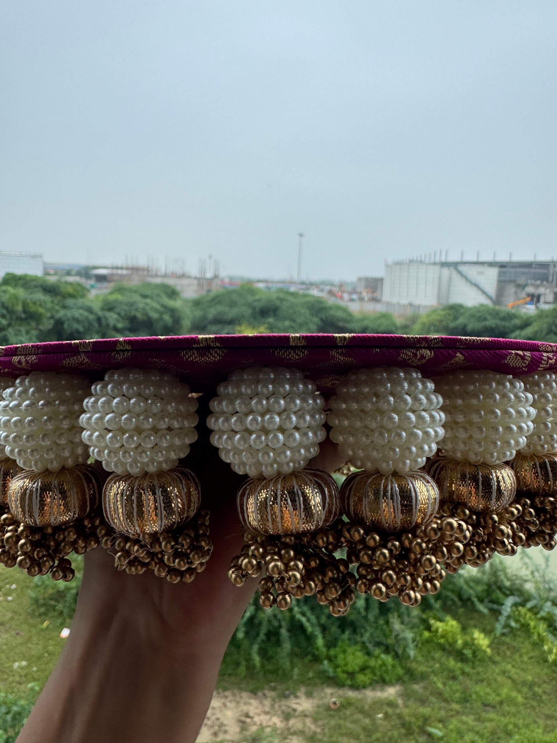 Tassels: White pearls, gota patti, wooden beads, dull golden beads