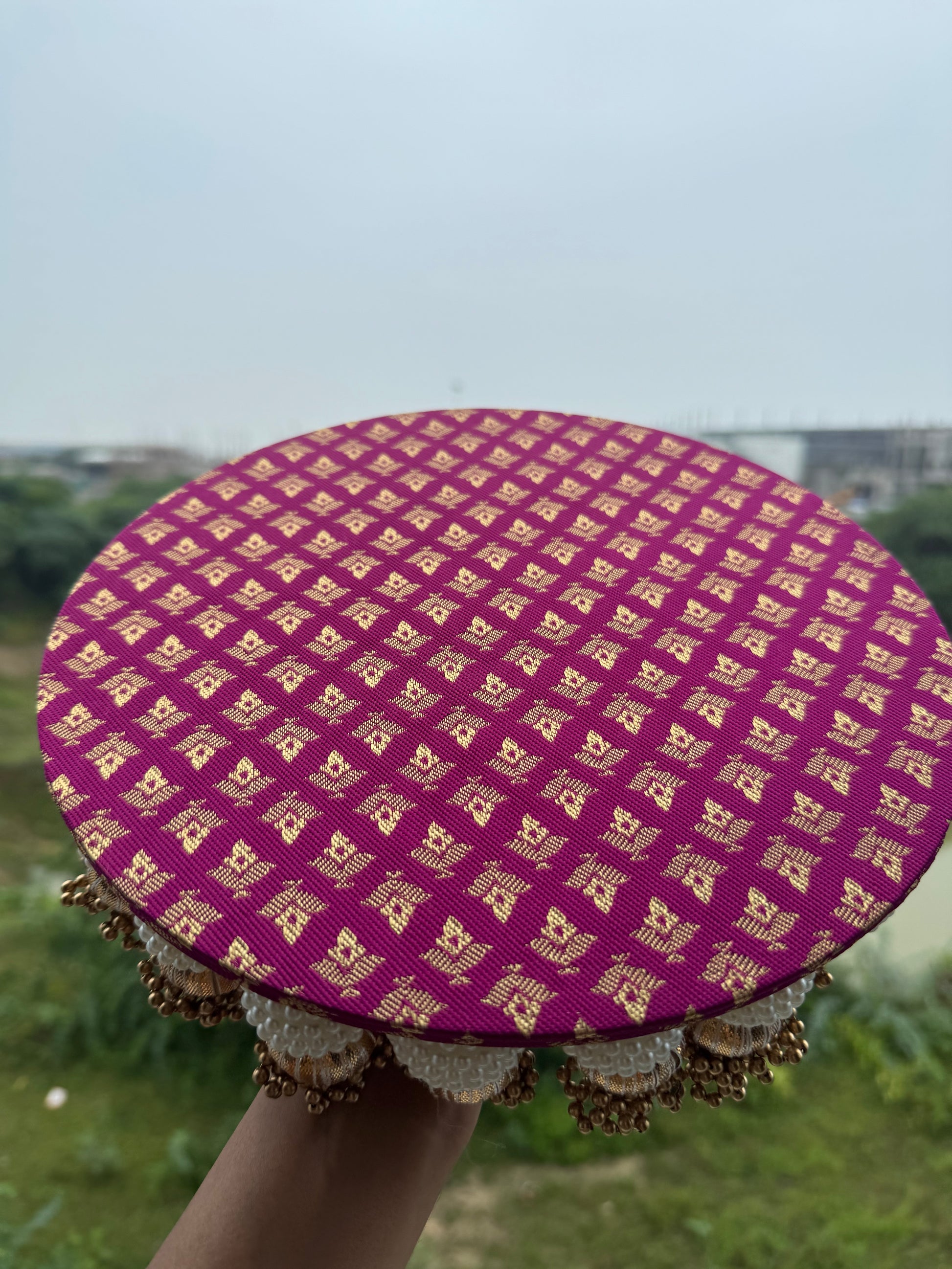 Gulabima is a gentle expression of grace and romance, inspired by the richness of deep rose-pink tones paired with the timeless shimmer of gold zari. Designed using a machine-woven rose-pink fabric, this 10-inch dangler platter beautifully balances delicate charm with traditional craftsmanship.