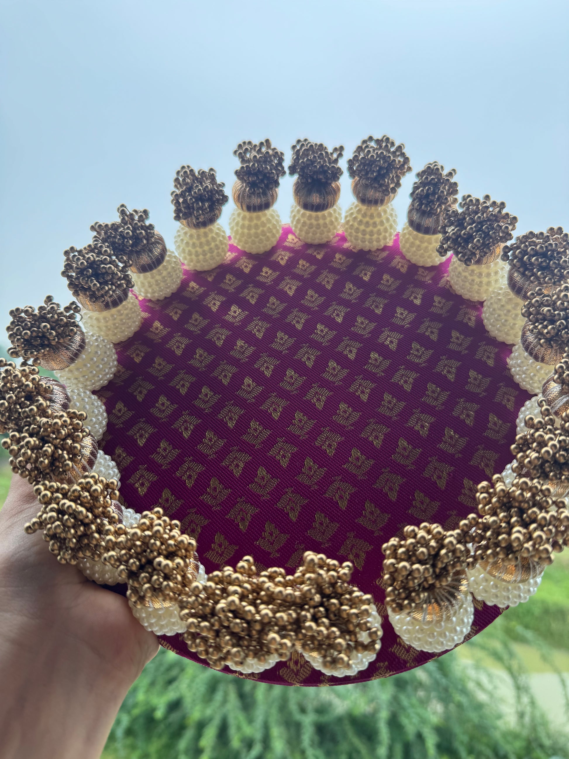 The base is lightly cushioned, offering softness and support for sacred objects or decorative setups. The platter is surrounded by handcrafted tassels featuring a thoughtful mix of white pearls, gota patti, wooden beads, and IBHI’s signature dull golden bead bunches, creating gentle movement and refined detail at every edge.