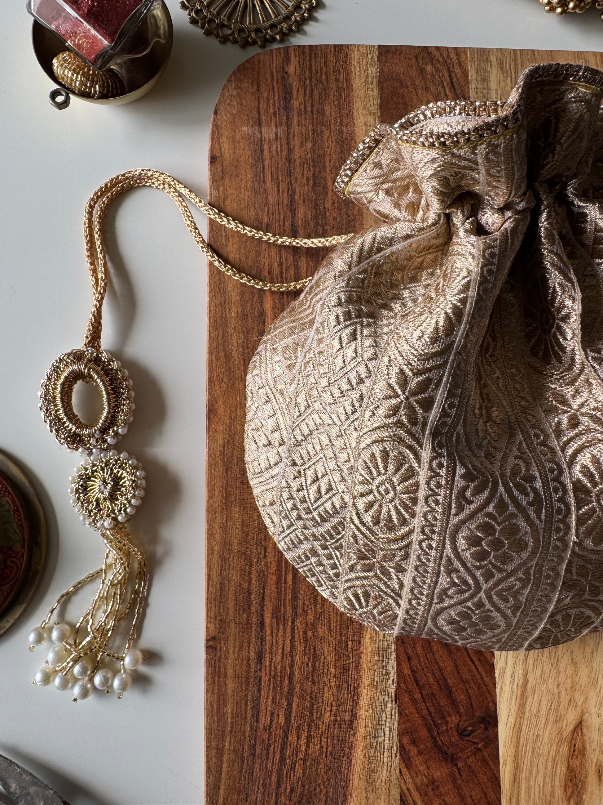 Gulkanchan Potli bag is made by stitching together embossed laces of different floral and geometric patterns. Towards the edge of the potli bag, we have given a bold metallic quilted lace.