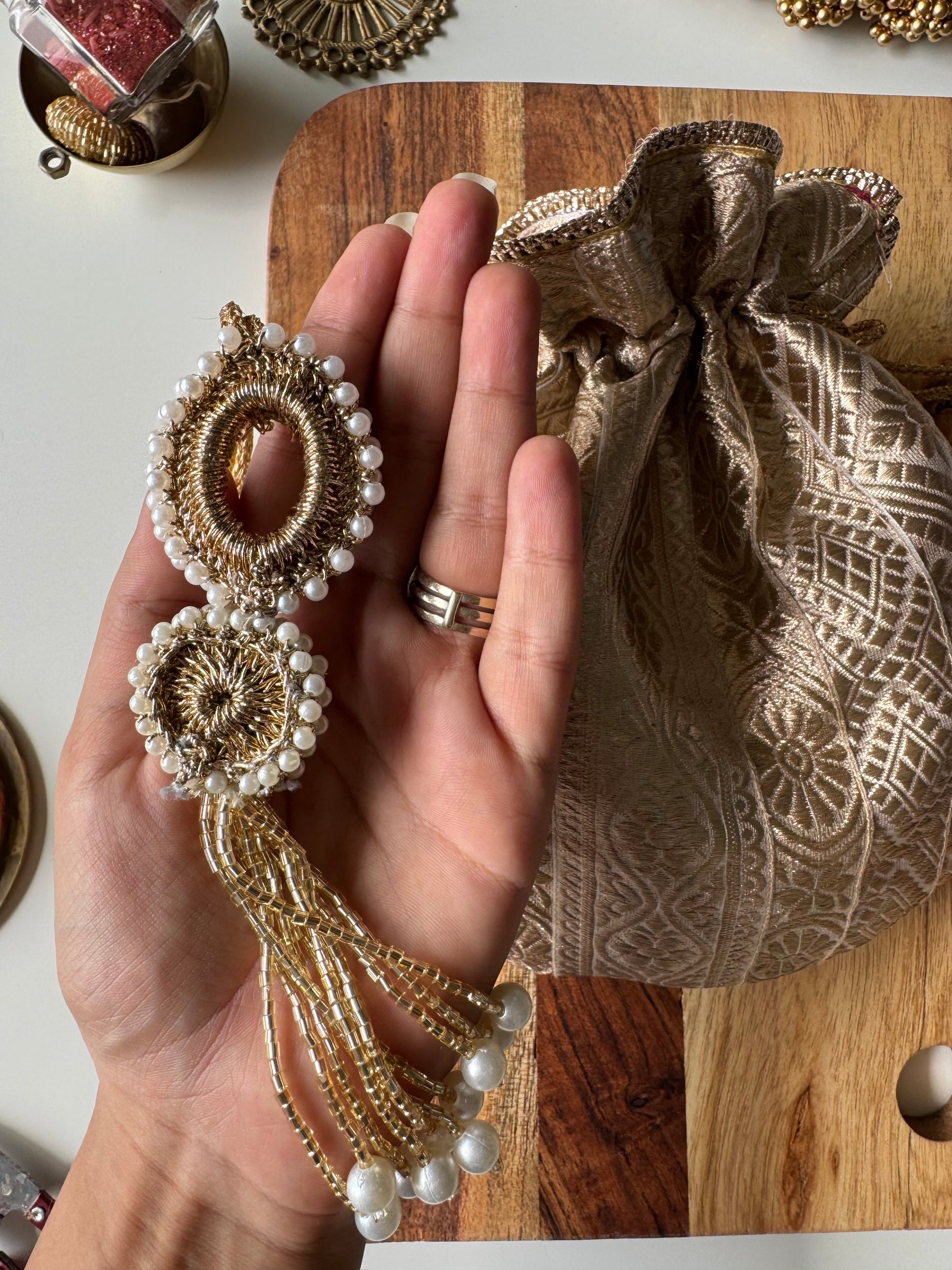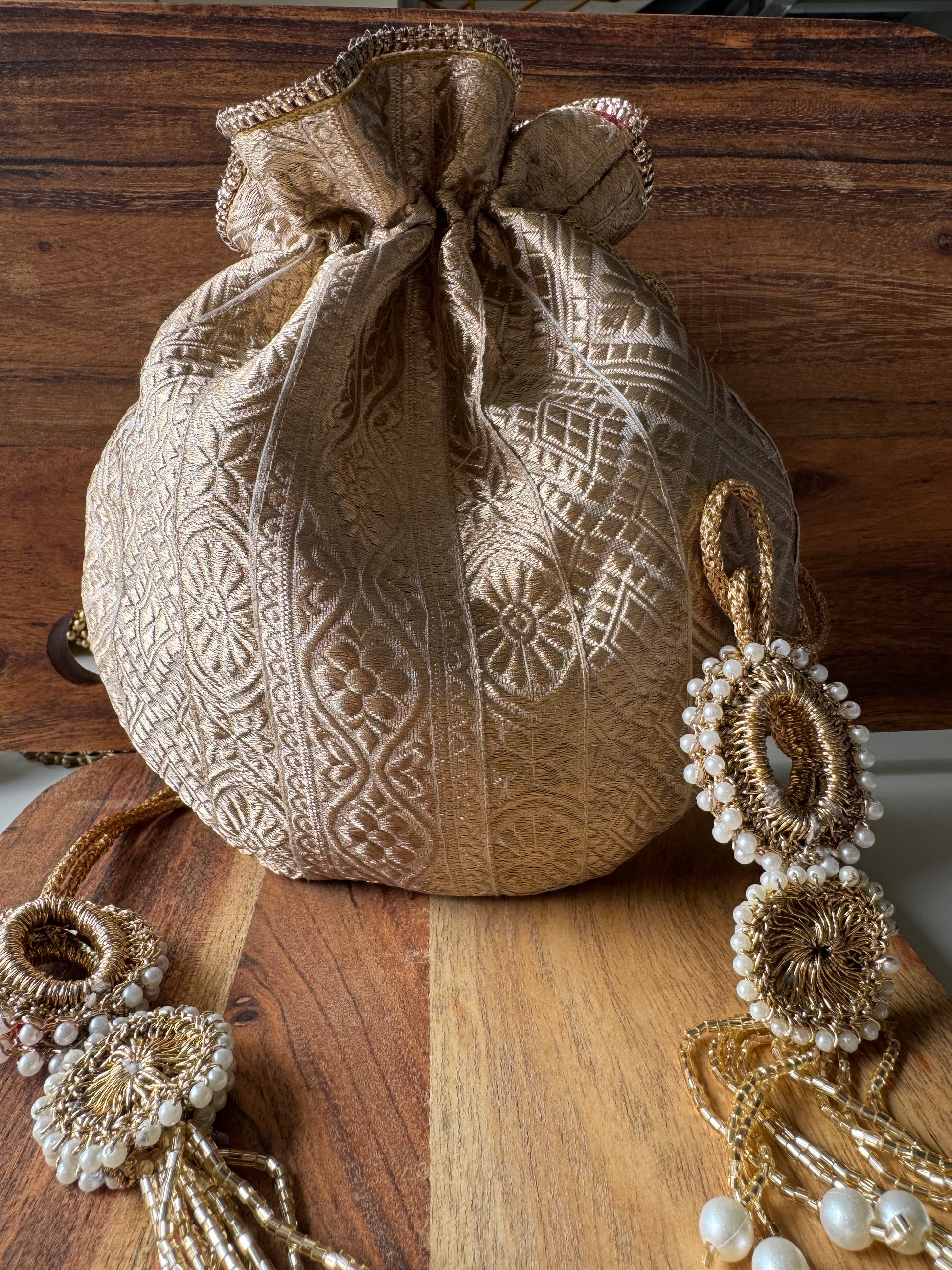 The tassels of the potli bag are made using crochet patches with pearl white beads on the periphery and a fountain style light golden and pearl white beads. They add statement and glamour to the potli bag and the bling correctly gives contrast to the matte look of the embossed panels.