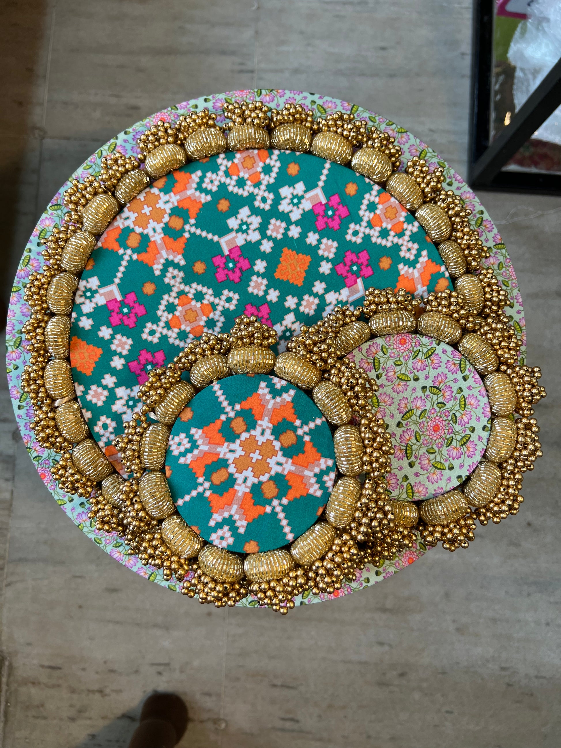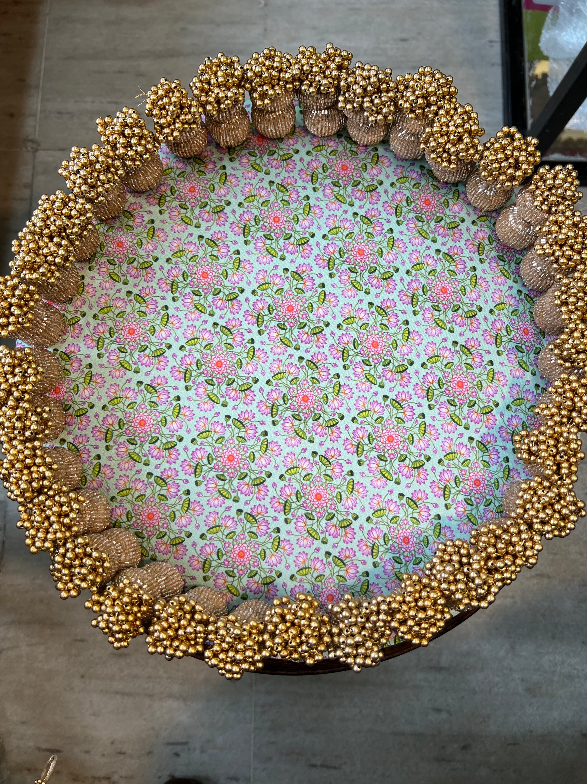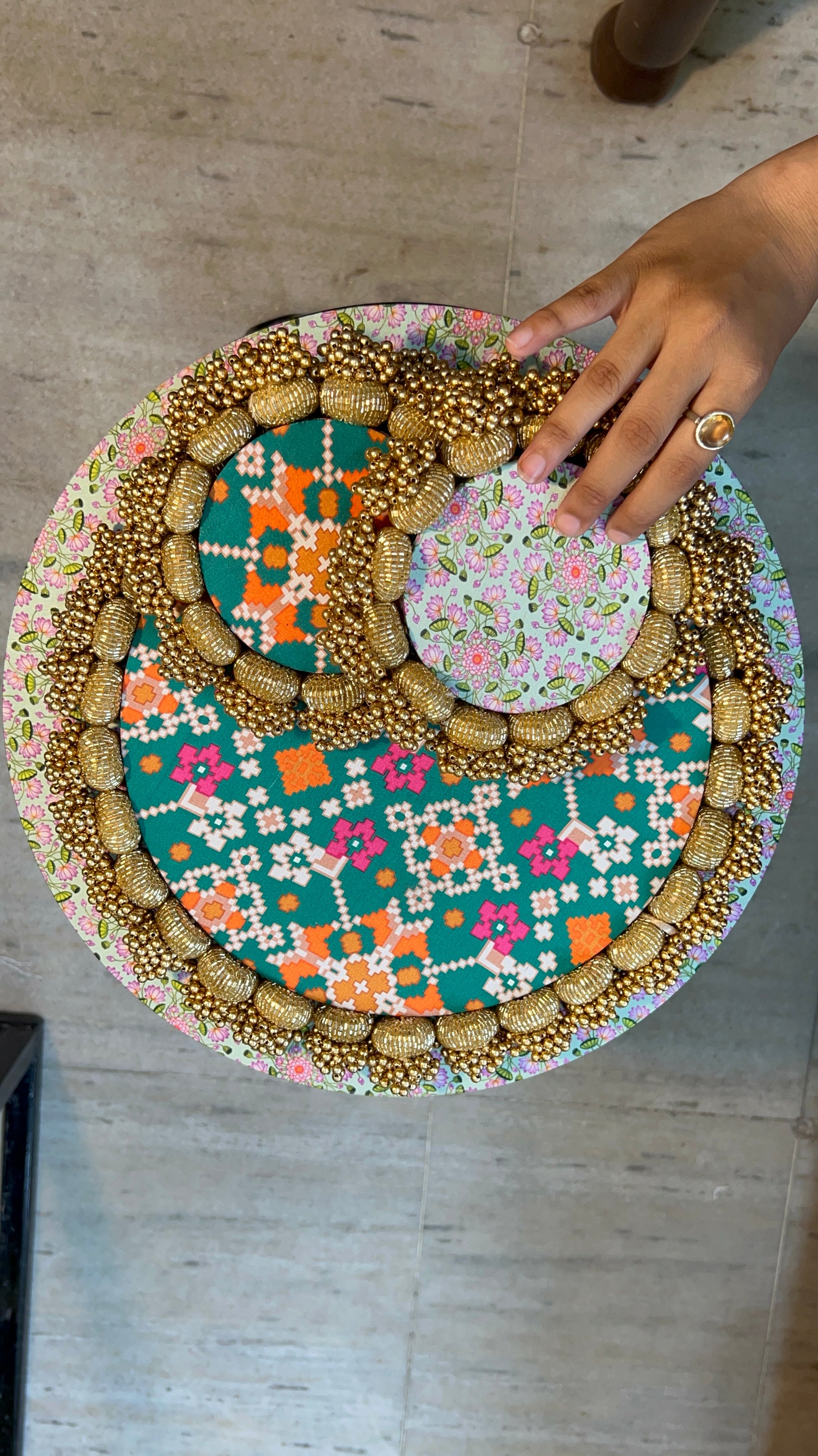 DETAILS IN DETAIL: The basal diameter of the dangler plaller is 14 inches and tassel length up to the beads is 3 inches. This platter has a solid surface below the fabric and can be used for various occasions. The beads of the platter are made using wood and cylindrical beads with metallic shine are wrapped inside-out.