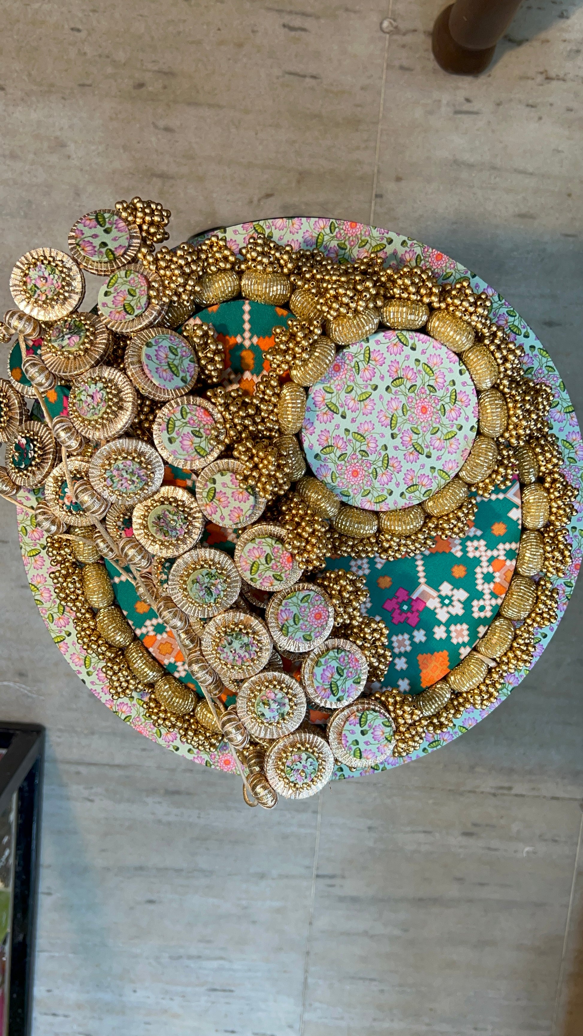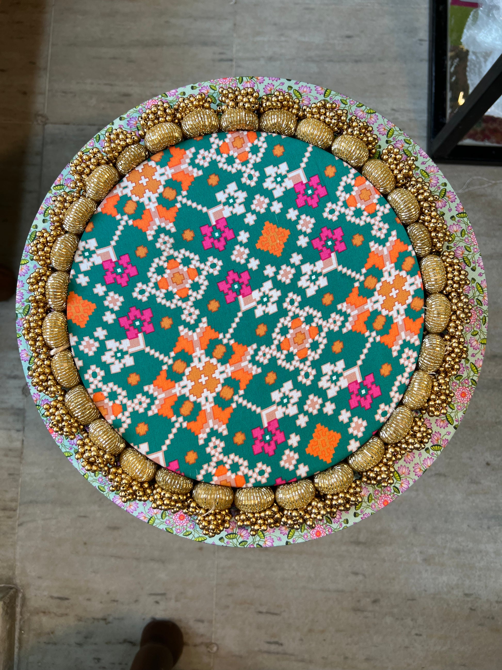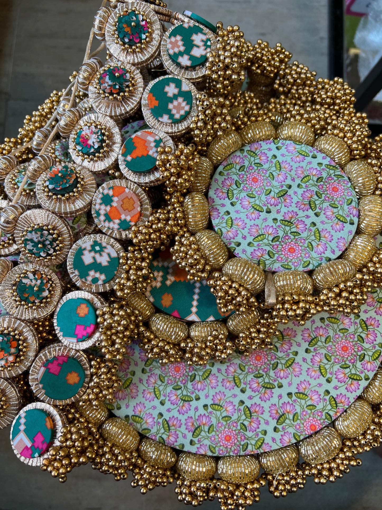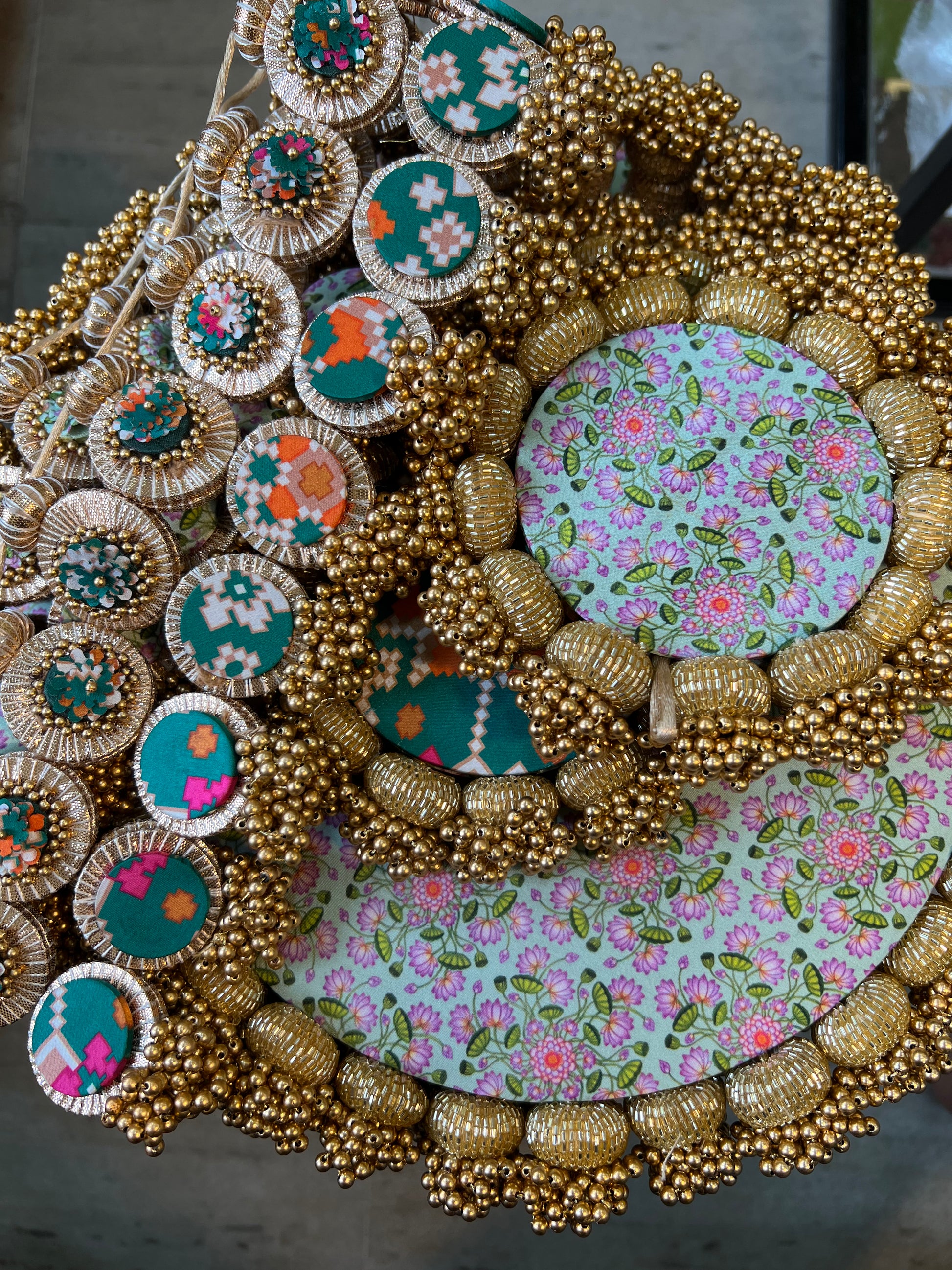 DETAILS IN DETAIL: The basal diameter of the dangler plaller is 14 inches and tassel length up to the beads is 3 inches. This platter has a solid surface below the fabric and can be used for various occasions. The beads of the platter are made using wood and cylindrical beads with metallic shine are wrapped inside-out.
