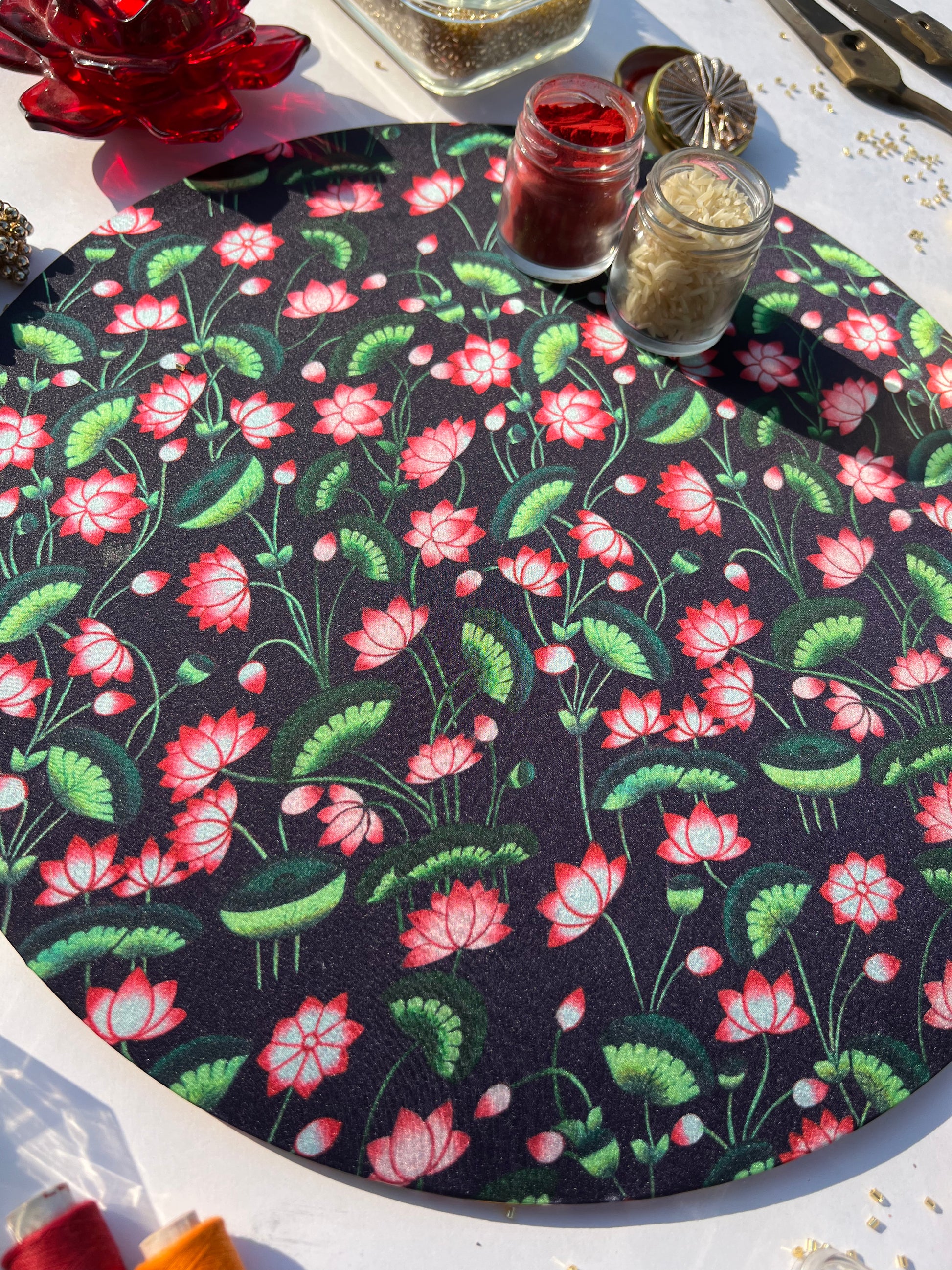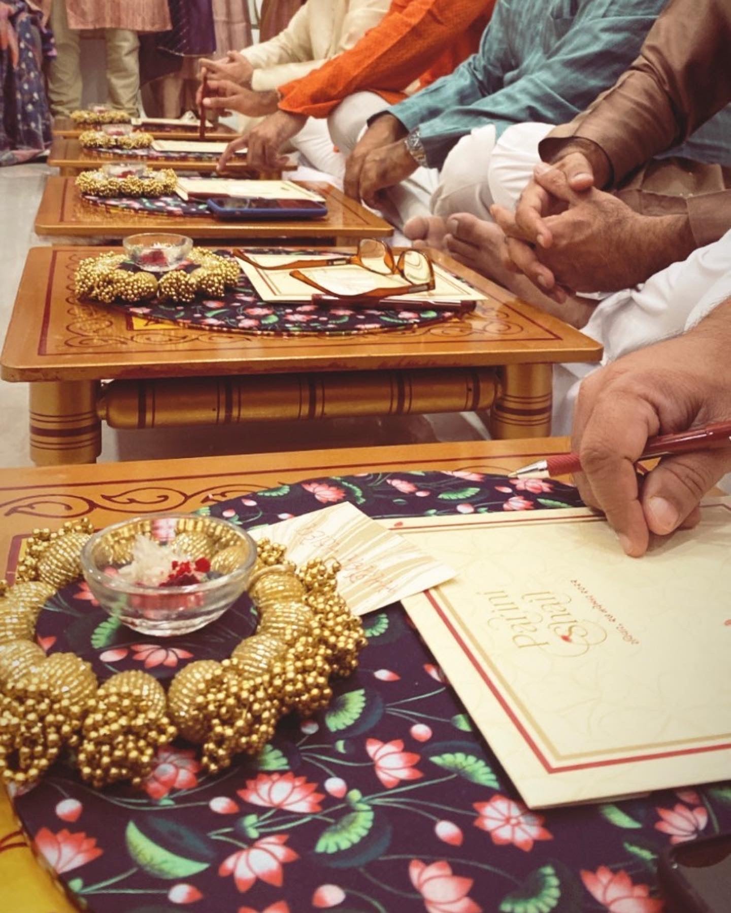 In the Hindu culture, 11 members of the family sit together and write names on the very first wedding cards. We have created pallets which can become beautiful bases for the ceremony, it is wide enough to fit wedding card, roli chawal and stationery to write.