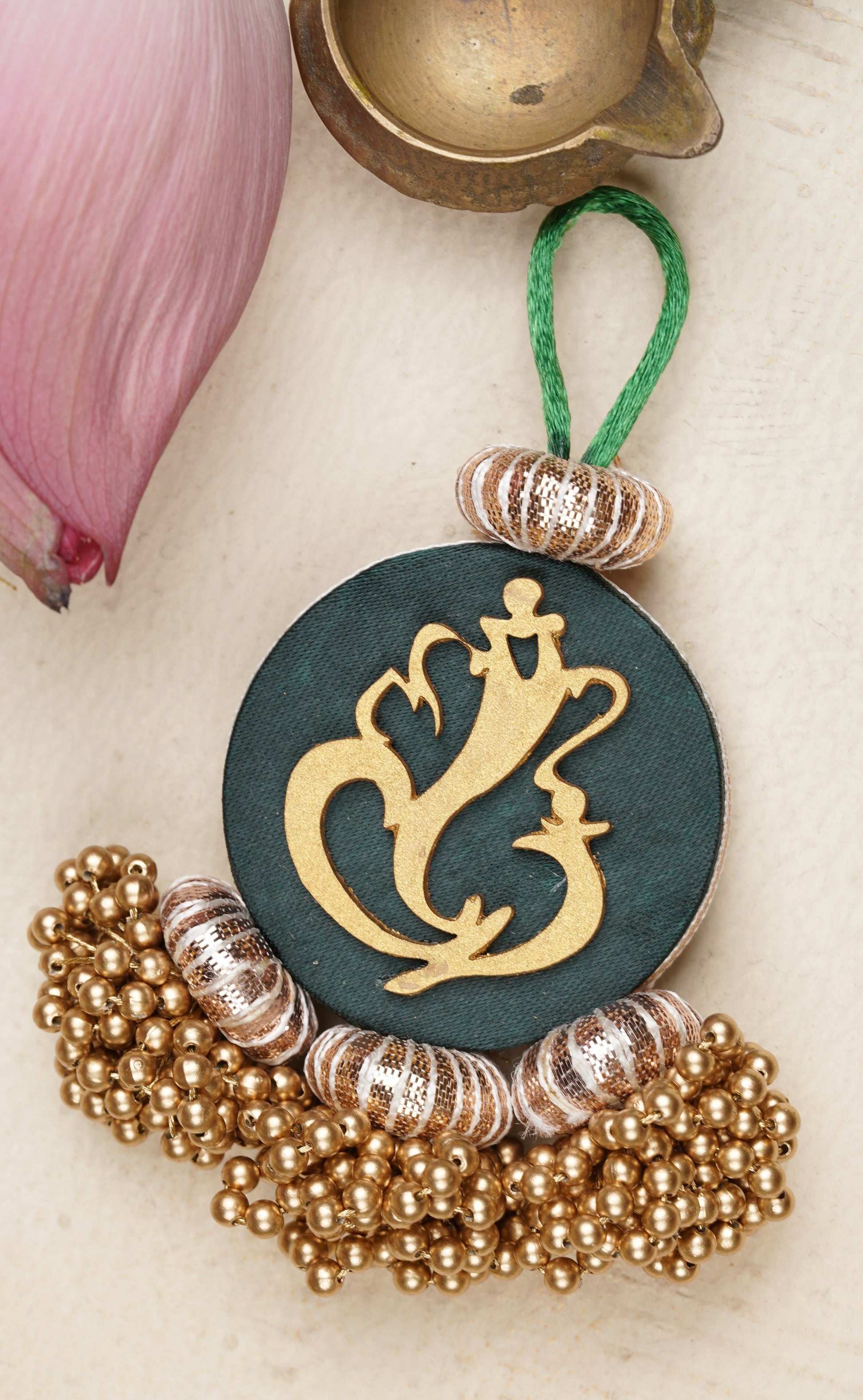 Compliment corners of your main door and mandir with this adorable charm, the solid silk background highlights the hand-painted golden motif of Ganesh.