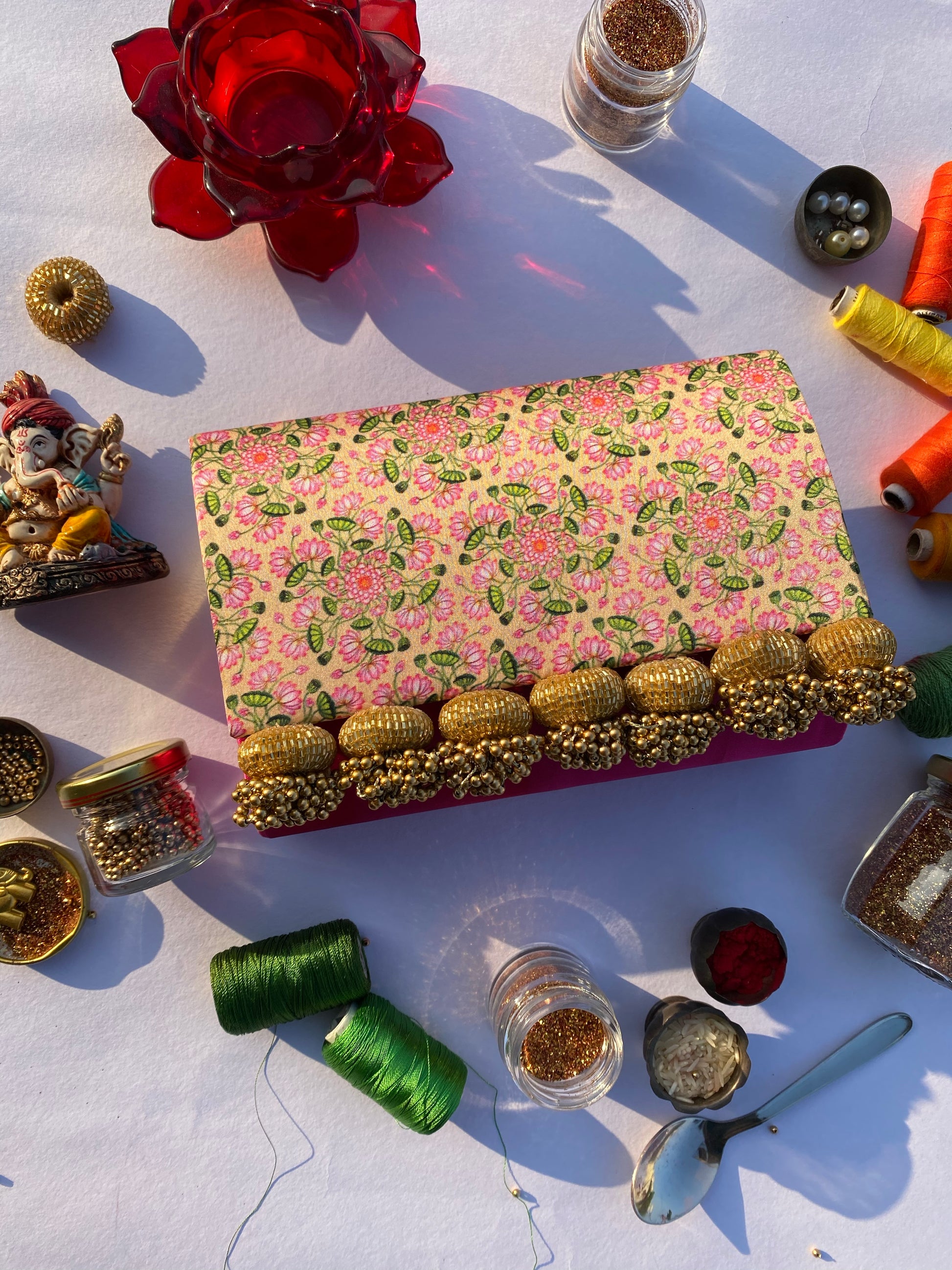 All IBHI products are meticulously handmade, involving various stages of different craftsmanship. Our creations are a blend of layers of high-quality fabric, Medium Density Fibre (MDF) for structure, and intricate beads and embellishments. The beads are meticulously connected using rolls of threads and hand stitches, adding to the uniqueness and charm of our products.