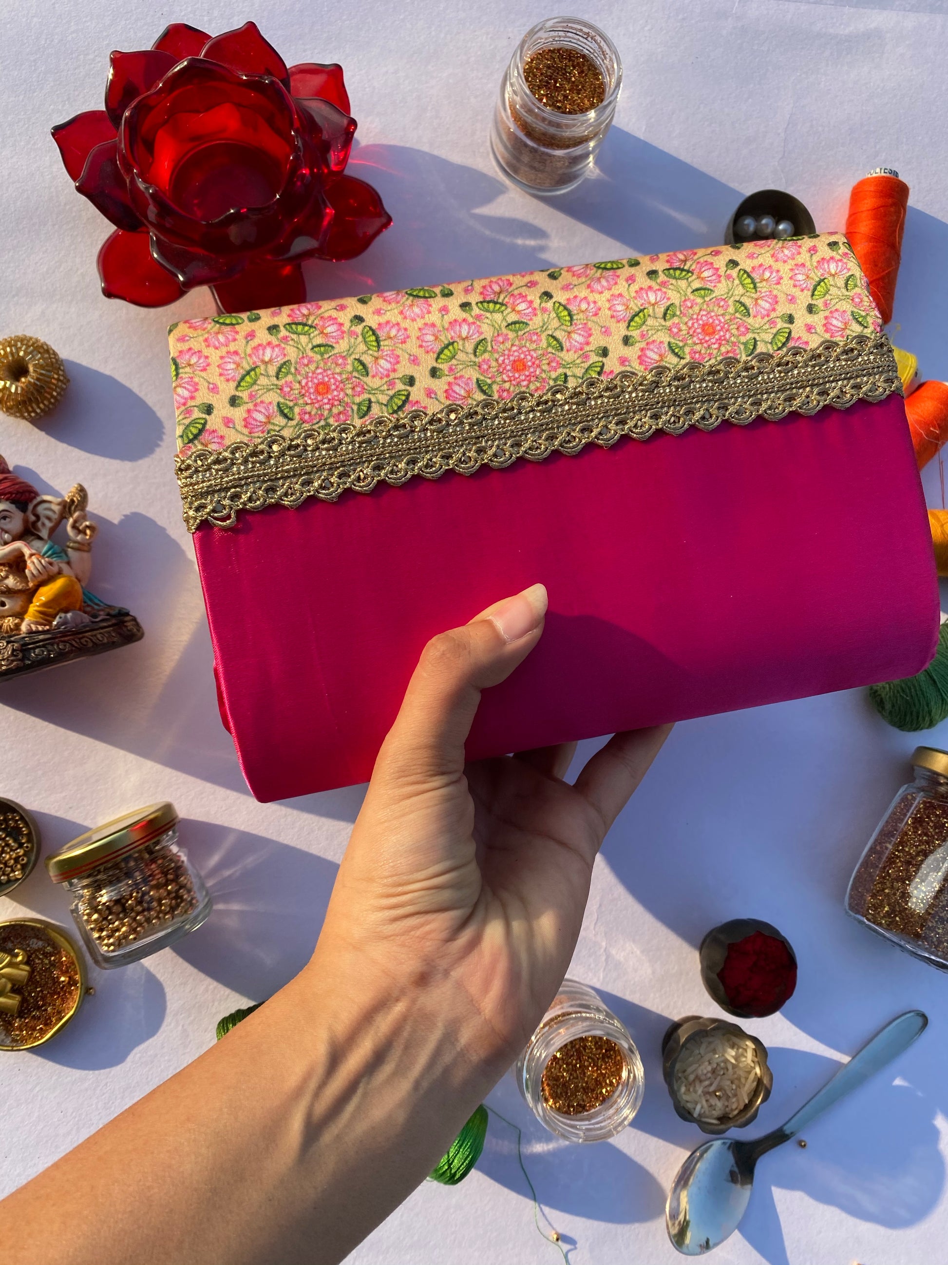 The Komal Gulaabi Divine Pichwai Clutch is an exceptional gift for weddings, Rakhi, or other ceremonies. Its blend of traditional charm and contemporary functionality makes it a memorable and thoughtful choice for loved ones.