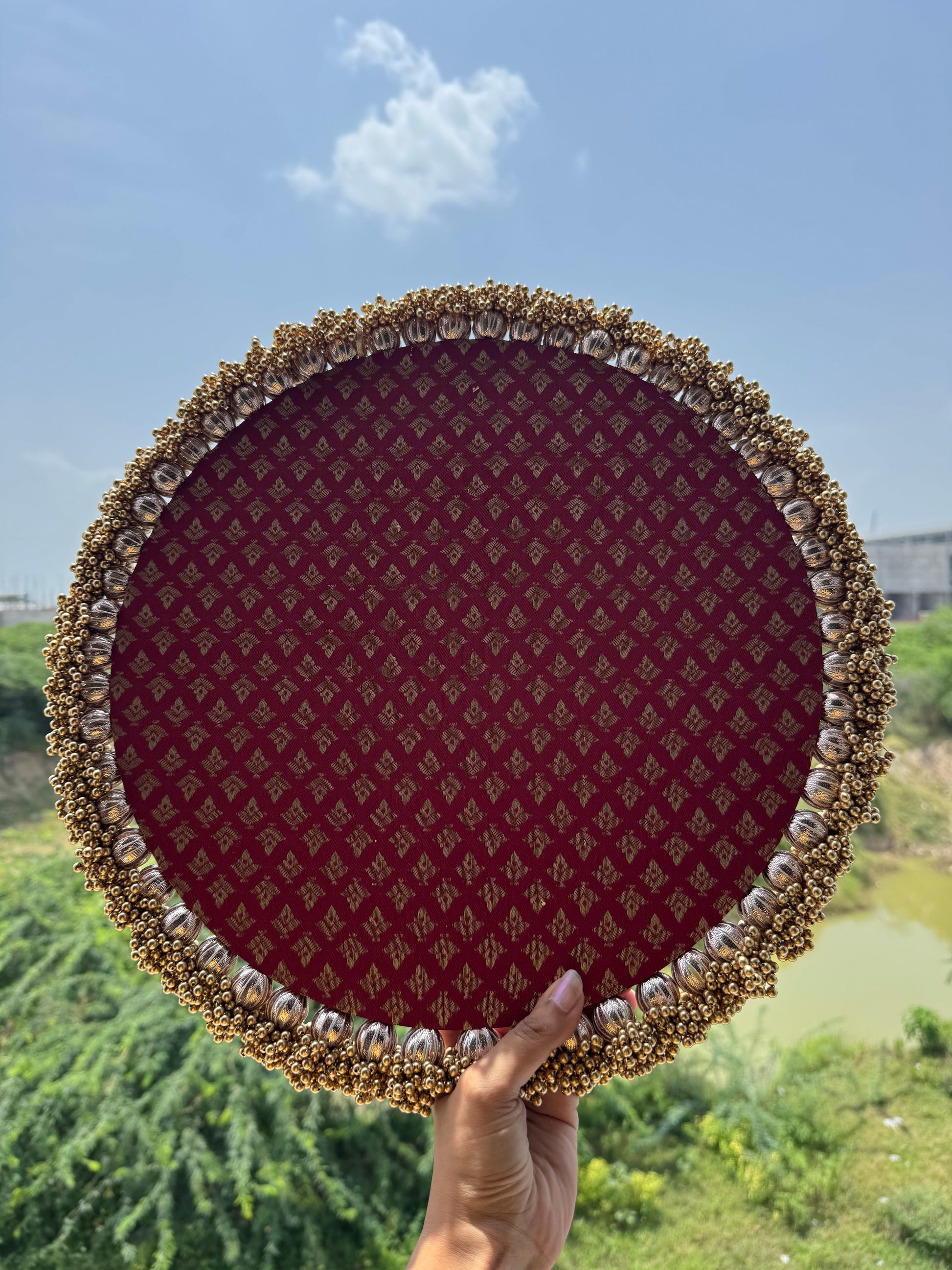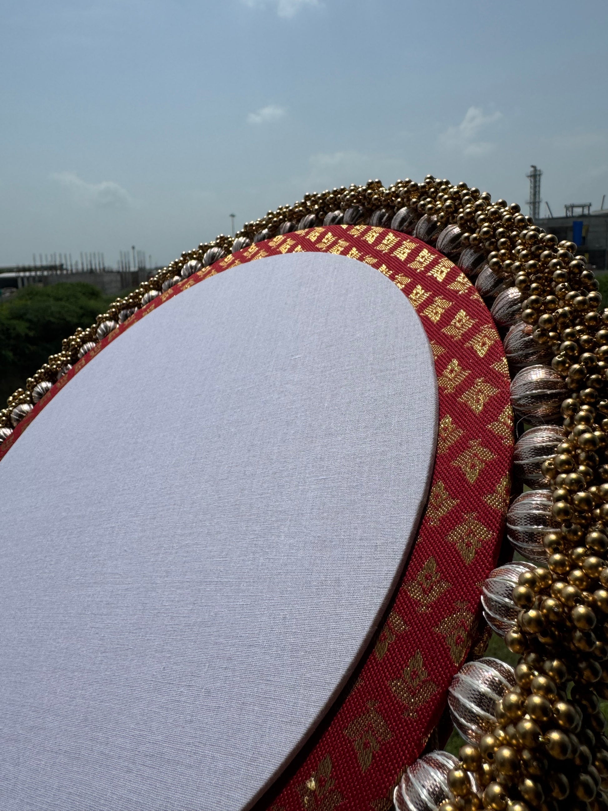 DETAILS IN DETAIL: This pallet has a plain white circular disc of 12 inches which is wrapped in white cloth, the total diameter of the platter is 16 inches. The backside is a flat disc of 14 inches basal diameter wrapped in our house woven fabric, which is a look alike banarasi.