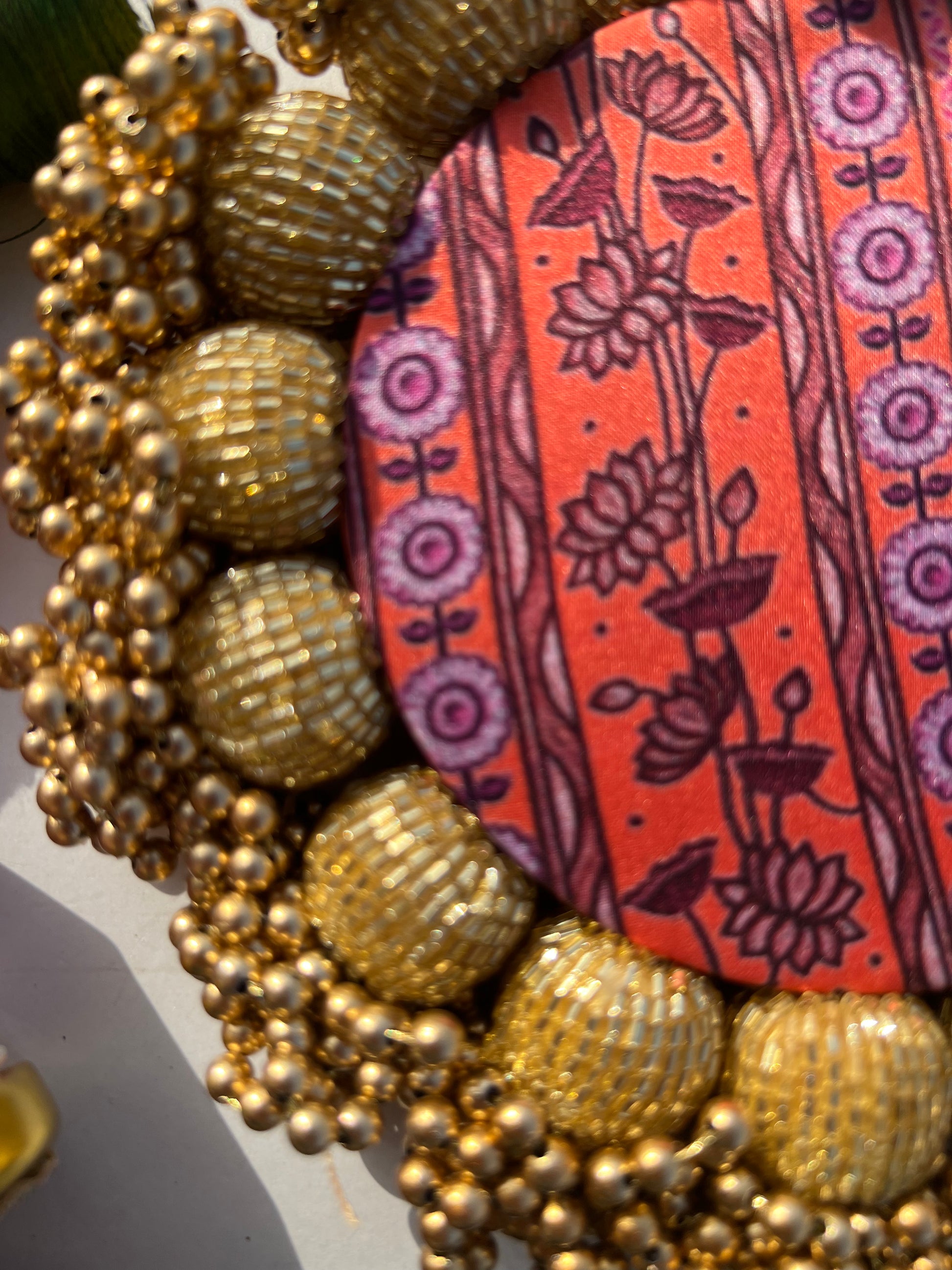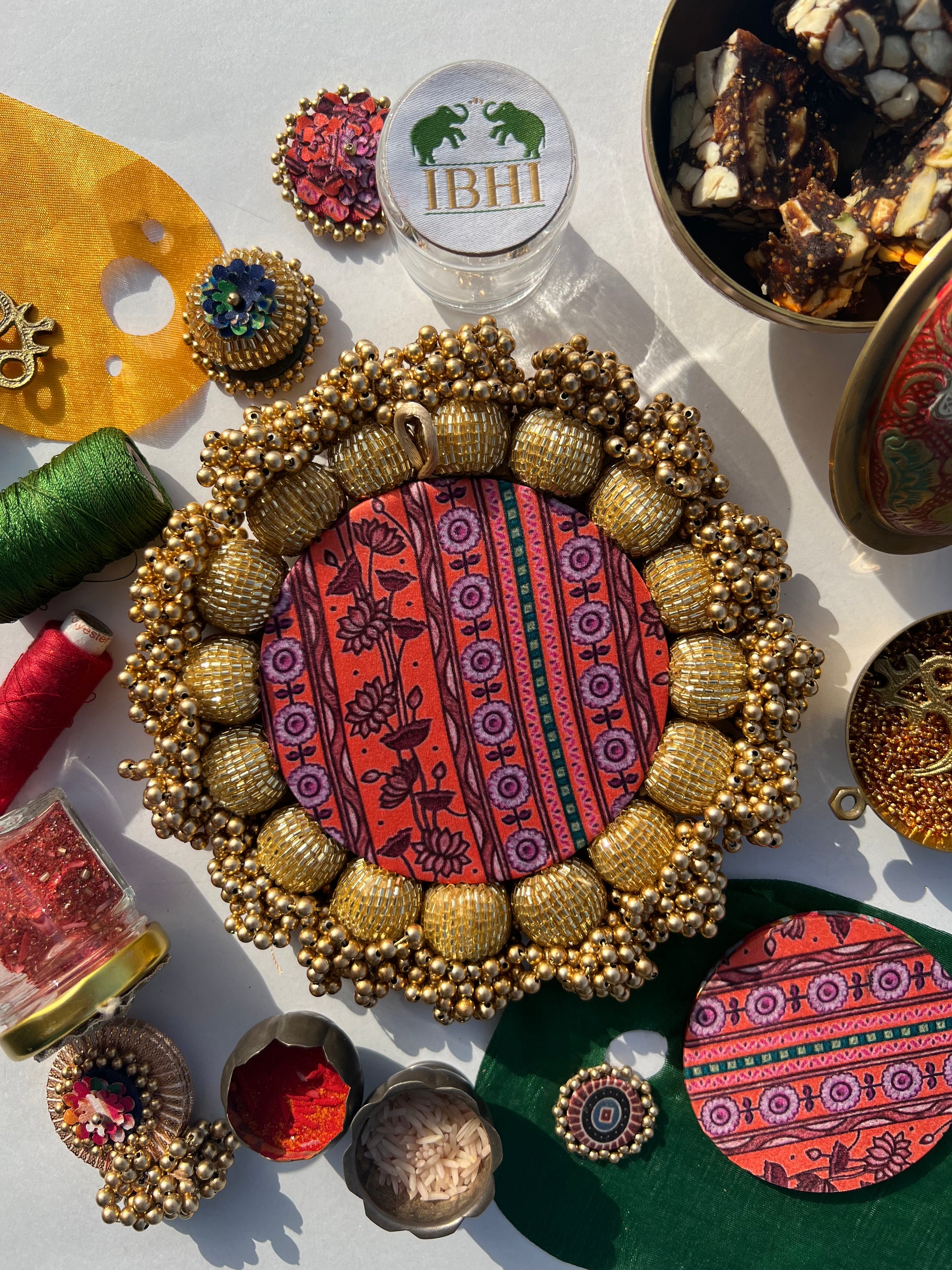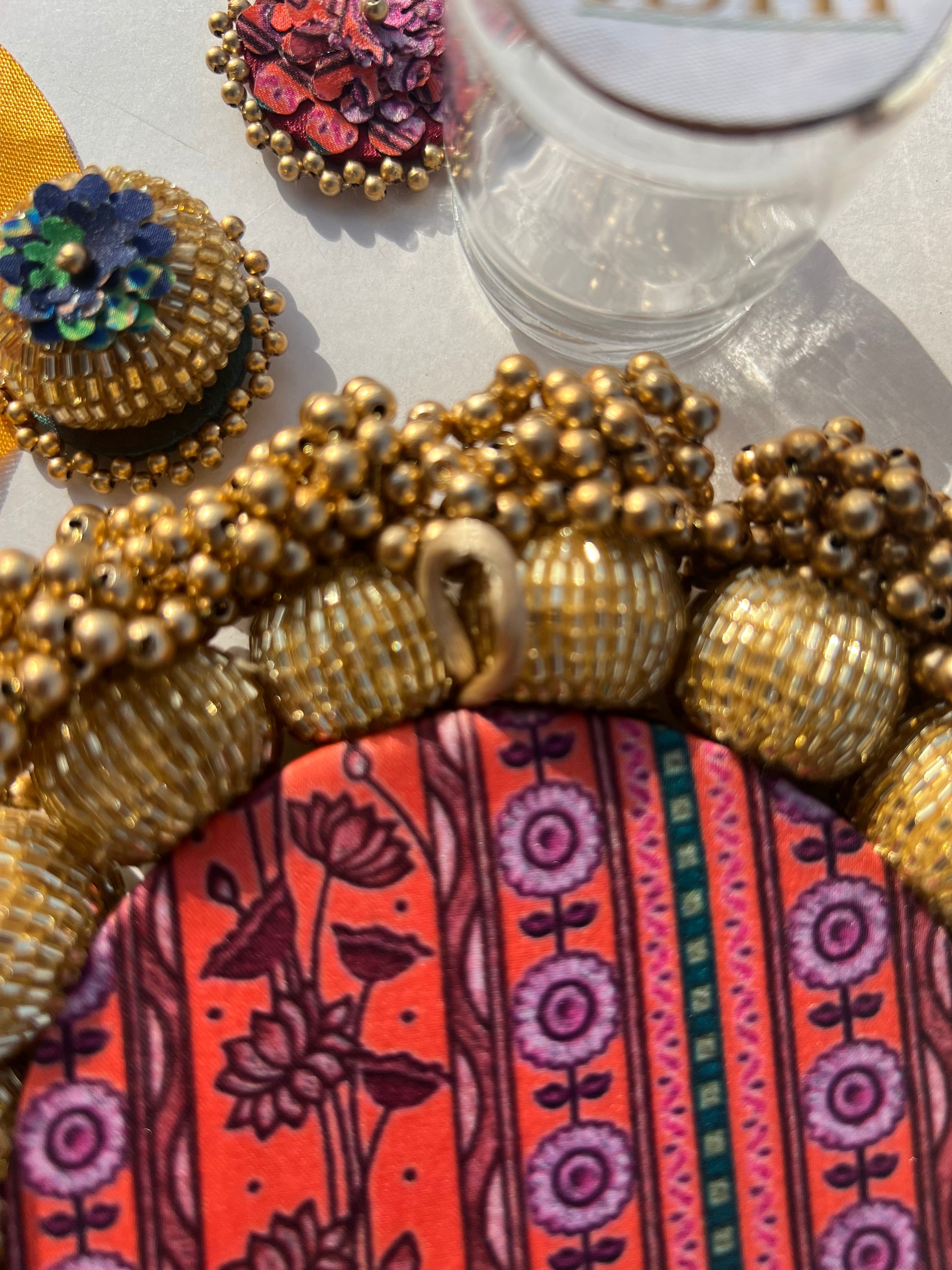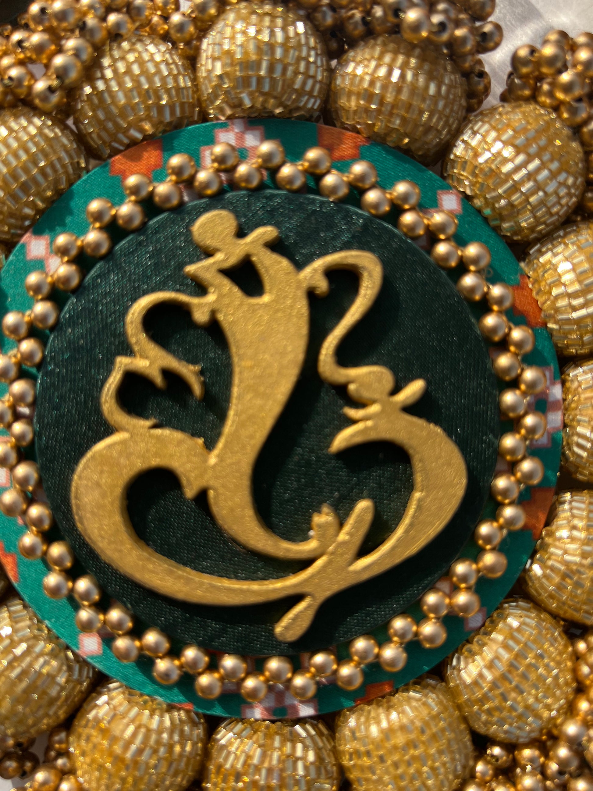 DETAILS IN DETAIL: Our IBHI is made using historic-heritage textiles of India, so of course this IBHI has its own history, not very old though. This IBHI was designed and created to place diyas and candles during the festive season, yet it evolved as a multi-purpose and versatile pallet. It is a stand alone single piece beauty, it has two different sides, it is covered in flat digital print on one side and beaded disc with Ganesh on another- which makes it two-sided. The basal diameter of this pallet is 4 inches, it is firm and sturdy. The pallet has 16 tassels on the periphery which are hand-sewn on at the base, the spherical beads are made using pine wood with cylindrical rose gold beads wrapped inside out. Each sphere has a bunch of 126 fibre based dull golden beads. Along with the tassles, the total diameter of the pallet is 7 inches.