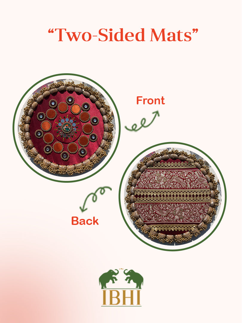 We have harmonized the art of Mandala with our Parsi Gara design of Rangoli, it has a deep & subtle parsi gara border on one side and solid radiant colour on the other side with a Mandala pattern made using beaded discs and buffed flowers.