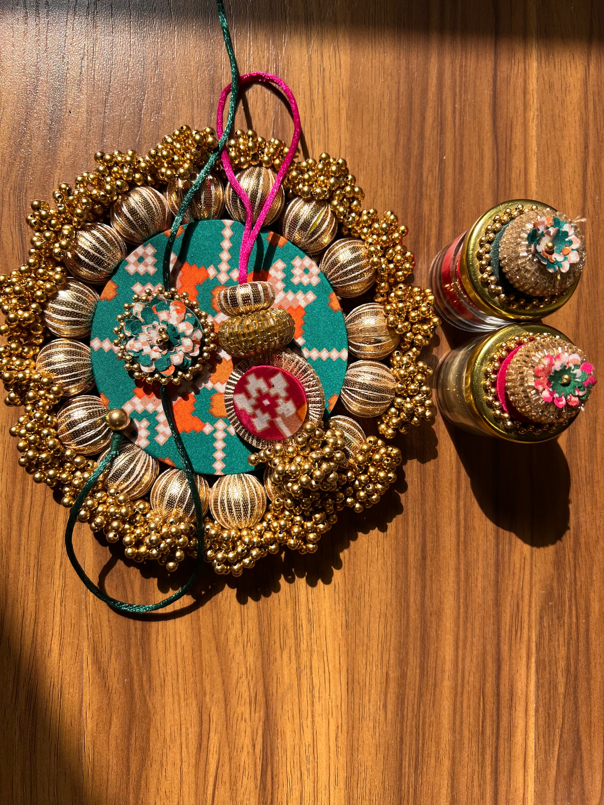 Joker Poker Rakhi set: Bottle Green + Pink Navratna Patola