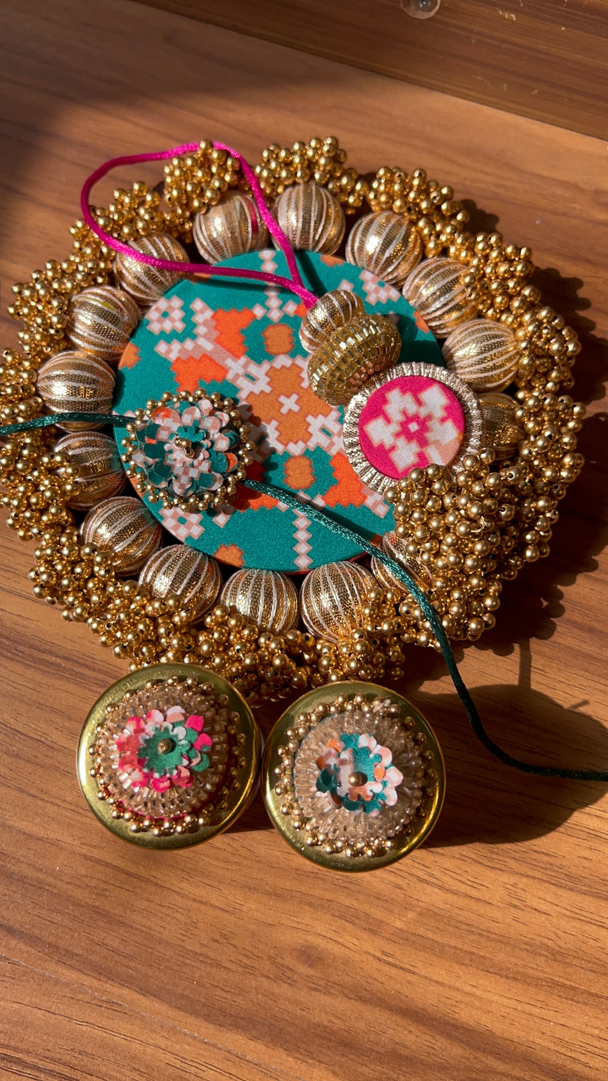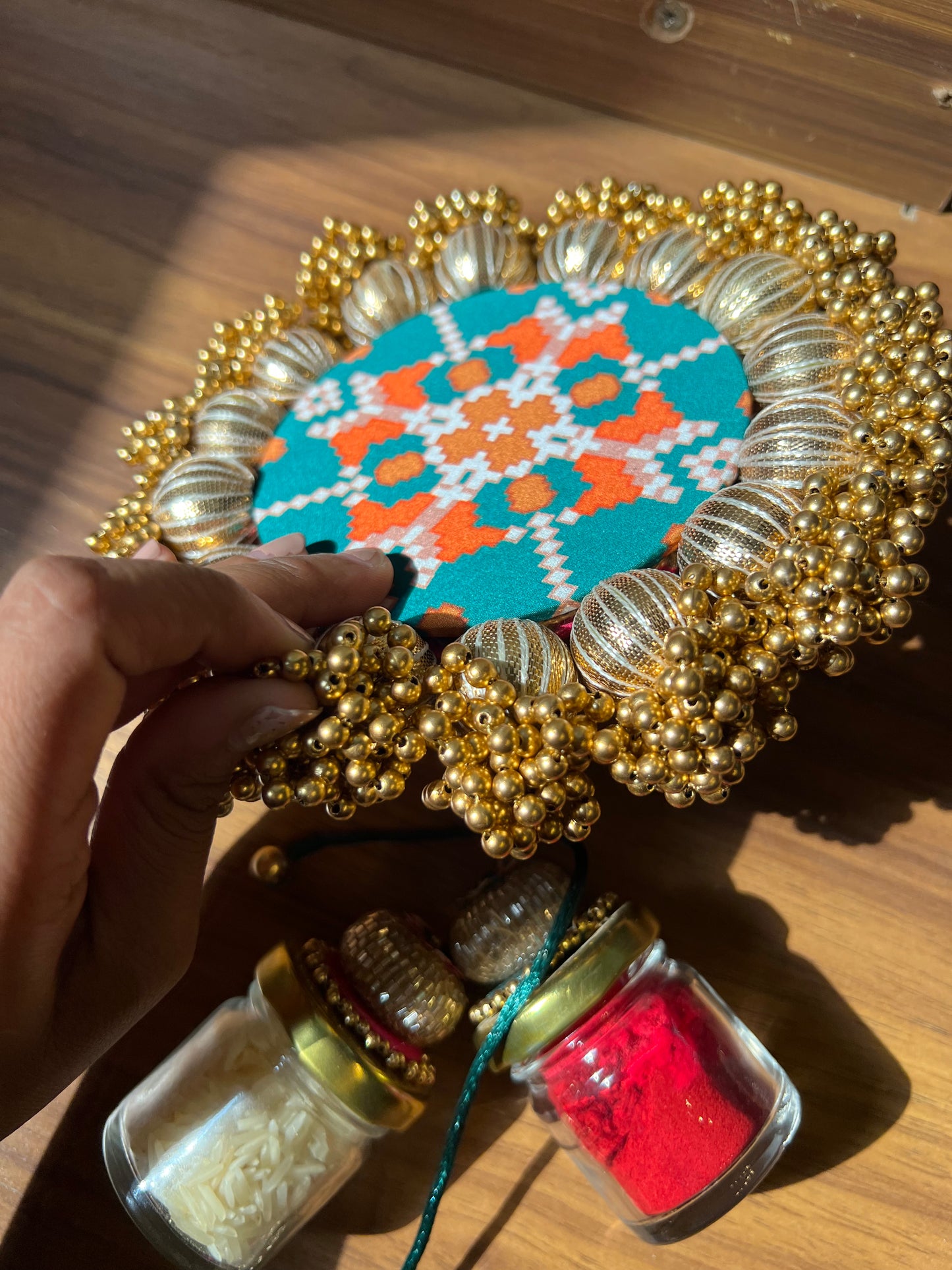 DETAILS IN DETAIL: Our IBHI is made using historic-heritage textiles of India, so of course this IBHI has its own history, not very old though. This IBHI was designed and created to place diyas and candles during the festive season, yet it evolved as a multi-purpose and versatile pallet. It is a stand alone single piece beauty, it has two different sides, it is covered in flat digital print on both sides- which makes it two-sided. The basal diameter of this pallet is 4 inches, it is firm and sturdy. The pallet has 17 tassels on the periphery which are hand-sewn on at the base, the spherical beads are made using plastic with rose gold tone gota patti wrapped inside out. Each sphere has a bunch of 85 fibre based dull golden beads. Along with the tassles, the total diameter of the pallet is 7 inches.