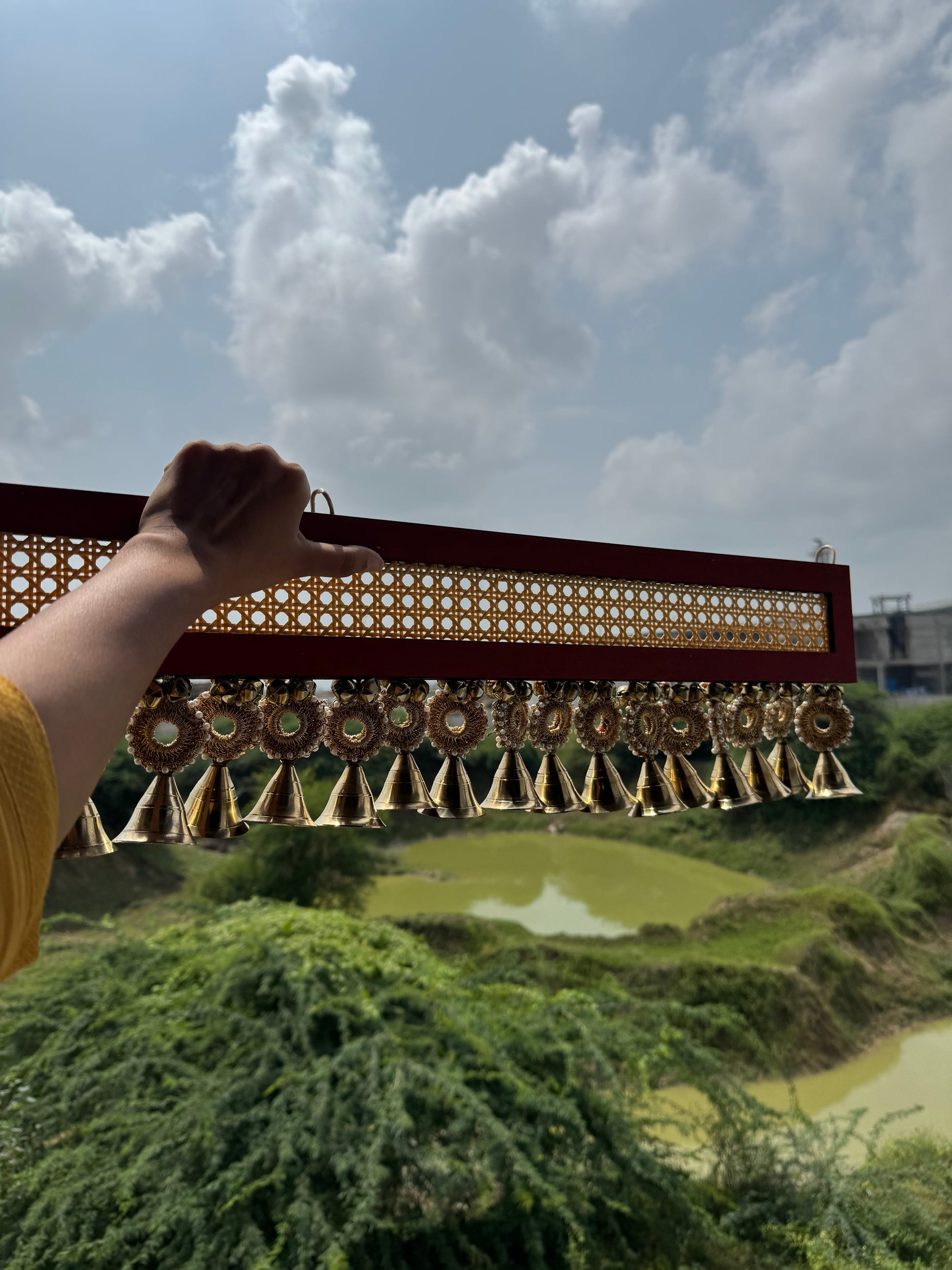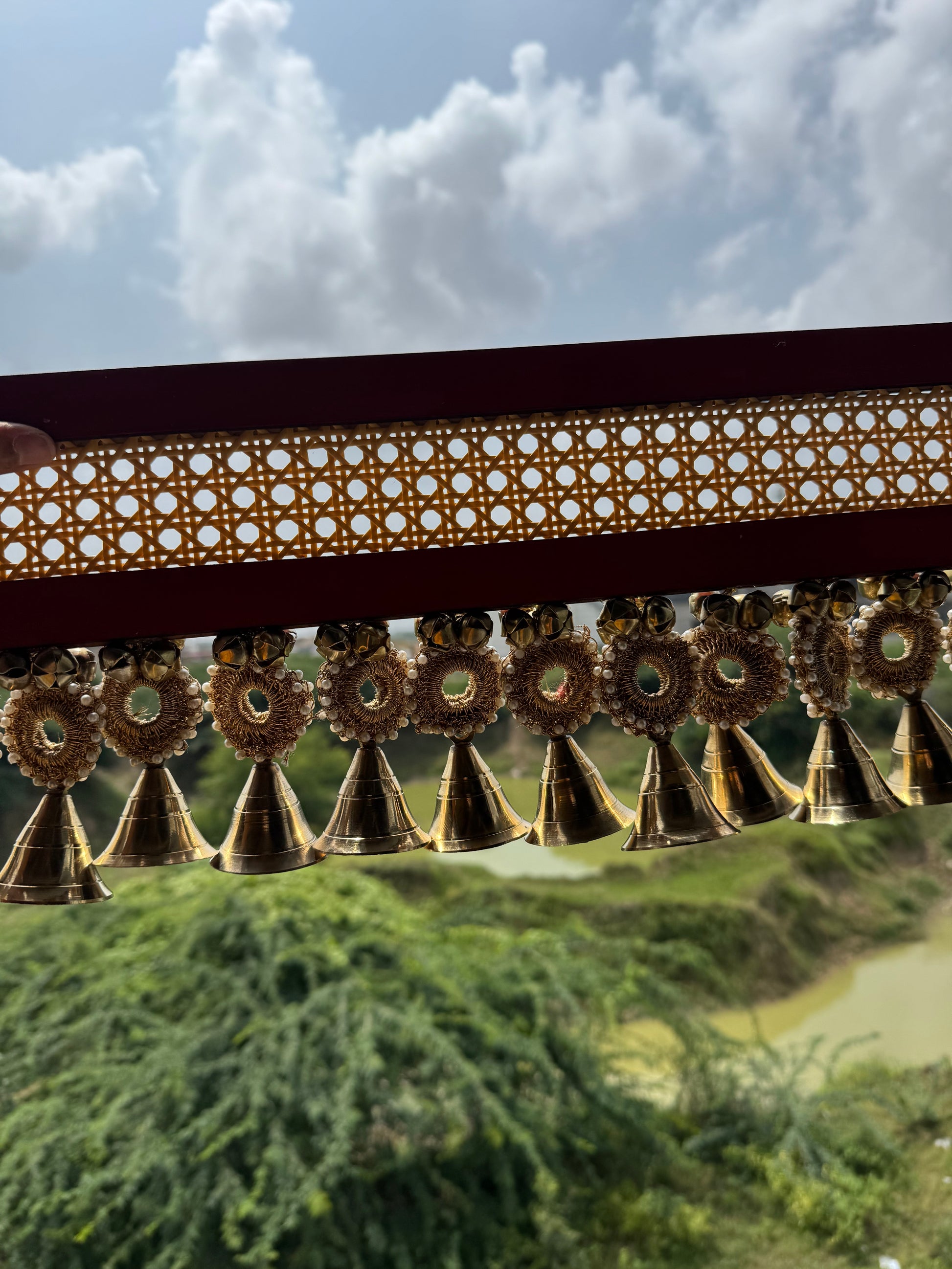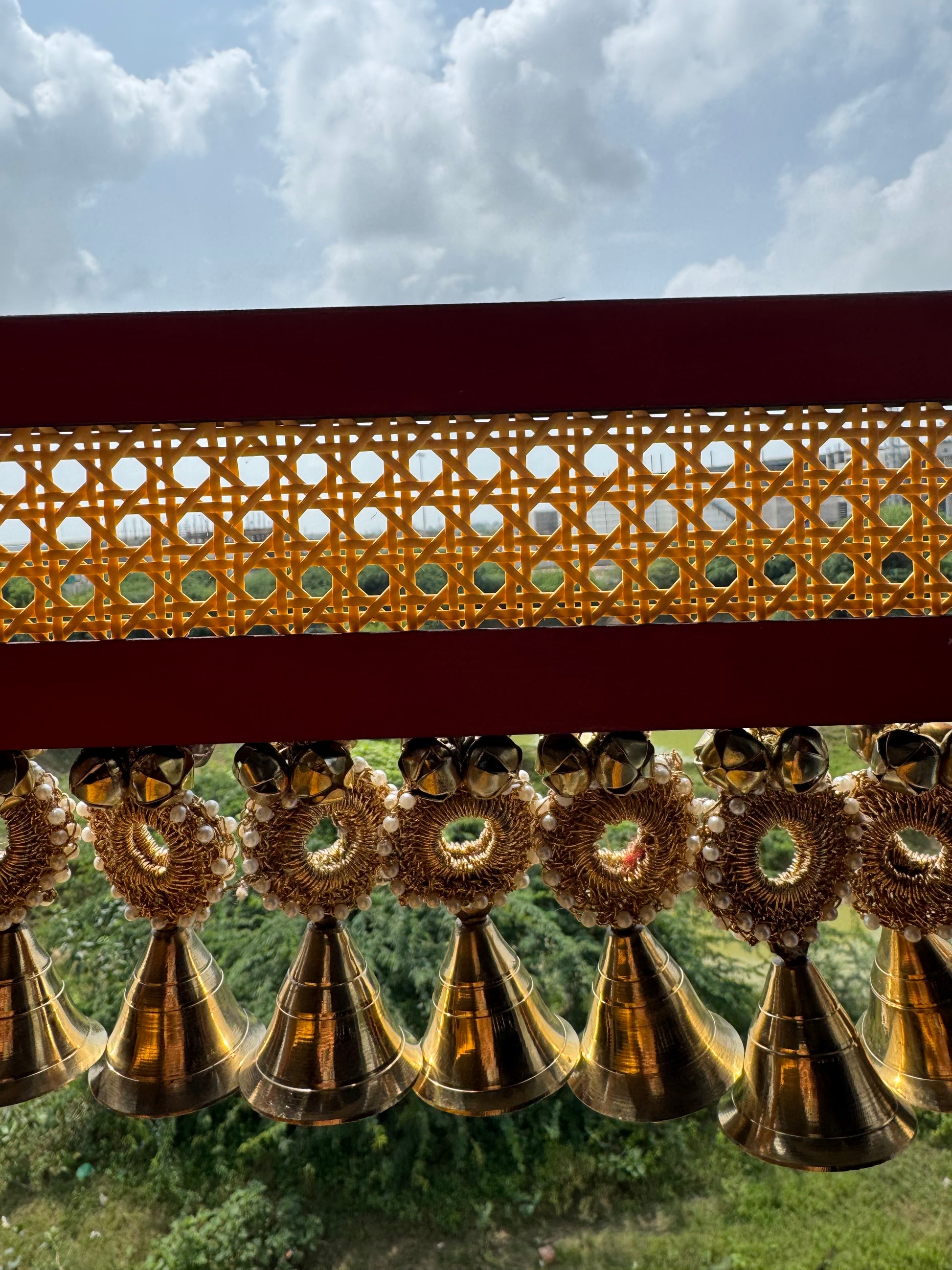 This handcrafted masterpiece carries the soul of India in every detail. From the real brass bells that chime with tradition, to the rattan centerpiece adorned with crochet and bell torans, and even the hand-painted panel in classic Indian red – this toran is a celebration of timeless artistry.
