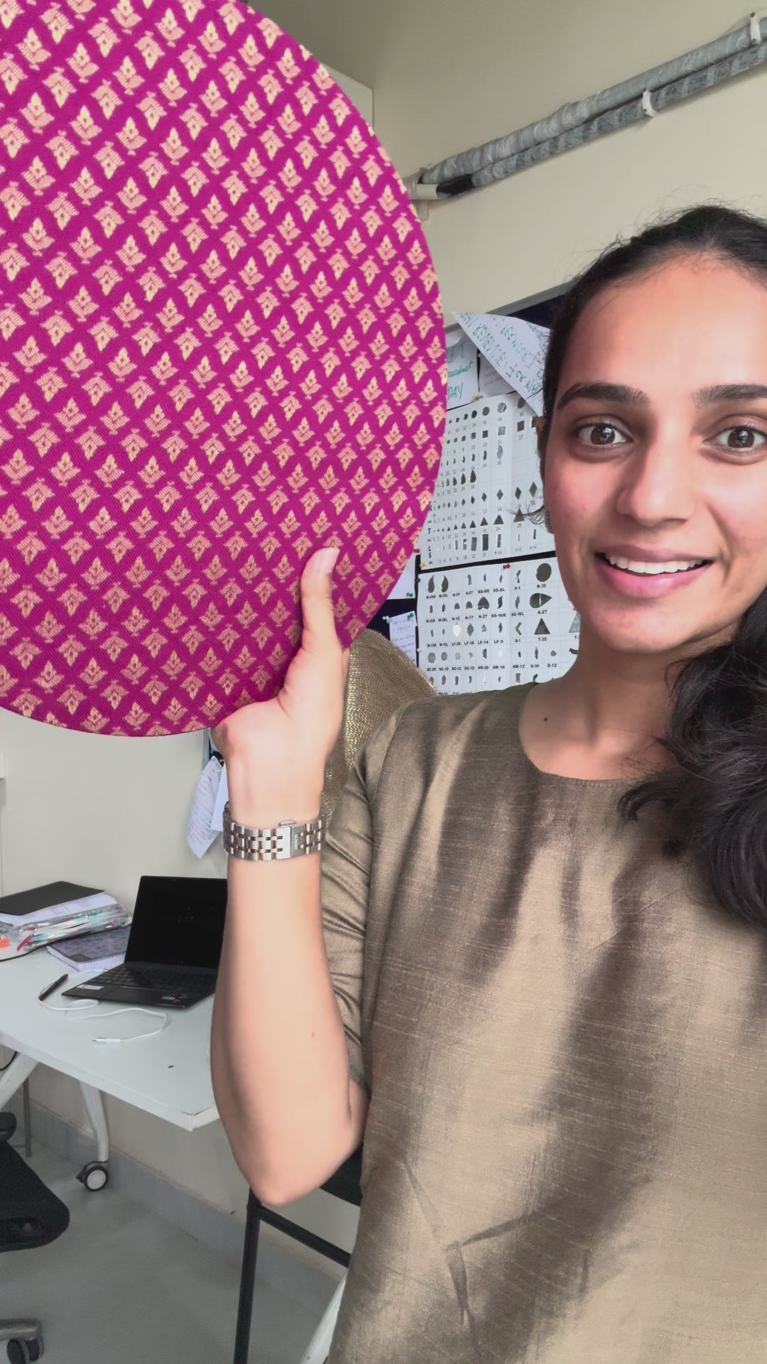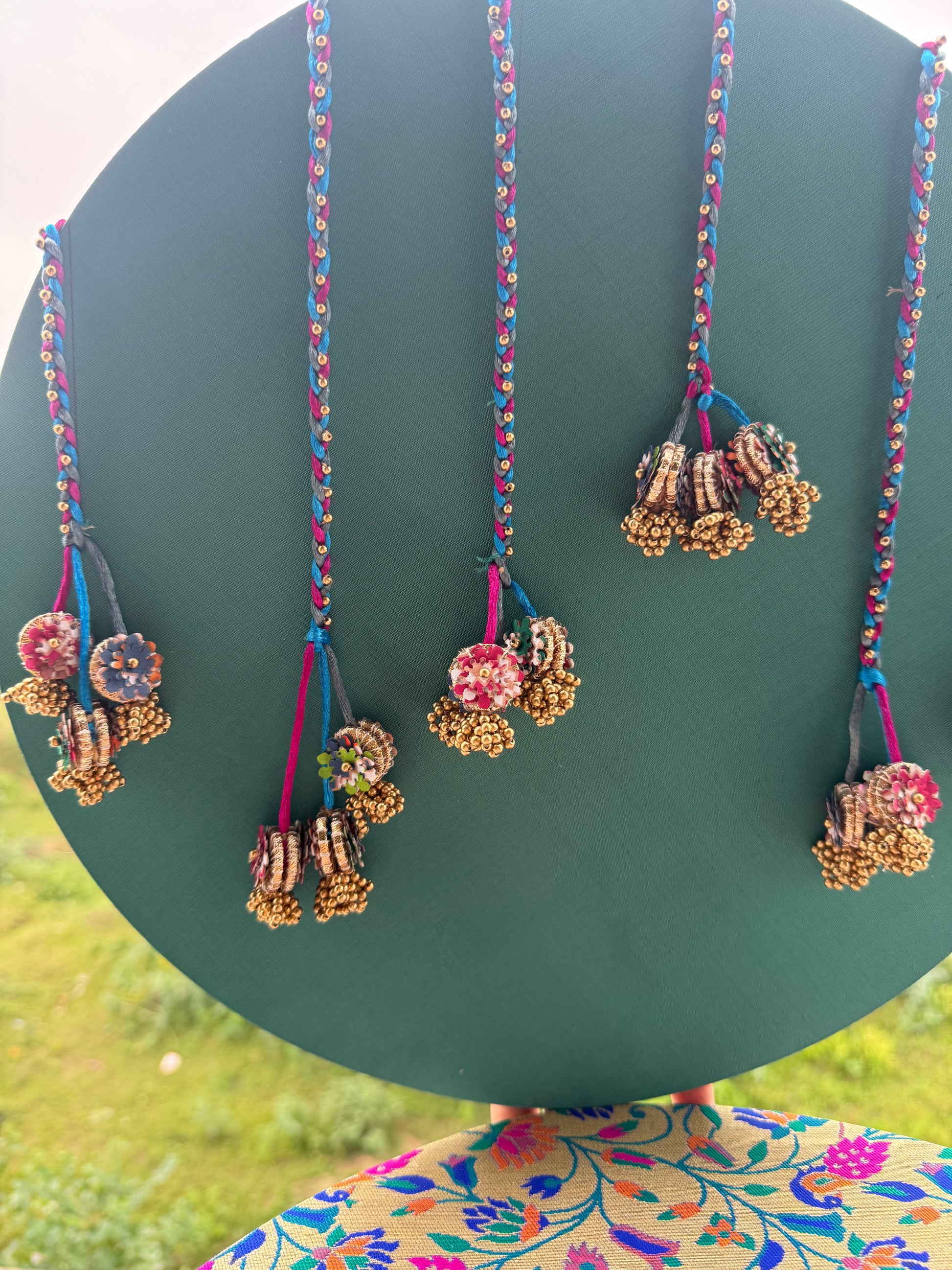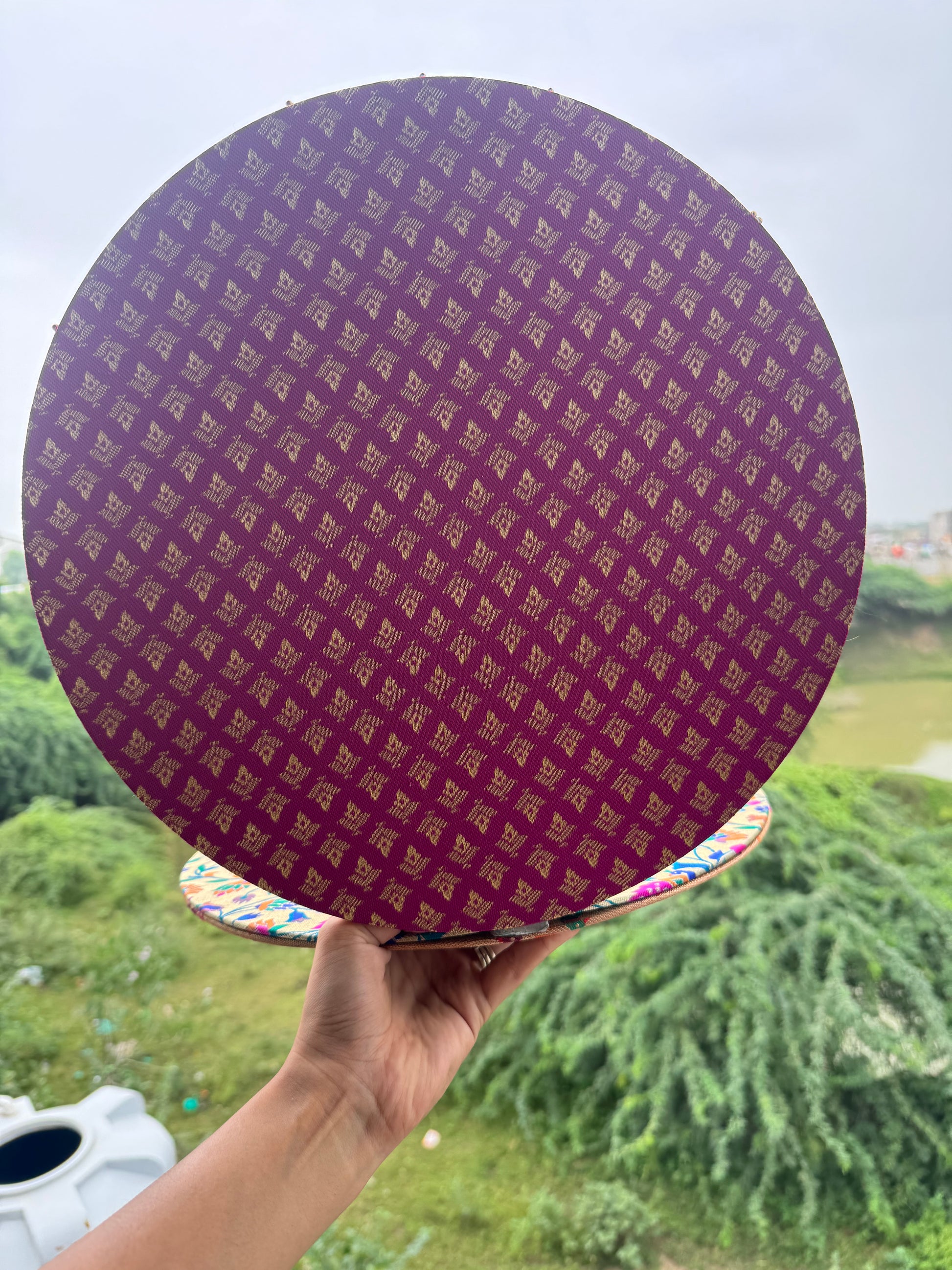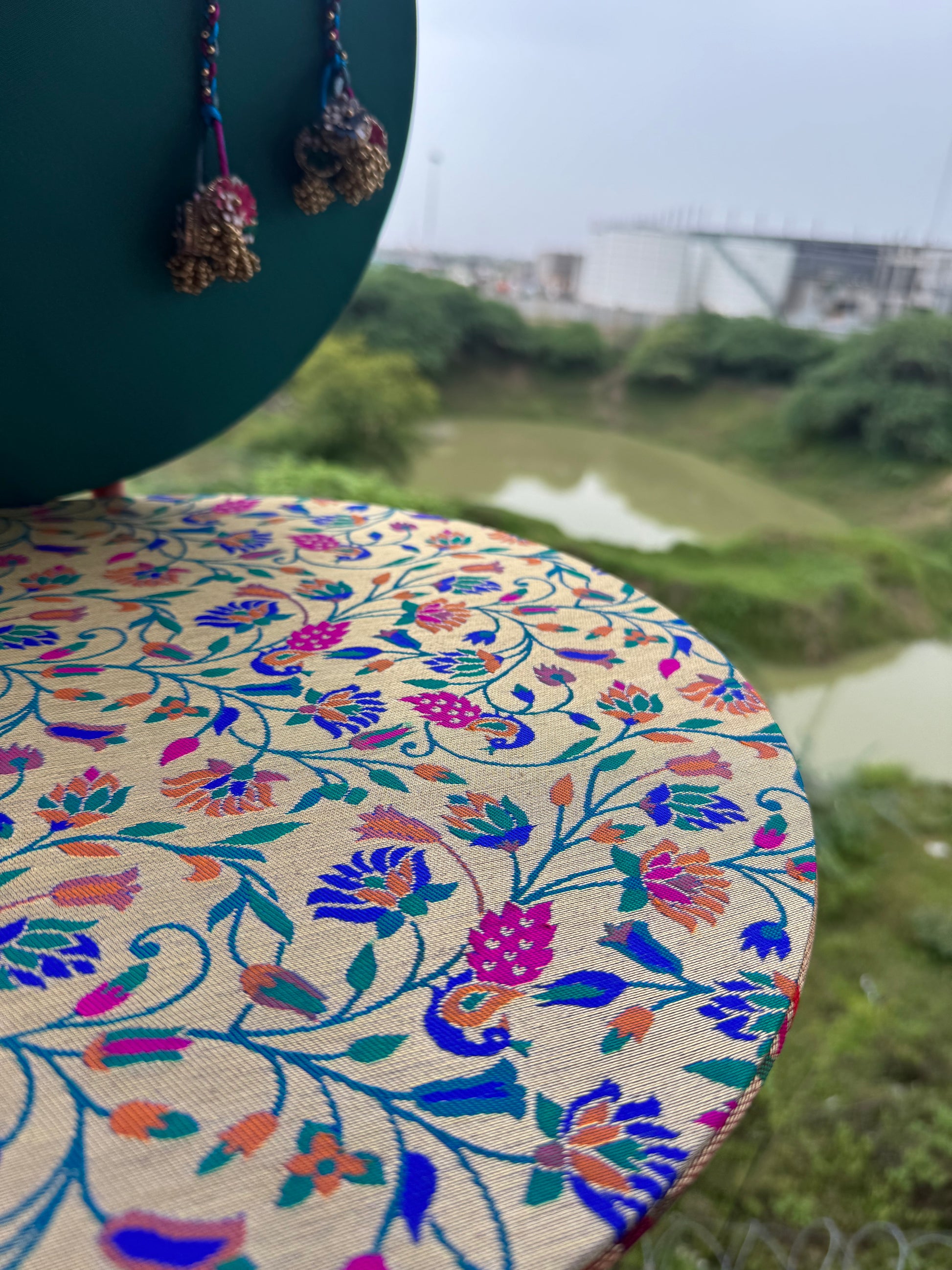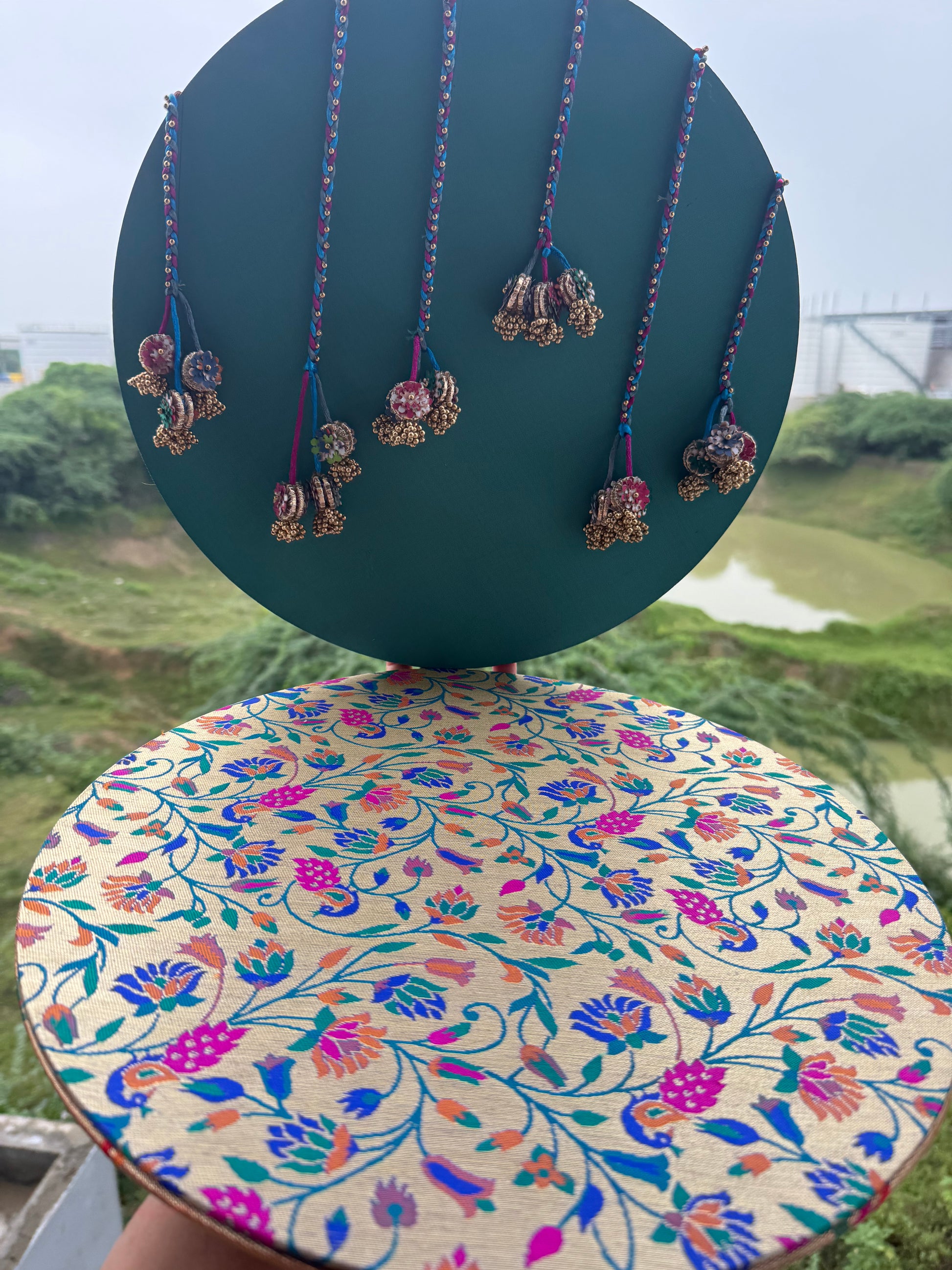 Neelgulabi captures the harmony of oceanic calm and festive vibrance — a unique dual-disc backdrop that blends sea green with rich magenta and Paithani-inspired designs. Each side is thoughtfully crafted to give you four styling moods in one piece, perfect for pooja setups, Ganpati decoration, or wedding corners.