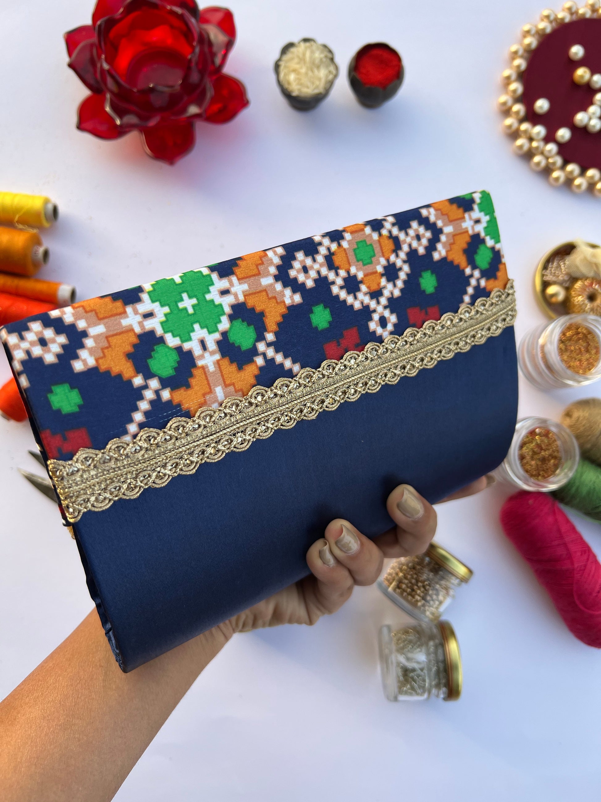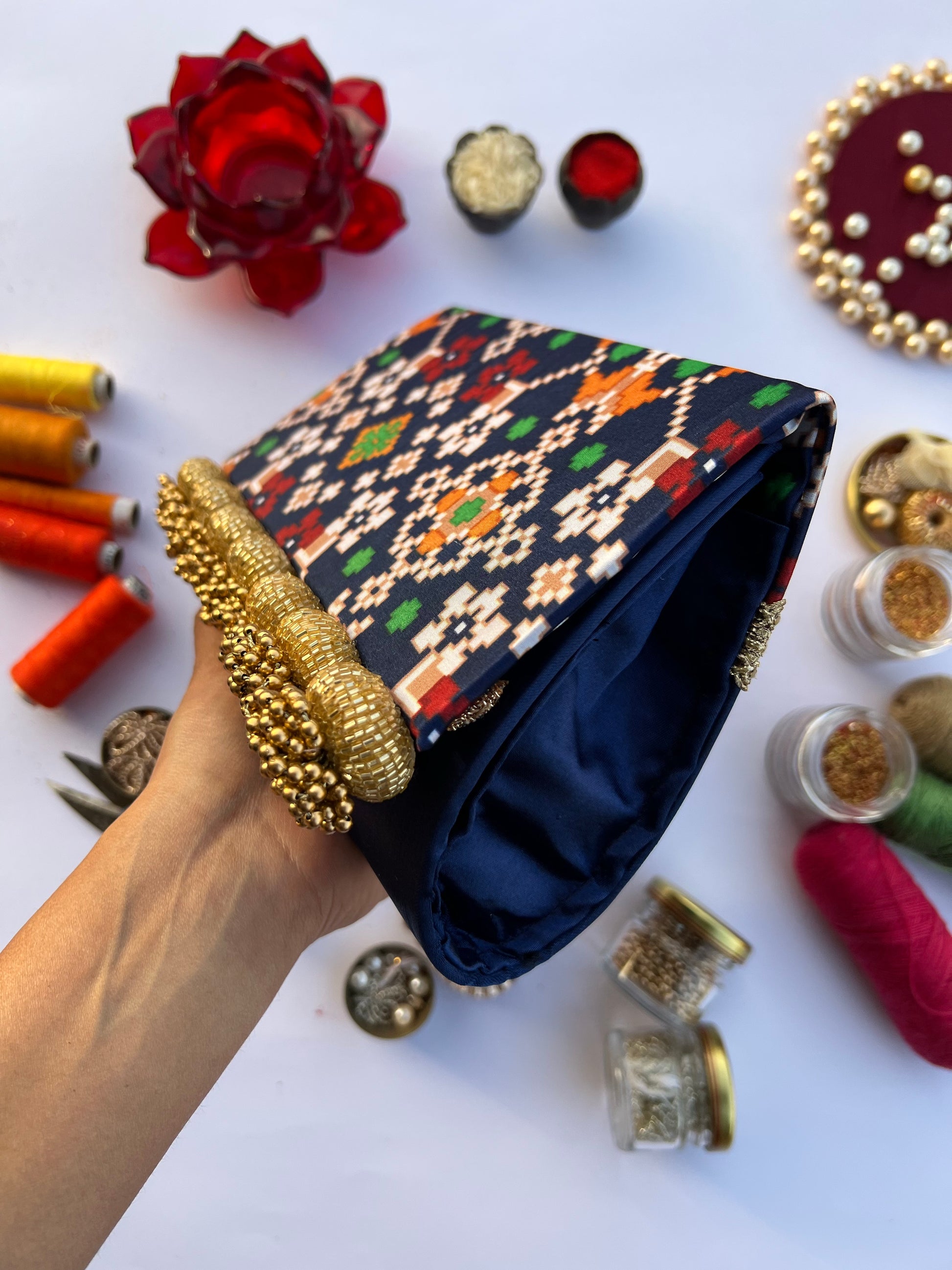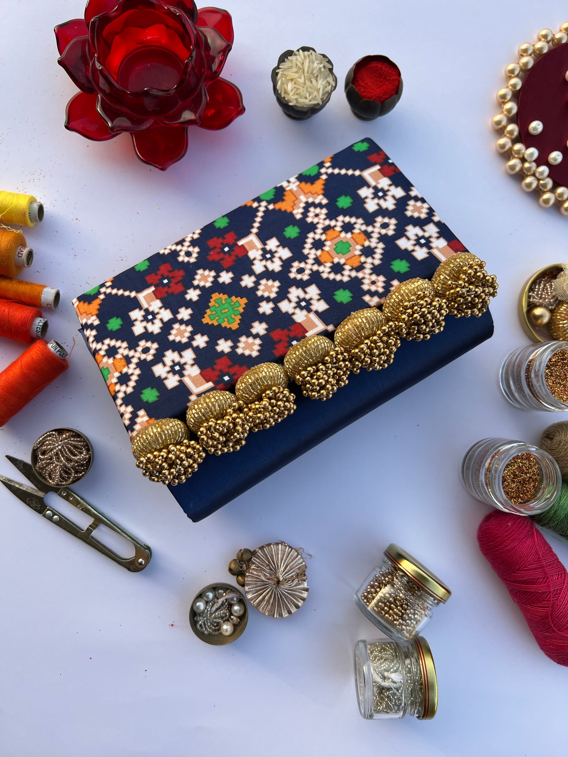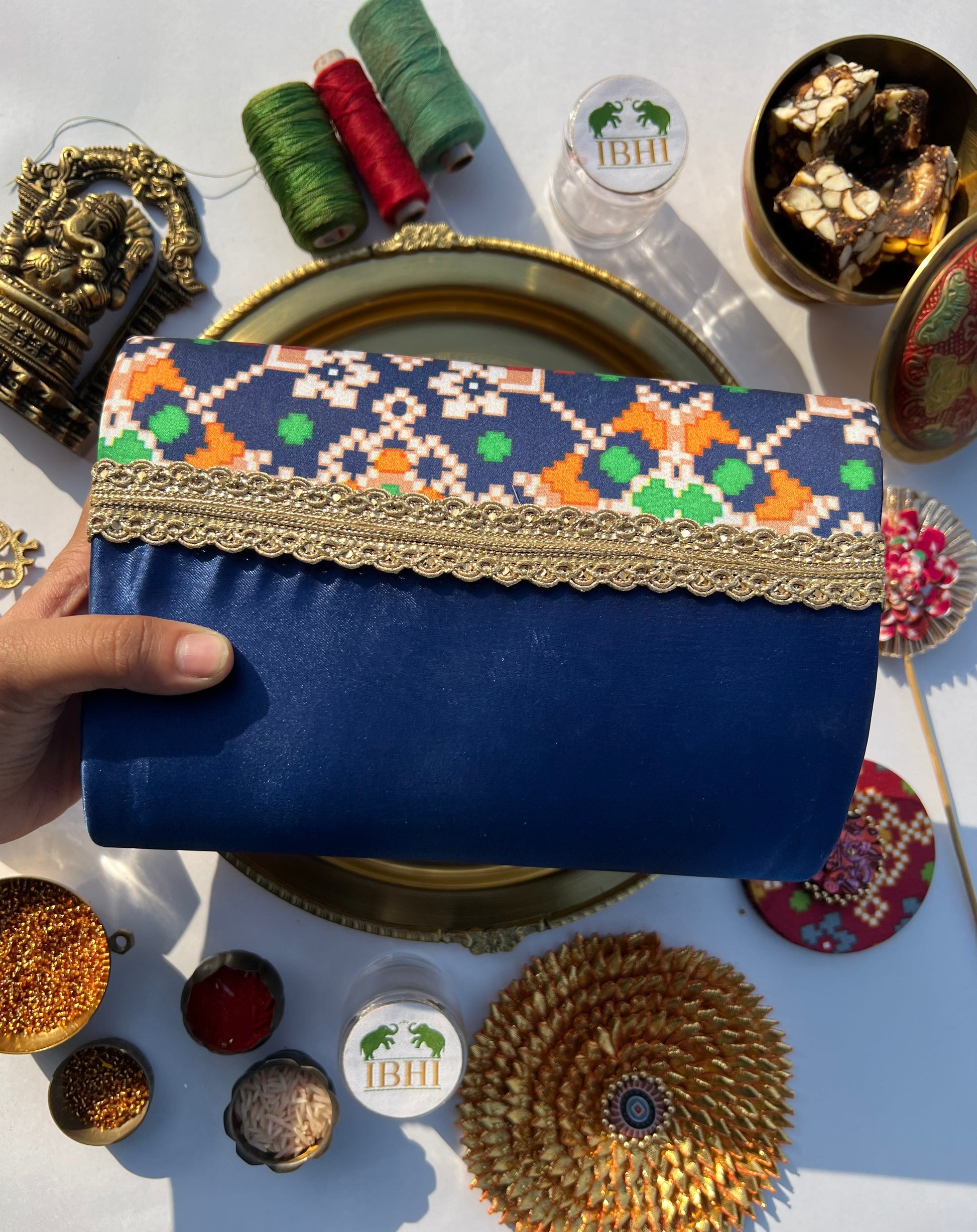 ✨ Heritage Patola Print – This clutch is adorned with a digital print of Navratna Patola, a revered textile art of India. The geometric patterns are accentuated with hues of baby orange, mustard, and beige, set against a deep navy blue base, making it a striking yet elegant accessory.