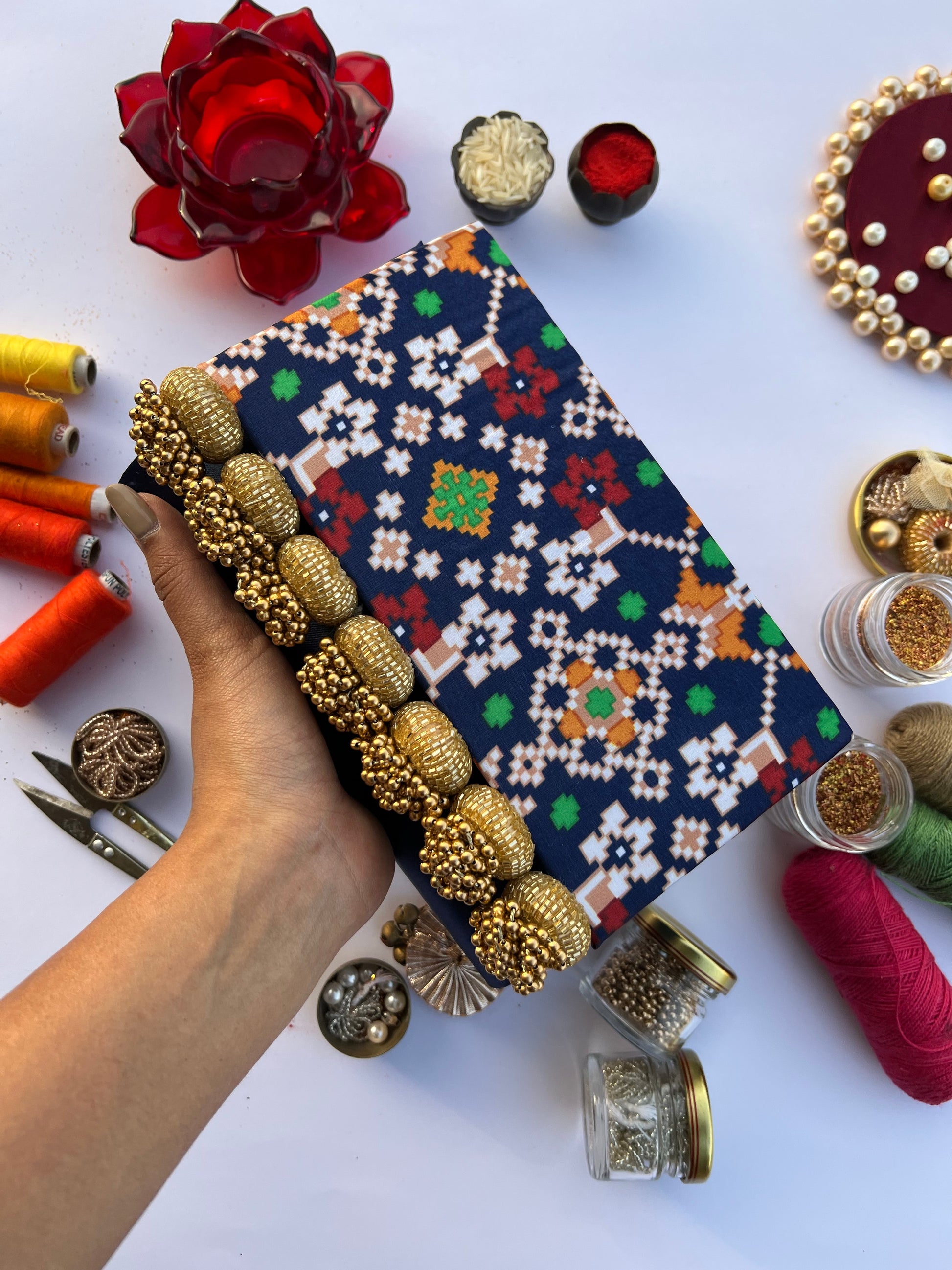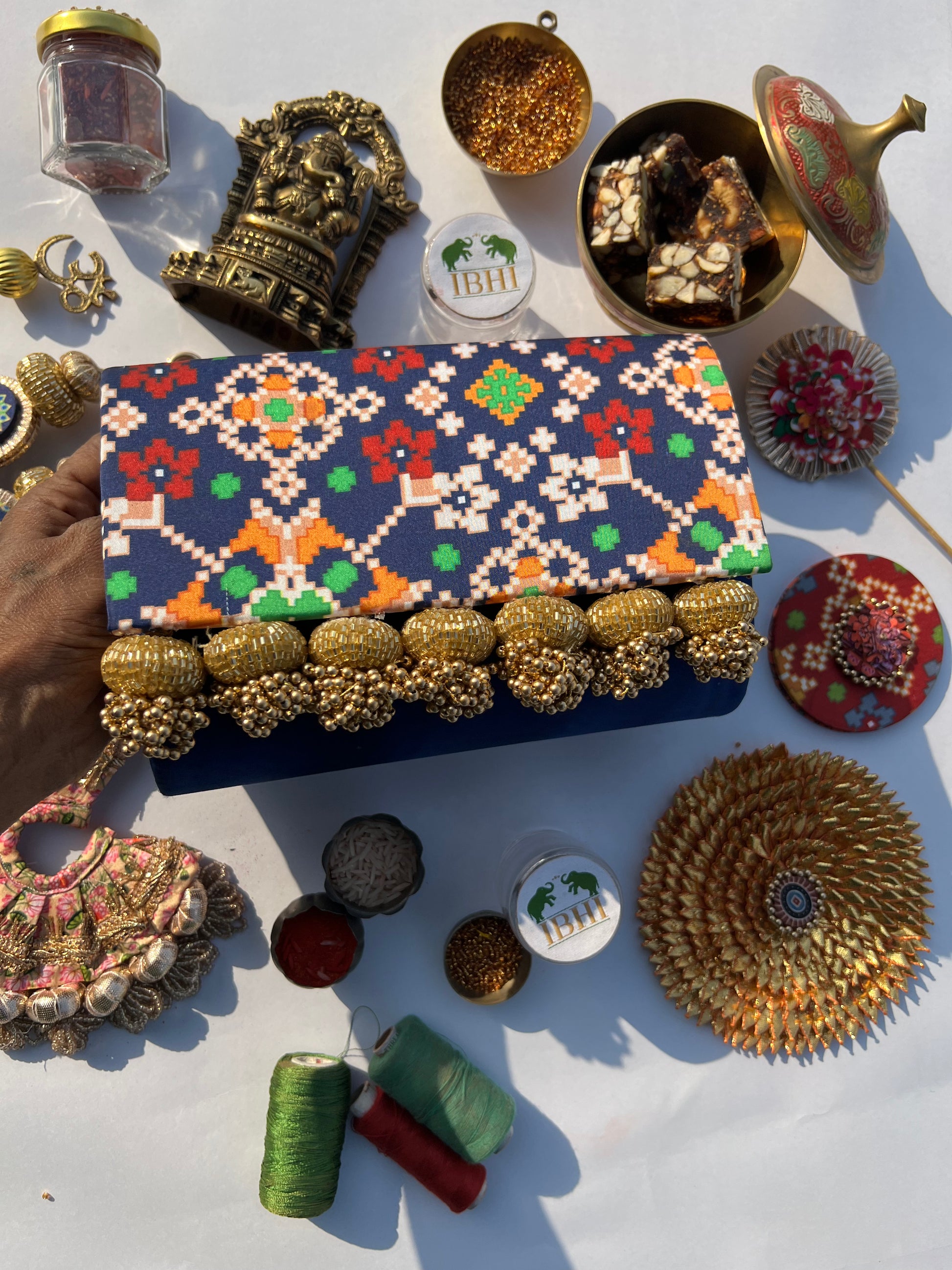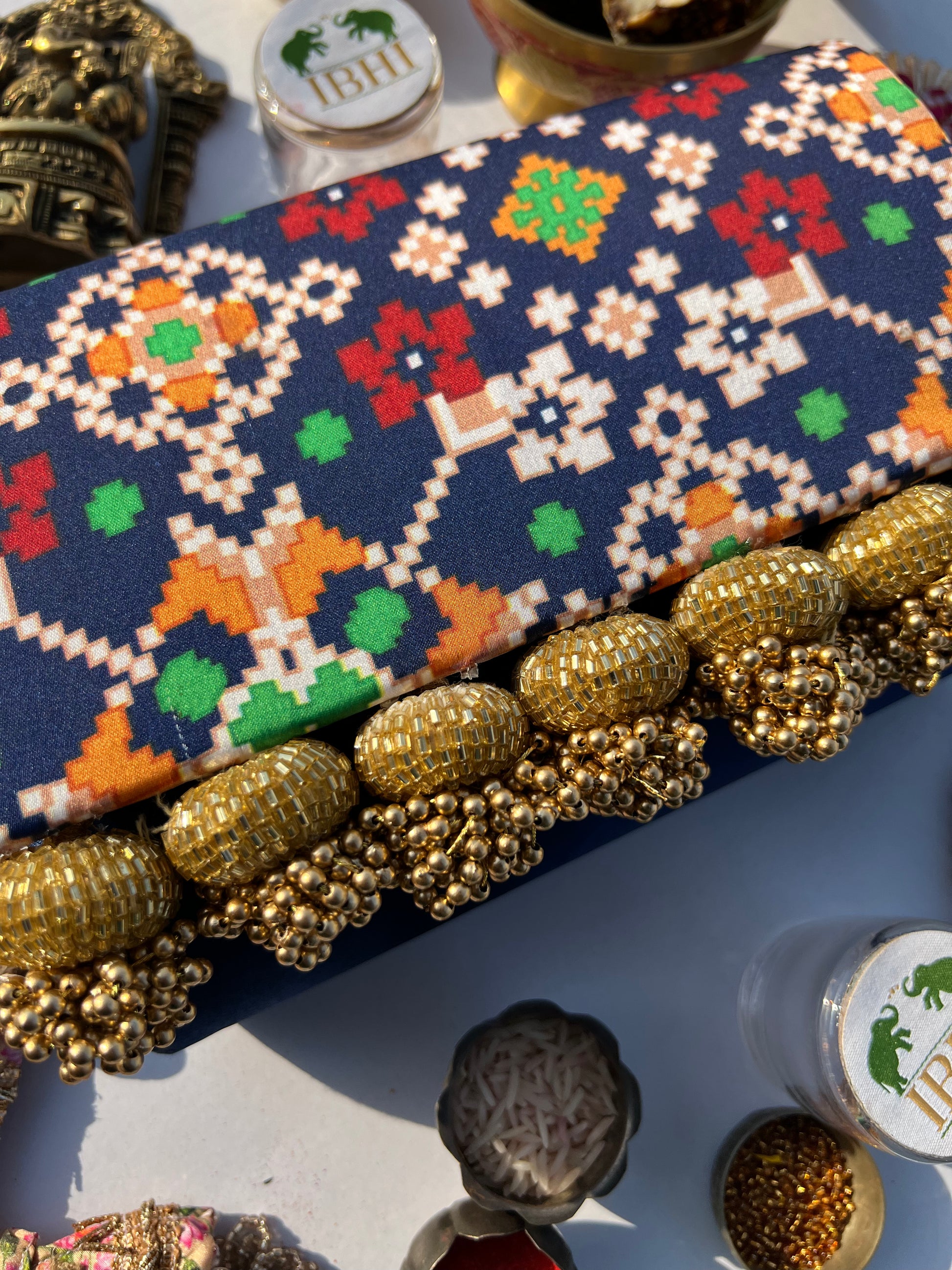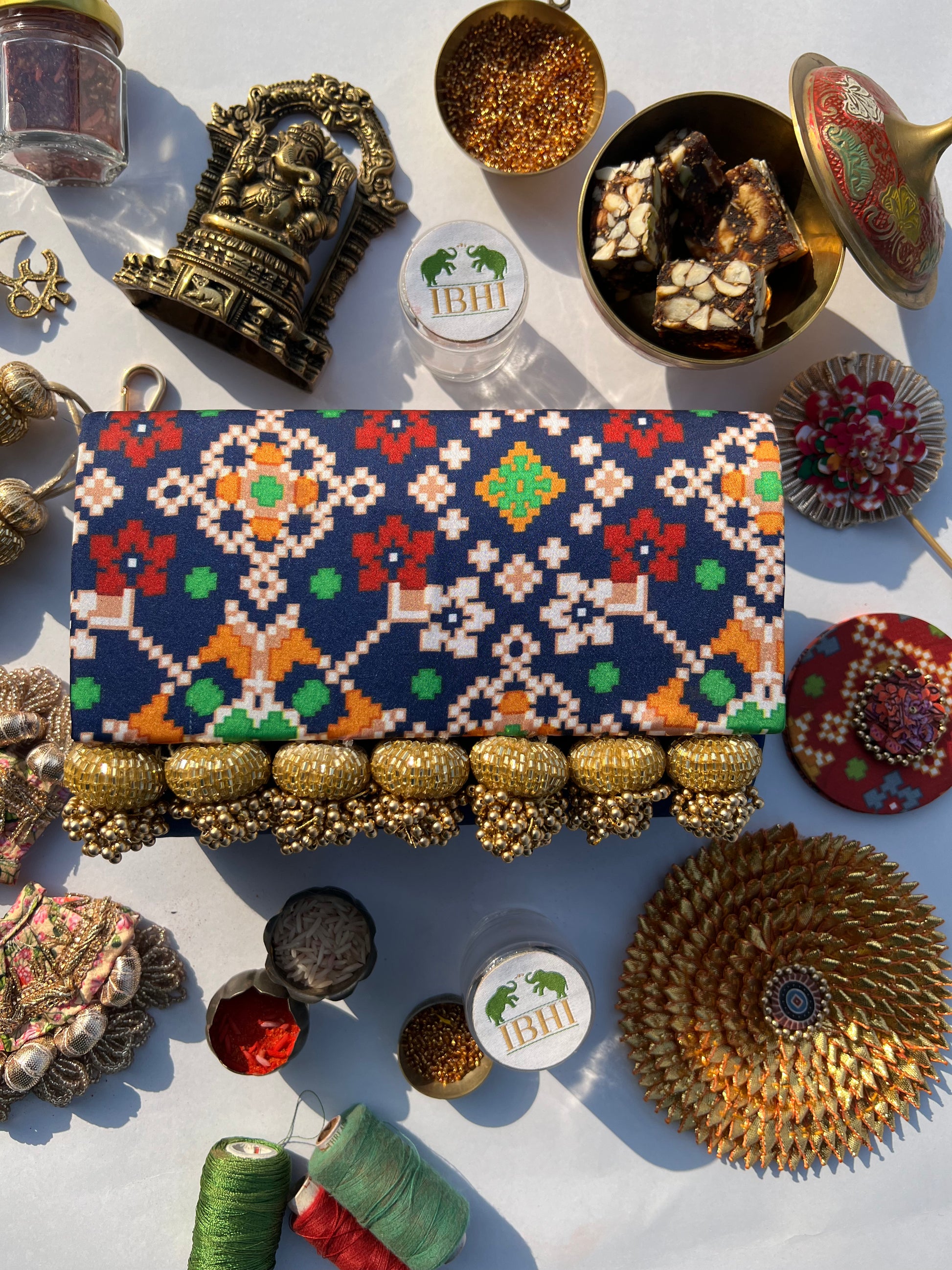 ✨ Heritage Patola Print – This clutch is adorned with a digital print of Navratna Patola, a revered textile art of India. The geometric patterns are accentuated with hues of baby orange, mustard, and beige, set against a deep navy blue base, making it a striking yet elegant accessory.