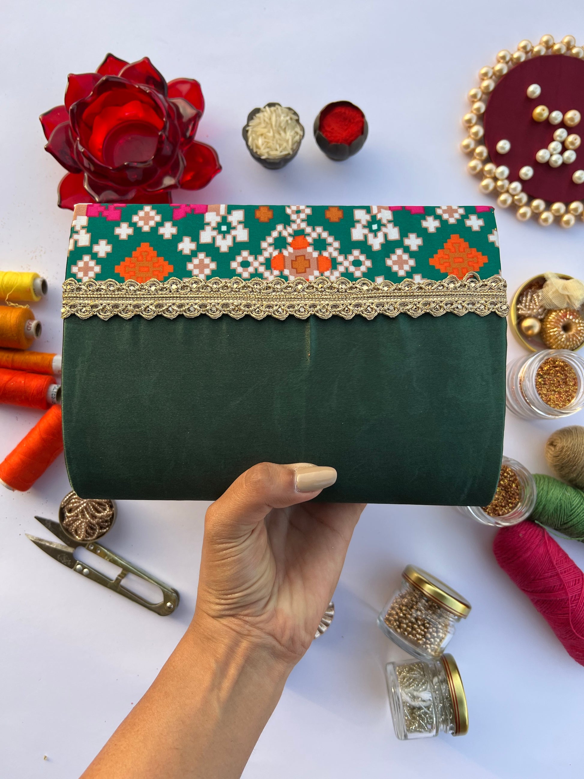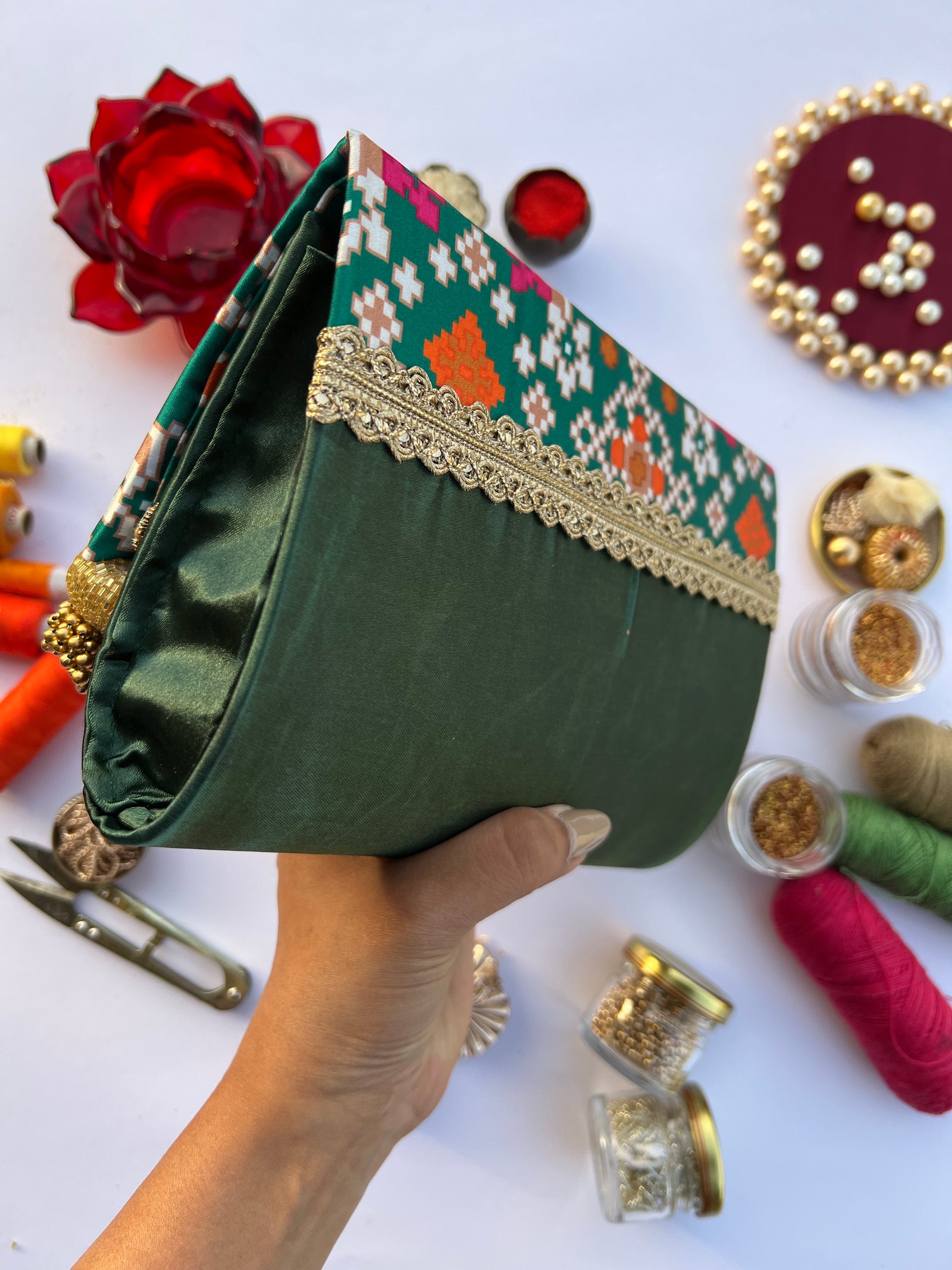 ✨ Heritage Digital Print – Designed using a Navratna Patola digital print, this clutch showcases the timeless beauty of geometric patterns, highlighted with baby orange, mustard, pink, and beige hues against a rich green base.