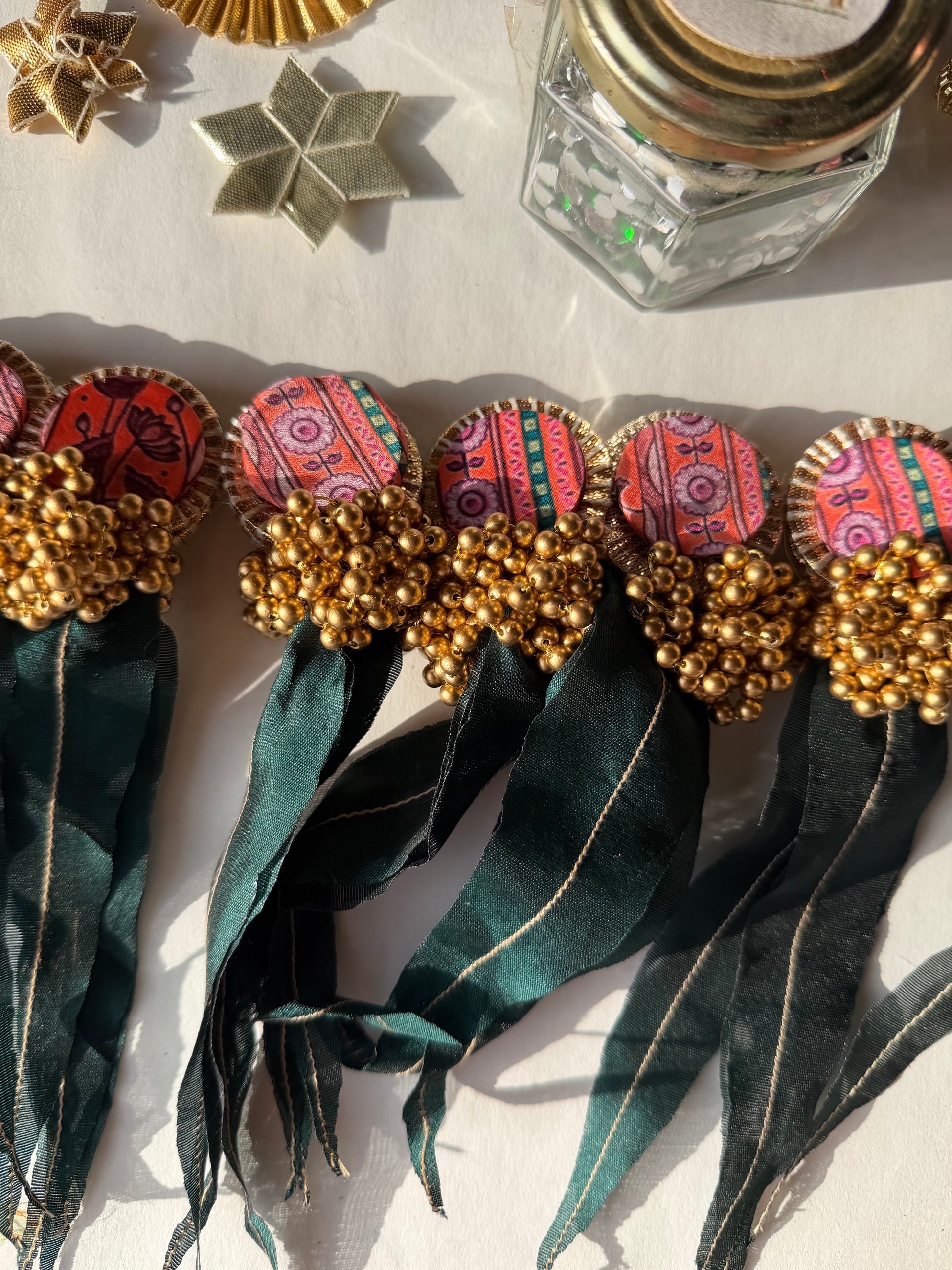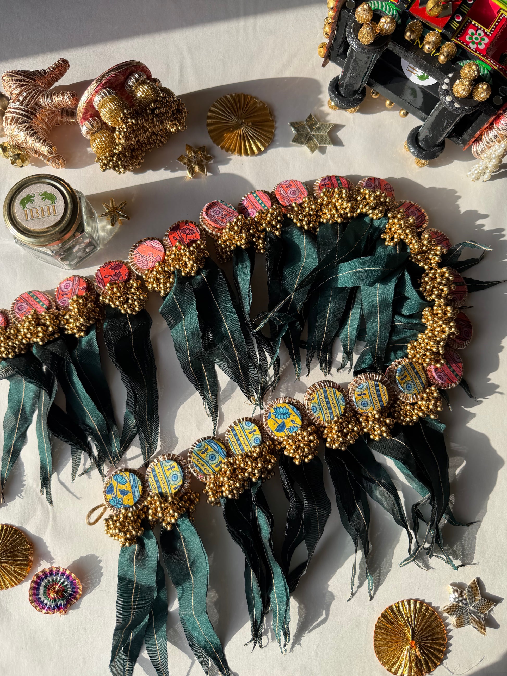 Add festive elegance to your entrance with the Jhumki Asopalav Toran, handcrafted by IBHI artisans. Featuring fabric Asopalav leaves with chikoo thread veins, delicate gota patti discs, and dull golden bead jhumkis, this toran brings a perfect blend of tradition and craftsmanship to your home.