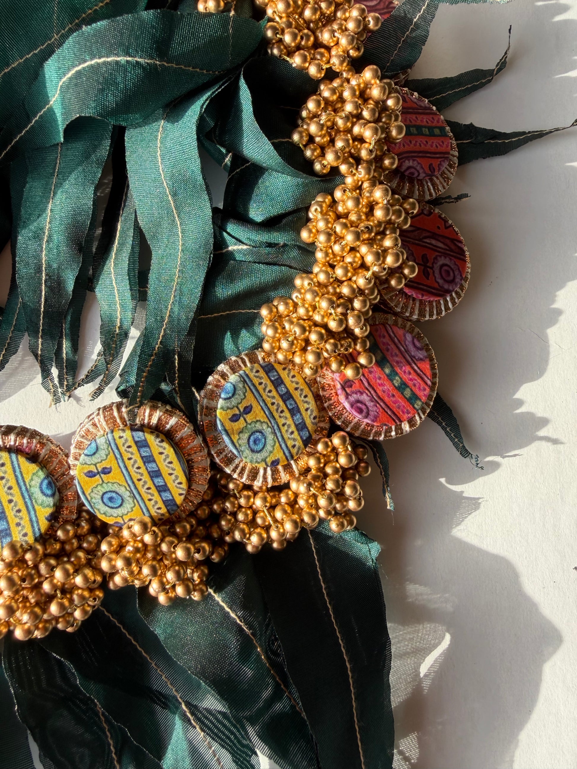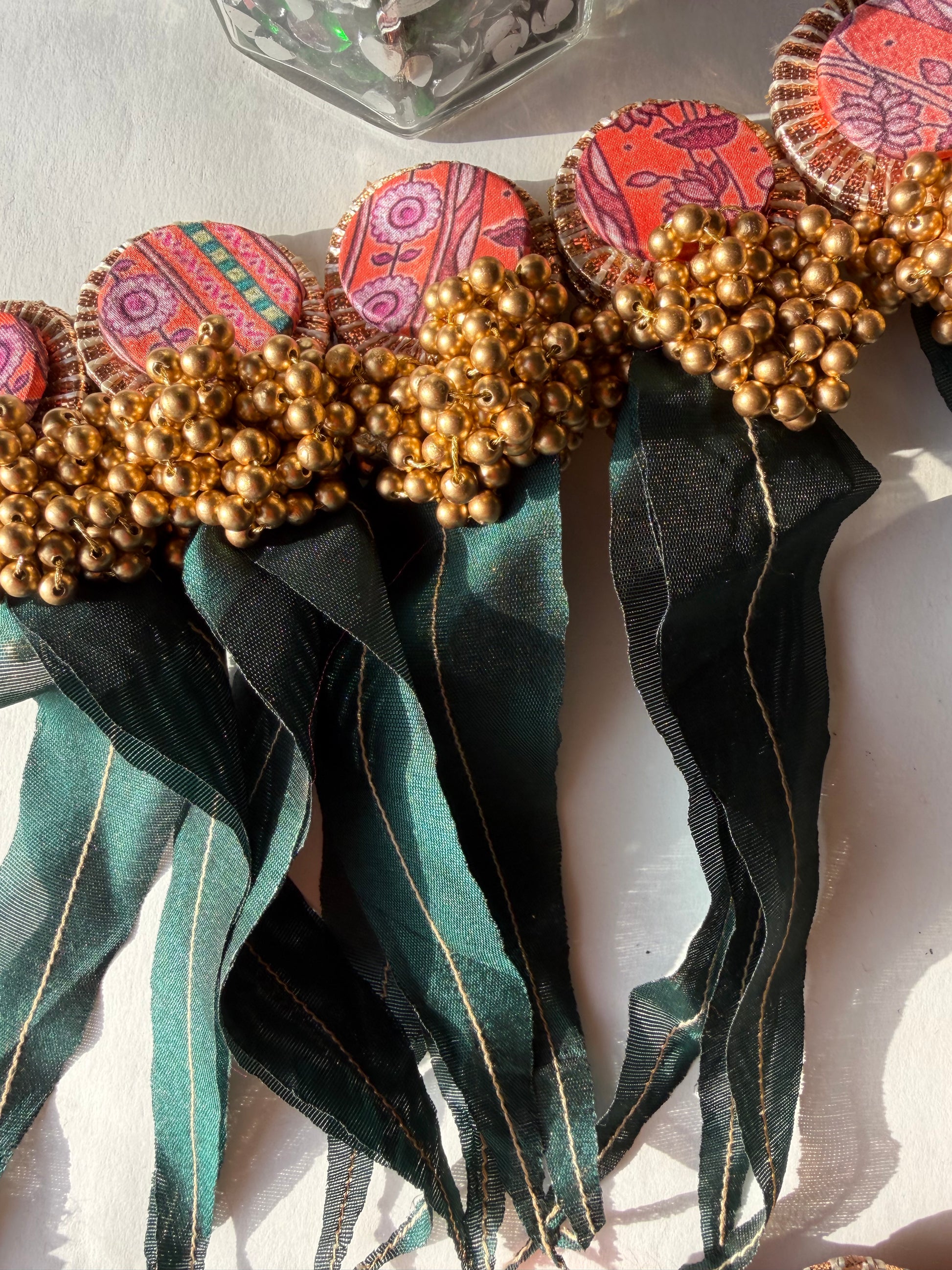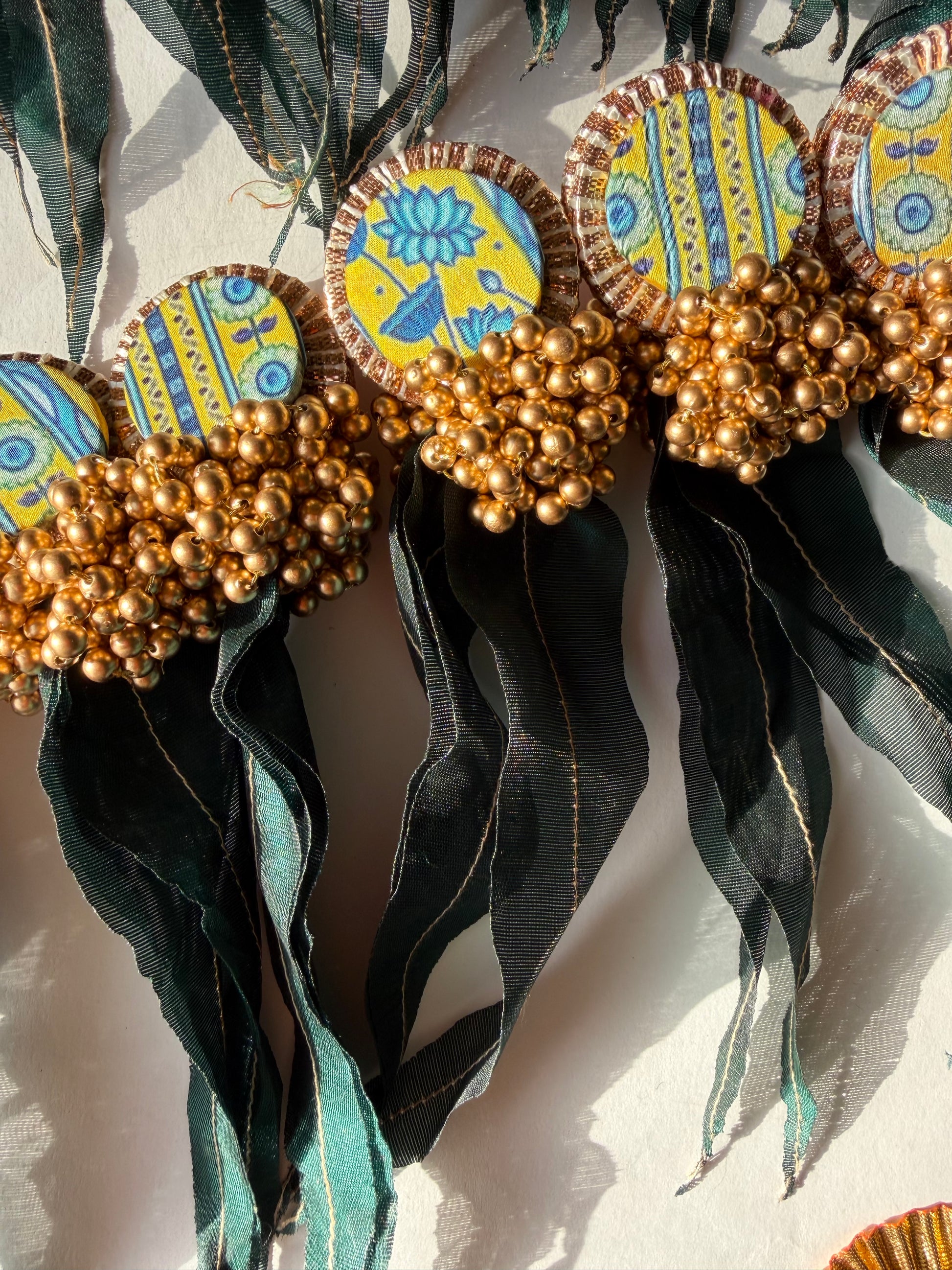 Embellishment: Dull golden bead bunches and fabric emblems inspired by Pichwai art