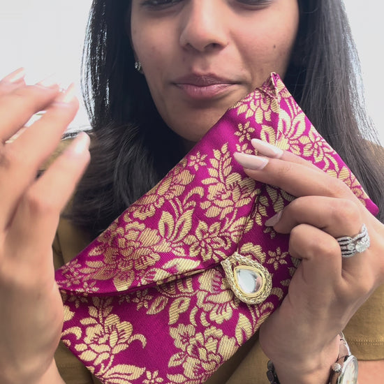 Pushp Kunj Shagun Envelopes by IBHI are crafted in elegant faux Banarasi fabric, inspired by soft floral tones that bring grace and warmth to traditional cash gifting. Designed for refined presentation, these envelopes measure 7.5 inches by 4.5 inches and comfortably fit currency from all major countries. The thread loop closure finished with a kundan teardrop adds a subtle festive highlight, while the same luxurious fabric on the inside ensures a seamless and premium finish. Available in a set of 5, Pushp Kunj envelopes are ideal for weddings, festive gifting, and ceremonial occasions where thoughtful detailing makes all the difference.