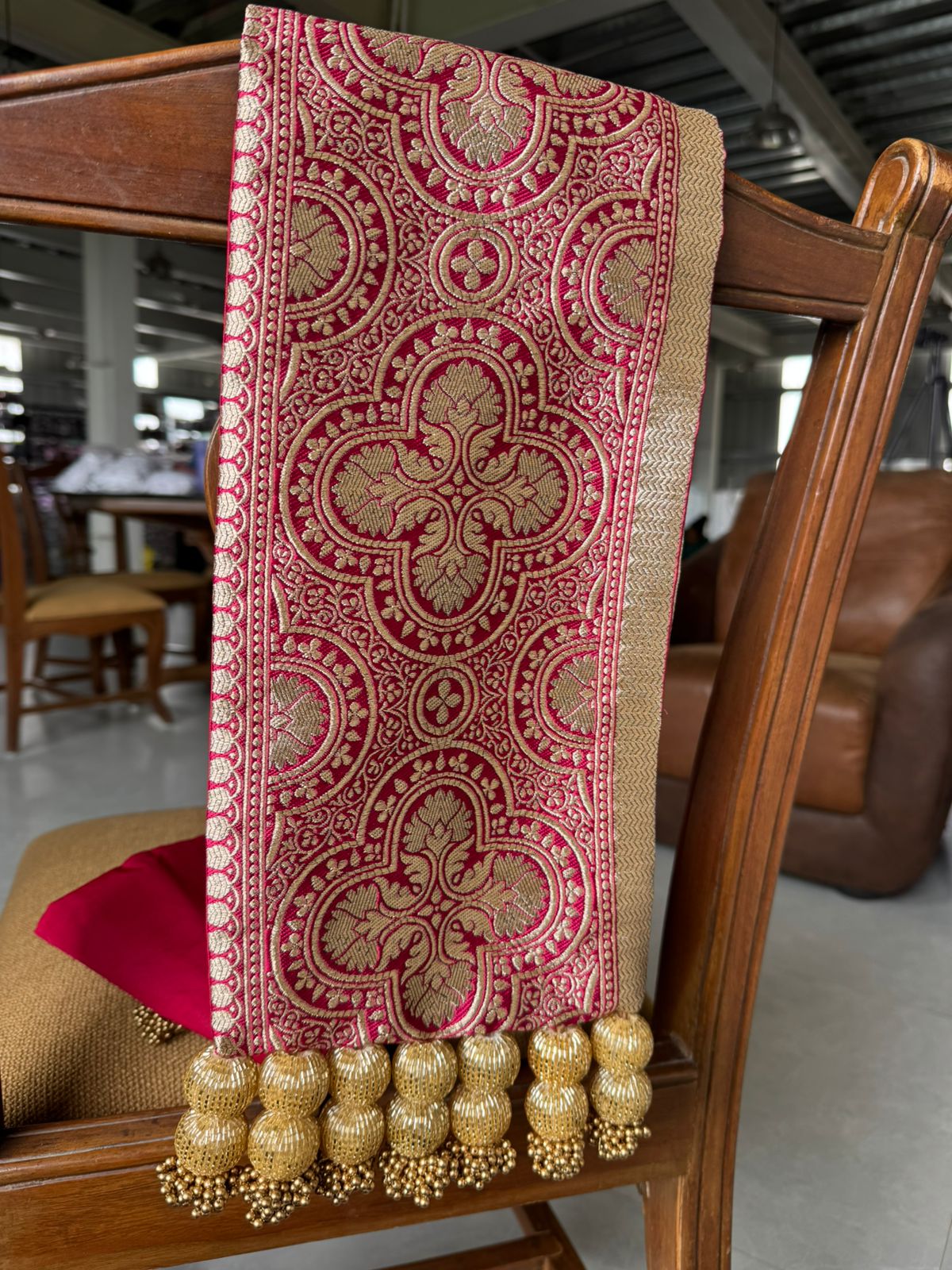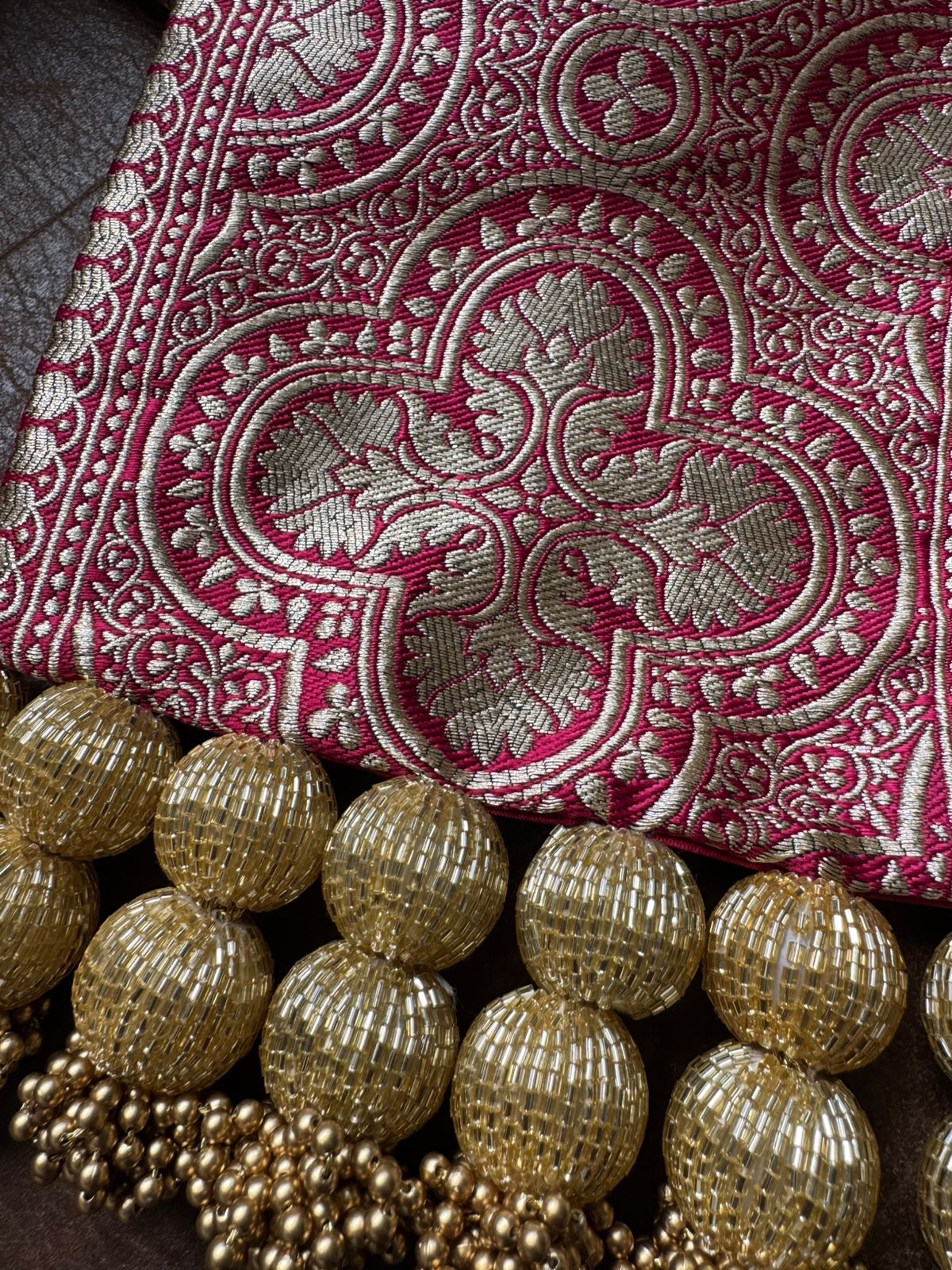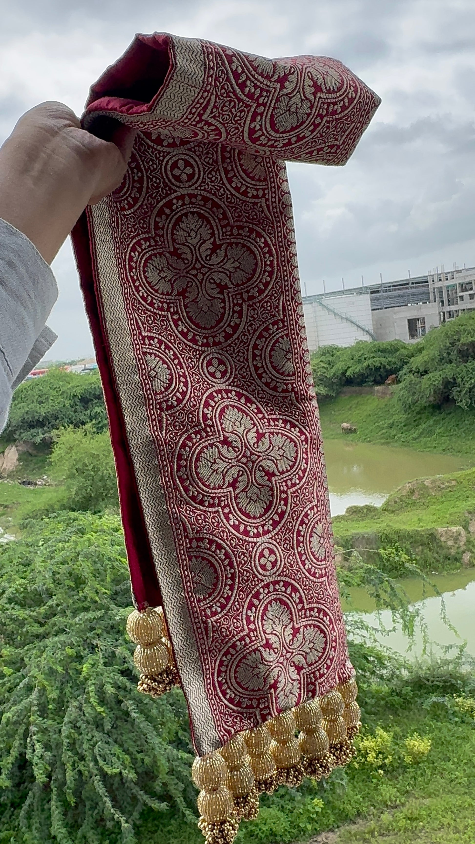 In Banaras, artisans have long woven stories of love and legacy into every thread. Inspired by this heritage, Rangratna brings you a machine-woven Banarasi motif on one side and luxurious Bangalore-silk maroon on the other — each stitch steeped in the age-old celebration of marriage. Hand-stitched glass beads trace these fabrics, catching the light like tiny gems. Mounted on a 160 GSM micro-dot canvas for a structured drape, this khes stands ready to become part of your family’s story.