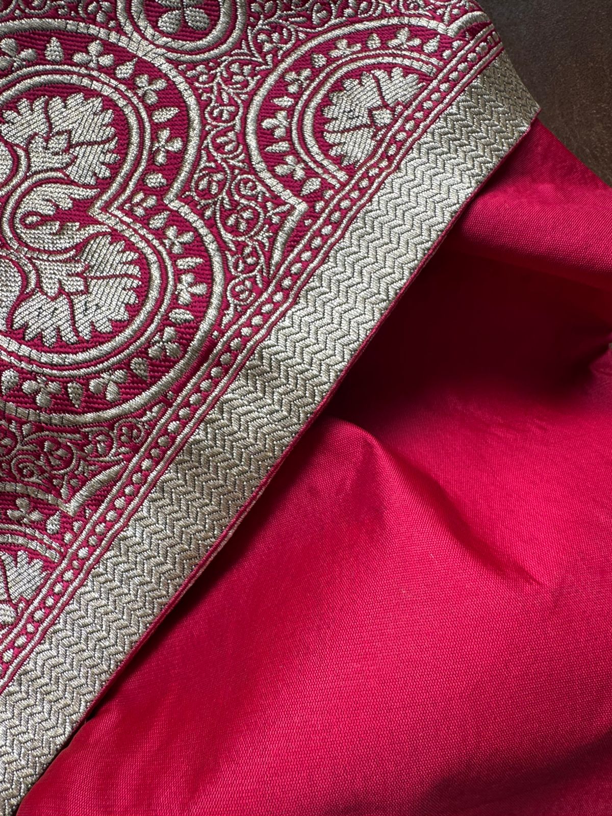 Side A: Machine-woven Banarasi pattern in classic gold and maroon
