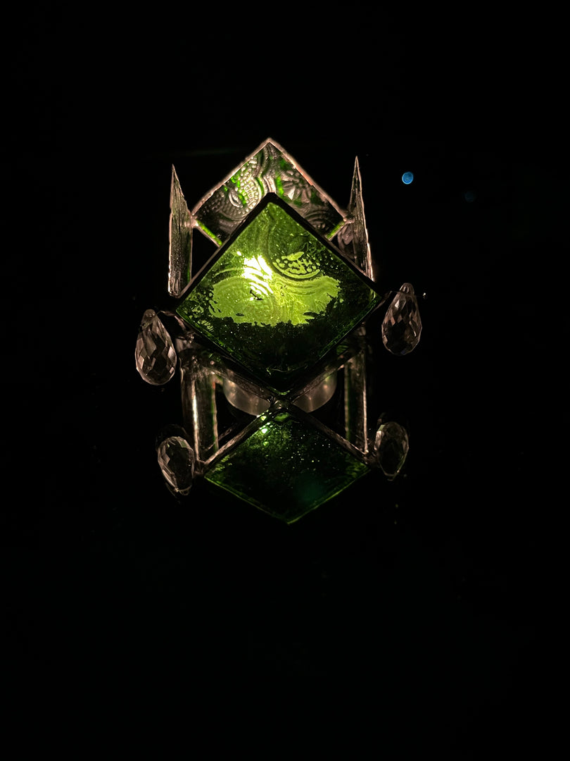 A briolette is a style of gemstone cut - an elongated, faceted pear shape. It is often drilled to hang as a bead. The style was popular during the Victorian era. Fits fine for a standard tea-light candle.