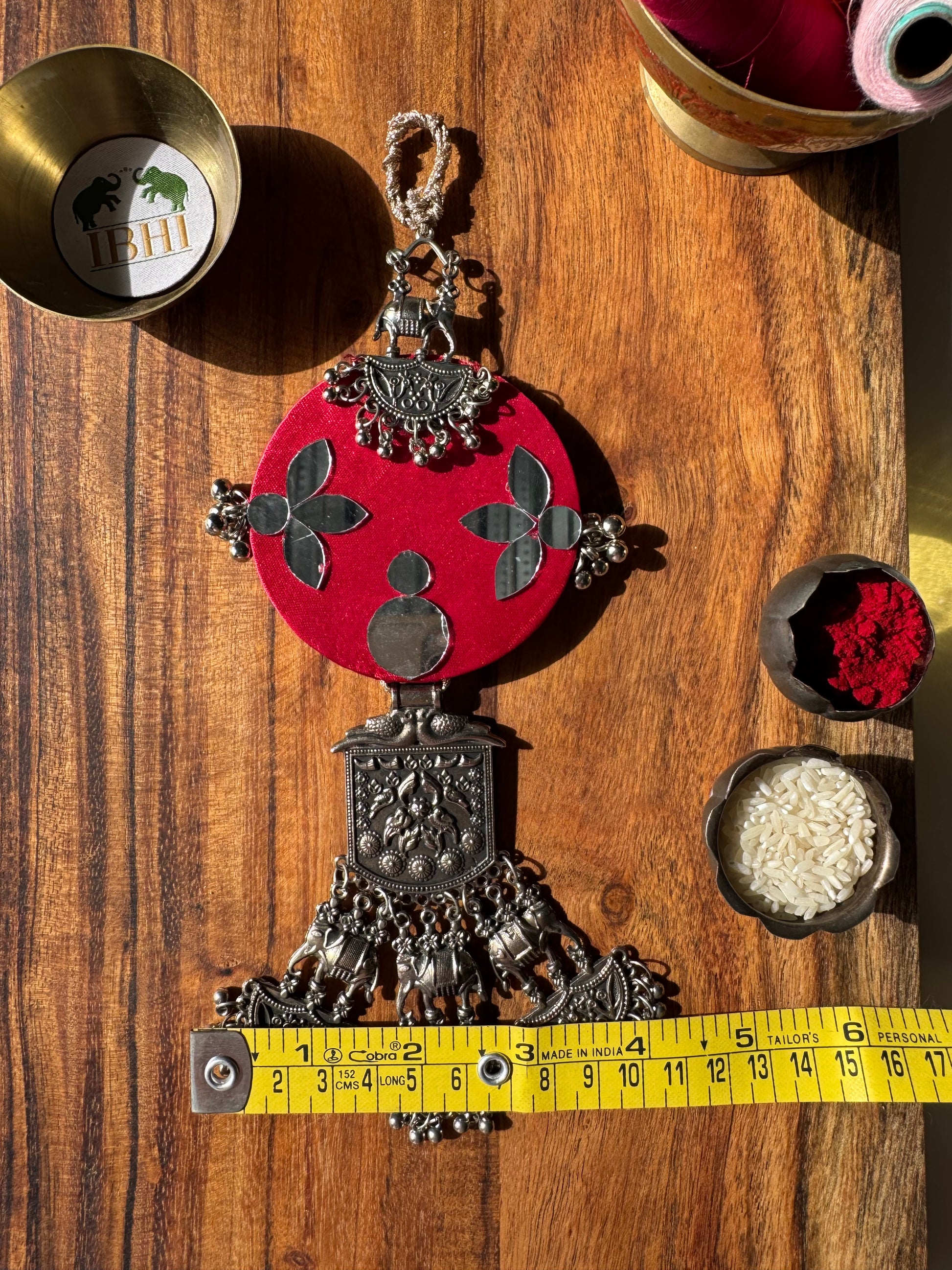 The base features rich silk adorned with hand-stitched mirrors and delicate metal elements, brought together with a kasab thread loop for easy display. Measuring 9 inches in length (including the loop) and 4 inches in width, RoopChandrika brings a gentle, festive glow to small wall spaces, pooja rooms, entryways, or gifting corners.